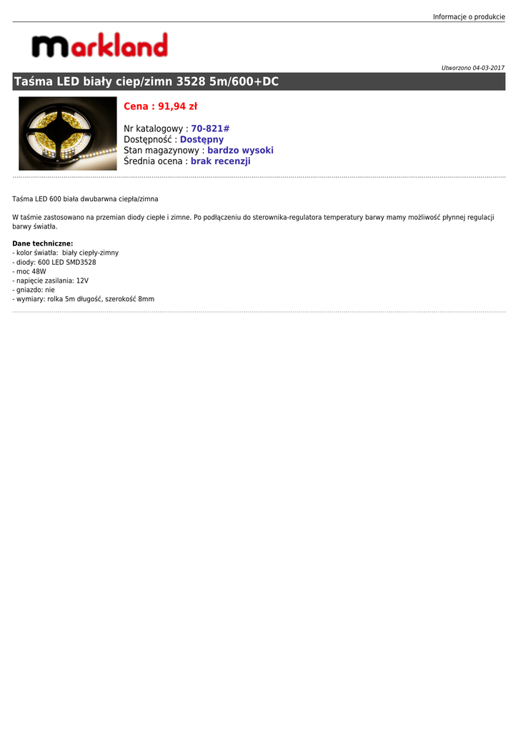 Informacje o produkcie Utworzono 04-03-2017 Taśma LED biały ciep/zimn 3528 5m/600+DC Cena : 91,94 zł Nr katalogowy : 70-821# Dostępność : Dostępny Stan magazynowy : bardzo wysoki Średnia ocena : brak recenzji Taśma LED 600 biała dwubarwna ciepła/zimna W taśmie zastosowano na przemian diody ciepłe i zimne. Po podłączeniu do sterownika-regulatora temperatury barwy mamy możliwość płynnej regulacji barwy światła. Dane techniczne: - kolor światła: biały ciepły-zimny - diody: 600 LED SMD3528 - moc 48W - napięcie zasilania: 12V - gniazdo: nie - wymiary: rolka 5m długość, szerokość 8mm