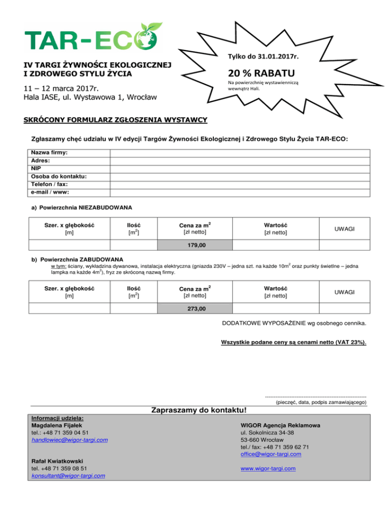 Tylko do 31.01.2017r. IV TARGI śYWNOŚCI EKOLOGICZNEJ I ZDROWEGO STYLU śYCIA 20 % RABATU Na powierzchnię wystawienniczą wewnątrz Hali. 11 – 12 marca 2017r. Hala IASE, ul. Wystawowa 1, Wrocław SKRÓCONY FORMULARZ ZGŁOSZENIA WYSTAWCY Zgłaszamy chęć udziału w IV edycji Targów śywności Ekologicznej i Zdrowego Stylu śycia TAR-ECO: Nazwa firmy: Adres: NIP Osoba do kontaktu: Telefon / fax: e-mail / www: a) Powierzchnia NIEZABUDOWANA Szer. x głębokość [m] Ilość 2 [m ] Cena za m [zł netto] 2 Wartość [zł netto] UWAGI 179,00 b) Powierzchnia ZABUDOWANA w tym: ściany, wykładzina dywanowa, instalacja elektryczna (gniazda 230V – jedna szt. na kaŜde 10m2 oraz punkty świetlne – jedna lampka na kaŜde 4m2), fryz ze skróconą nazwą firmy. Szer. x głębokość [m] Ilość 2 [m ] Cena za m [zł netto] 2 Wartość [zł netto] UWAGI 273,00 DODATKOWE WYPOSAśENIE wg osobnego cennika. Wszystkie podane ceny są cenami netto (VAT 23%). ---------------------------------------------------------(pieczęć, data, podpis zamawiającego) Zapraszamy do kontaktu! Informacji udziela: Magdalena Fijałek tel.: +48 71 359 04 51 [email protected] Rafał Kwiatkowski tel. +48 71 359 08 51 [email protected] WIGOR Agencja Reklamowa ul. Sokolnicza 34-38 53-660 Wrocław tel./ fax: +48 71 359 62 71 [email protected] www.wigor-targi.com