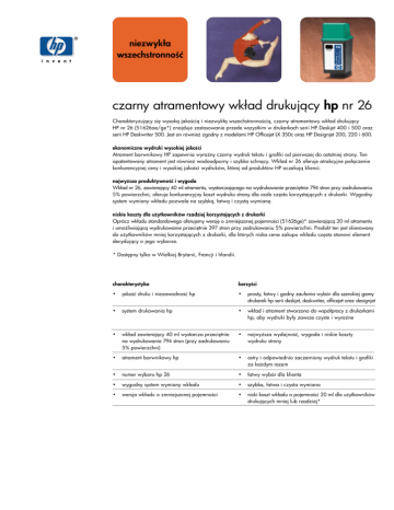 niezwykła wszechstronnoć czarny atramentowy wkład drukuj#cy hp nr 26 Charakteryzuj#cy si& wysok# jakoci# i niezwykł# wszechstronnoci#, czarny atramentowy wkład drukuj#cy HP nr 26 (51626ae/ge*) znajduje zastosowanie przede wszystkim w drukarkach serii HP Deskjet 400 i 500 oraz serii HP Deskwriter 500. Jest on równie zgodny z modelami HP Officejet LX 350c oraz HP Designjet 200, 220 i 600. ekonomiczne wydruki wysokiej jakoci Atrament barwnikowy HP zapewnia wyrany czarny wydruk tekstu i grafiki od pierwszej do ostatniej strony. Ten opatentowany atrament jest równie wodoodporny i szybko schn#cy. Wkład nr 26 oferuje atrakcyjne poł#czenie konkurencyjnej ceny i wysokiej jakoci wydruków, której od produktów HP oczekuj# klienci. najwysza produktywnoć i wygoda Wkład nr 26, zawieraj#cy 40 ml atramentu, wystarczaj#cego na wydrukowanie przeci&tnie 794 stron przy zadrukowaniu 5% powierzchni, oferuje konkurencyjny koszt wydruku strony dla osób cz&sto korzystaj#cych z drukarki. Wygodny system wymiany wkładu pozwala na szybk#, łatw# i czyst# wymian&. niskie koszty dla uytkowników rzadziej korzystajcych z drukarki Oprócz wkładu standardowego oferujemy wersj& o zmniejszonej pojemnoci (51626ge)* zawieraj#c# 20 ml atramentu i umoliwiaj#c# wydrukowanie przeci&tnie 397 stron przy zadrukowaniu 5% powierzchni. Produkt ten jest skierowany do uytkowników mniej korzystaj#cych z drukarki, dla których niska cena zakupu wkładu cz&sto stanowi element decyduj#cy o jego wyborze. * Dost&pny tylko w Wielkiej Brytanii, Francji i Irlandii. charakterystyka korzyci • jakoć druku i niezawodnoć hp • prosty, łatwy i godny zaufania wybór dla szerokiej gamy drukarek hp serii deskjet, deskwriter, officejet oraz designjet • system drukowania hp • wkład i atrament stworzono do współpracy z drukarkami hp, aby wydruki były zawsze czyste i wyrane • wkład zawieraj#cy 40 ml wystarcza przeci&tnie na wydrukowanie 794 stron (przy zadrukowaniu 5% powierzchni) • najwysza wydajnoć, wygoda i niskie koszty wydruku strony • atrament barwnikowy hp • ostry i odpowiednio zaczerniony wydruk tekstu i grafiki za kadym razem • numer wyboru hp 26 • łatwy wybór dla klienta • wygodny system wymiany wkładu • szybka, łatwa i czysta wymiana • wersja wkładu o zmniejszonej pojemnoci • niski koszt wkładu o pojemnoci 20 ml dla uytkowników drukuj#cych mniej lub rzadziej* czarny atramentowy wkład drukuj#cy hp nr 26 czsto zadawane pytania w których modelach drukarek mona stosować czarny wkład atramentowy nr 26? Czarny atramentowy wkład drukuj#cy nr 26 stworzono do współpracy z drukarkami serii HP Deskjet 400 i 500 oraz serii HP Deskwriter 500. Jest on równie zgodny z modelami HP Officejet LX 350c oraz HP Designjet 200, 220 i 600. Wkład ten zaprojektowano tak, aby w poł#czeniu z papierem i foliami HP zawsze dawał czyste i wyrane wydruki. ile stron mona wydrukować uywajc wkładu nr 26? Dokładna wydajnoć wkładu zaley od iloci atramentu zuytego przy wydruku poszczególnych stron. Przeci&tnie wkład ten umoliwia wydrukowanie 794 stron przy zadrukowaniu 5% powierzchni. jakie s główne zastosowania atramentowego wkładu drukujcego nr 26? Poniewa wkład ten jest zgodny z tak szerok# gam# drukarek HP, lista jego zastosowaC jest niemal nieograniczona. Typowym zastosowaniem w biurach b&dzie korespondencja, wydruk raportów i prezentacji, podczas gdy uytkownicy domowi mog# drukować doskonałej jakoci gazetki, prace przeznaczone do szkoły, listy oraz wiele innych materiałów. dane techniczne atramentowego wkładu drukujcego hp num. kat. czarny atramentowy wkład drukujcy hp nr 26 51626ae czarny atramentowy wkład drukujcy hp nr 26 51626ge numer wyboru hp 26 26 opis czarny atramentowy wkład drukuj#cy hp czarny atramentowy wkład drukuj#cy hp pojemnoć wkładu 40 ml 20 ml wydajnoć (przecitna) 794 stron (przy zadrukowaniu 5% powierzchni) 397 stron (przy zadrukowaniu 5% powierzchni) liczba dysz 50 50 rozdzielczoć druku 600 x 300 dpi 600 x 300 dpi wymiary (długoć x szerokoć x głbokoć) 141 x 117 x 37 mm 141 x 117 x 37 mm masa 94 g 78 g ©2001 Hewlett-Packard Wydrukowano w Holandii 08/01 5980-8096 PL