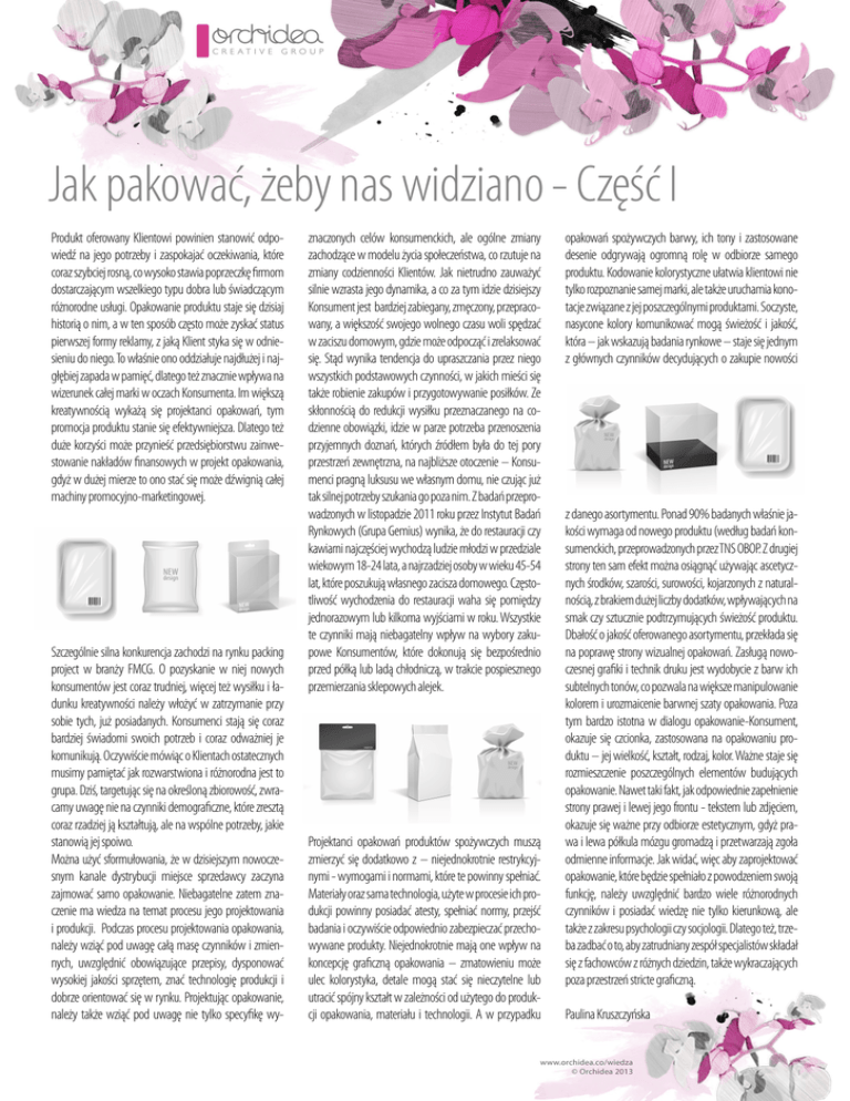 Jak pakować, żeby nas widziano - Część I Produkt oferowany Klientowi powinien stanowić odpowiedź na jego potrzeby i zaspokajać oczekiwania, które coraz szybciej rosną, co wysoko stawia poprzeczkę firmom dostarczającym wszelkiego typu dobra lub świadczącym różnorodne usługi. Opakowanie produktu staje się dzisiaj historią o nim, a w ten sposób często może zyskać status pierwszej formy reklamy, z jaką Klient styka się w odniesieniu do niego. To właśnie ono oddziałuje najdłużej i najgłębiej zapada w pamięć, dlatego też znacznie wpływa na wizerunek całej marki w oczach Konsumenta. Im większą kreatywnością wykażą się projektanci opakowań, tym promocja produktu stanie się efektywniejsza. Dlatego też duże korzyści może przynieść przedsiębiorstwu zainwestowanie nakładów finansowych w projekt opakowania, gdyż w dużej mierze to ono stać się może dźwignią całej machiny promocyjno-marketingowej. Szczególnie silna konkurencja zachodzi na rynku packing project w branży FMCG. O pozyskanie w niej nowych konsumentów jest coraz trudniej, więcej też wysiłku i ładunku kreatywności należy włożyć w zatrzymanie przy sobie tych, już posiadanych. Konsumenci stają się coraz bardziej świadomi swoich potrzeb i coraz odważniej je komunikują. Oczywiście mówiąc o Klientach ostatecznych musimy pamiętać jak rozwarstwiona i różnorodna jest to grupa. Dziś, targetując się na określoną zbiorowość, zwracamy uwagę nie na czynniki demograficzne, które zresztą coraz rzadziej ją kształtują, ale na wspólne potrzeby, jakie stanowią jej spoiwo. Można użyć sformułowania, że w dzisiejszym nowoczesnym kanale dystrybucji miejsce sprzedawcy zaczyna zajmować samo opakowanie. Niebagatelne zatem znaczenie ma wiedza na temat procesu jego projektowania i produkcji. Podczas procesu projektowania opakowania, należy wziąć pod uwagę całą masę czynników i zmiennych, uwzględnić obowiązujące przepisy, dysponować wysokiej jakości sprzętem, znać technologię produkcji i dobrze orientować się w rynku. Projektując opakowanie, należy także wziąć pod uwagę nie tylko specyfikę wy- znaczonych celów konsumenckich, ale ogólne zmiany zachodzące w modelu życia społeczeństwa, co rzutuje na zmiany codzienności Klientów. Jak nietrudno zauważyć silnie wzrasta jego dynamika, a co za tym idzie dzisiejszy Konsument jest bardziej zabiegany, zmęczony, przepracowany, a większość swojego wolnego czasu woli spędzać w zaciszu domowym, gdzie może odpocząć i zrelaksować się. Stąd wynika tendencja do upraszczania przez niego wszystkich podstawowych czynności, w jakich mieści się także robienie zakupów i przygotowywanie posiłków. Ze skłonnością do redukcji wysiłku przeznaczanego na codzienne obowiązki, idzie w parze potrzeba przenoszenia przyjemnych doznań, których źródłem była do tej pory przestrzeń zewnętrzna, na najbliższe otoczenie – Konsumenci pragną luksusu we własnym domu, nie czując już tak silnej potrzeby szukania go poza nim. Z badań przeprowadzonych w listopadzie 2011 roku przez Instytut Badań Rynkowych (Grupa Gemius) wynika, że do restauracji czy kawiarni najczęściej wychodzą ludzie młodzi w przedziale wiekowym 18-24 lata, a najrzadziej osoby w wieku 45-54 lat, które poszukują własnego zacisza domowego. Częstotliwość wychodzenia do restauracji waha się pomiędzy jednorazowym lub kilkoma wyjściami w roku. Wszystkie te czynniki mają niebagatelny wpływ na wybory zakupowe Konsumentów, które dokonują się bezpośrednio przed półką lub ladą chłodniczą, w trakcie pospiesznego przemierzania sklepowych alejek. Projektanci opakowań produktów spożywczych muszą zmierzyć się dodatkowo z – niejednokrotnie restrykcyjnymi - wymogami i normami, które te powinny spełniać. Materiały oraz sama technologia, użyte w procesie ich produkcji powinny posiadać atesty, spełniać normy, przejść badania i oczywiście odpowiednio zabezpieczać przechowywane produkty. Niejednokrotnie mają one wpływ na koncepcję graficzną opakowania – zmatowieniu może ulec kolorystyka, detale mogą stać się nieczytelne lub utracić spójny kształt w zależności od użytego do produkcji opakowania, materiału i technologii. A w przypadku opakowań spożywczych barwy, ich tony i zastosowane desenie odgrywają ogromną rolę w odbiorze samego produktu. Kodowanie kolorystyczne ułatwia klientowi nie tylko rozpoznanie samej marki, ale także uruchamia konotacje związane z jej poszczególnymi produktami. Soczyste, nasycone kolory komunikować mogą świeżość i jakość, która – jak wskazują badania rynkowe – staje się jednym z głównych czynników decydujących o zakupie nowości z danego asortymentu. Ponad 90% badanych właśnie jakości wymaga od nowego produktu (według badań konsumenckich, przeprowadzonych przez TNS OBOP. Z drugiej strony ten sam efekt można osiągnąć używając ascetycznych środków, szarości, surowości, kojarzonych z naturalnością, z brakiem dużej liczby dodatków, wpływających na smak czy sztucznie podtrzymujących świeżość produktu. Dbałość o jakość oferowanego asortymentu, przekłada się na poprawę strony wizualnej opakowań. Zasługą nowoczesnej grafiki i technik druku jest wydobycie z barw ich subtelnych tonów, co pozwala na większe manipulowanie kolorem i urozmaicenie barwnej szaty opakowania. Poza tym bardzo istotna w dialogu opakowanie-Konsument, okazuje się czcionka, zastosowana na opakowaniu produktu – jej wielkość, kształt, rodzaj, kolor. Ważne staje się rozmieszczenie poszczególnych elementów budujących opakowanie. Nawet taki fakt, jak odpowiednie zapełnienie strony prawej i lewej jego frontu - tekstem lub zdjęciem, okazuje się ważne przy odbiorze estetycznym, gdyż prawa i lewa półkula mózgu gromadzą i przetwarzają zgoła odmienne informacje. Jak widać, więc aby zaprojektować opakowanie, któr