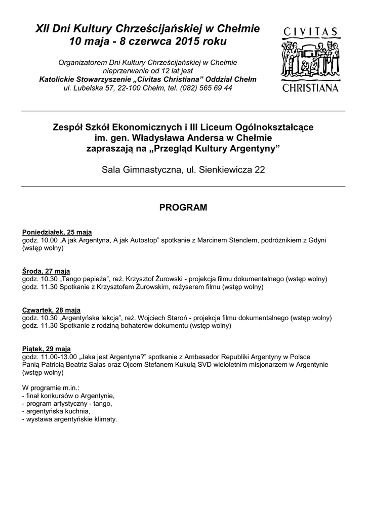 XII Dni Kultury Chrześcijańskiej w Chełmie 10 maja - 8 czerwca 2015 roku Organizatorem Dni Kultury Chrześcijańskiej w Chełmie nieprzerwanie od 12 lat jest Katolickie Stowarzyszenie „Civitas Christiana” Oddział Chełm ul. Lubelska 57, 22-100 Chełm, tel. (082) 565 69 44 Zespół Szkół Ekonomicznych i III Liceum Ogólnokształcące im. gen. Władysława Andersa w Chełmie zapraszają na „Przegląd Kultury Argentyny” Sala Gimnastyczna, ul. Sienkiewicza 22 PROGRAM Poniedziałek, 25 maja godz. 10.00 „A jak Argentyna, A jak Autostop” spotkanie z Marcinem Stenclem, podróżnikiem z Gdyni (wstęp wolny) Środa, 27 maja godz. 10.30 „Tango papieża”, reż. Krzysztof Żurowski - projekcja filmu dokumentalnego (wstęp wolny) godz. 11.30 Spotkanie z Krzysztofem Żurowskim, reżyserem filmu (wstęp wolny) Czwartek, 28 maja godz. 10.30 „Argentyńska lekcja”, reż. Wojciech Staroń - projekcja filmu dokumentalnego (wstęp wolny) godz. 11.30 Spotkanie z rodziną bohaterów dokumentu (wstęp wolny) Piątek, 29 maja godz. 11.00-13.00 „Jaka jest Argentyna?” spotkanie z Ambasador Republiki Argentyny w Polsce Panią Patricią Beatriz Salas oraz Ojcem Stefanem Kukułą SVD wieloletnim misjonarzem w Argentynie (wstęp wolny) W programie m.in.: - finał konkursów o Argentynie, - program artystyczny - tango, - argentyńska kuchnia, - wystawa argentyńskie klimaty.
