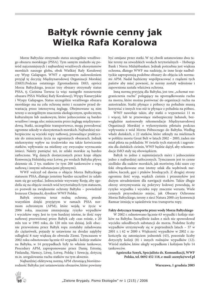 Bałtyk równie cenny jak Wielka Rafa Koralowa Morze Bałtyckie otrzymało status szczególnie wrażliwego obszaru morskiego (PSSA). Tym samym znalazło się pośród najcenniejszych i najbardziej wrażliwych ekosystemów morskich naszego globu, obok Wielkiej Rafy Koralowej czy Wysp Galapagos. WWF z ogromnym zadowoleniem przyjął tę decyzję Międzynarodowej Organizacji Morskiej (IMO).Podczas ostatniego Zgromadzenia IMO, oprócz Morza Bałtyckiego, jeszcze trzy obszary otrzymały status PSSA, tj. Cieśnina Torresa (a więc nastąpiło rozszerzenie obszaru PSSA Wielkiej Rafy Koralowej), Wyspy Kanaryjskie i Wyspy Galapagos. Status szczególnie wrażliwego obszaru morskiego ma na celu ochronę mórz i oceanów przed dewastacją przez intensywną żeglugę. Obejmowane są nim tereny o szczególnym znaczeniu ekologicznym, społecznym, kulturalnym lub naukowym, które jednocześnie są bardzo wrażliwe i mogą ulec zniszczeniu przez żeglugę międzynarodową. Statki, szczególnie transportowce, mogą powodować ogromne szkody w ekosystemach morskich. Najbardziej niebezpieczne są wycieki ropy naowej, prowadzące praktycznie do zniszczenia życia na ogromnych obszarach. Jednak niekorzystny wpływ na środowisko ma także kotwiczenie statków, wpływanie na mielizny czy zwyczajne wyrzucanie śmieci. Należy pamiętać też, że szlaki morskie są bardzo zatłoczone. Wg danych dostarczonych przez kraje objęte Konwencją Helsińską oraz Łotwę, po wodach Bałtyku pływa dziennie ok. 2 tys. statków (w tym 200 tankowców z ropą naową i innymi substancjami płynnymi). WWF walczył od dawna o objęcie Morza Bałtyckiego statusem PSSA, dlatego jesteśmy bardzo szczęśliwi że udało nam się go uzyskać. Jednocześnie wzywamy Rosję, aby zgodziła się na objęcie swoich wód terytorialnych tym statusem, co pozwoli na zwiększenie ochrony Bałtyku – powiedział Ireneusz Chojnacki, dyrektor WWF Polska. Bałtyk otrzyma teraz realną ochronę, przede wszystkim dzięki przyjętym w ramach PSSA normom ochronnym (APM), które wejdą w życie w 2006 roku, znacznie zmniejszając ryzyko wypadków i wycieków ropy. Jest to tym bardziej istotne, że ilość ropy naowej przewożonej przez Bałtyk cały czas rośnie, z 20 mln ton w 1995 roku, do 120 mln ton dzisiaj. Jeśli obecnie przewożona przez Bałtyk ropa zostałaby załadowana do ciężarówek, pojazdy te ustawione na drodze zajęłyby odległość 8 razy większą do obwodu Ziemi. Tymczasem w 2002 roku odnotowano łącznie 63 wypadki i kolizje statków na Bałtyku, w 14 przypadkach były to właśnie tankowce. Procedury APM, zaproponowane przez Danię, Estonię, Finlandię, Niemcy, Litwę, Łotwę, Polskę i Szwecję, dotyczą m.in. uregulowania ruchu statków na tym akwenie. Najbardziej efektywną normą APM chroniącą bioróżnorodność Bałtyku jest ustanowienie obszarów, które powinny 10 być omijane przez statki. W tej chwili ustanowiono dwa takie tereny na szwedzkich wodach terytorialnych – Hoburgs Bank i Norra Midsjöbanken. Jednak potrzebna jest większa ochrona, dlatego WWF ma nadzieję, że inne kraje nadbałtyckie zaproponują podobne obszary do objęcia ich normami APM. Nadal będziemy współpracować z rządami tych państw aby mieć pewność, że normy zostały wdrożone i zapewniona zastała właściwa ochrona. Inną normą przyjętą dla Bałtyku, jest tzw. „schemat rozgraniczenia ruchu” polegający na uporządkowaniu ruchu na morzu, które można porównać do organizacji ruchu na autostradzie. Statki płynące z północy na południe muszą korzystać z innych tras niż te płynące z południa na północ. WWF nawołuje także, aby statki o wyporności 11 m i więcej, lub te przewożące niebezpieczny ładunek, bezwzględnie zastosowały rekomendacje Międzynarodowej Organizacji Morskiej o wykorzystaniu pilotażu podczas wpływaniu z wód Morza Północnego do Bałtyku. Według władz duńskich, z 22 statków, które utknęły na mieliznach w pobliżu mostu Great Belt w latach 2002 – 2005, żaden nie miał pilota na pokładzie. W świetle tych statystyk i zagrożeniu dla duńskich cieśnin, WWF będzie dążył, aby rekomendacje IMO stały się obowiązkiem. Bałtyk to jedno z najmniejszych mórz i jednocześnie jedno z najbardziej zatłoczonych. Tymczasem jest to cenne siedlisko dla ssaków morskich, jak morświny, foki szare czy foki obrączkowane oraz istotny szlak dla wędrówek nurników, kaczek, gęsi i ptaków brodzących. Z drugiej strony ogromna ilość wysp, wąskich cieśnin i przesmyków jest dużym utrudnieniem dla nawigacji statków. Także długie okresy utrzymywania się pokrywy lodowej powodują, że ryzyko wypadku i wycieku ropy znacznie wzrasta. Wiele cennych przyrodniczo miejsc, jak Obszary Ochronne Morza Bałtyckiego, tereny z sieci Natura 2000 czy konwencji Ramsar istnieją w sąsiedztwie tras transportu ropy. Fakty dotyczące transportu przez wody Morza Bałtyckiego W 2002 r. odnotowano łącznie 63 wypadki i kolizje statków na Bałtyku. Szczęśliwie żaden z nich nie spowodował wycieku szkodliwych substancji do morza. Podobne liczby wypadków utrzymywały się w poprzednich latach – 57 w 2001 r. i 62 w 2000 r. Większość wypadków w 2002 r. zakończyła się zatonięciem jednostek (43), pozostałe liczby dotyczyły kolizji (8) i innych rodzajów wypadków (12). Wśród statków, które uległy wypadkom i kolizjom było 14 tankowców. Agnieszka Sznyk, Specjalista ds. Komunikacji, WWF Polska, tel. 0692 452 118, e-mail: [email protected] „Zielone Brygady. Pismo Ekologów” nr 1 (215) / 2006 Warszawa, 1 grudnia 2005
