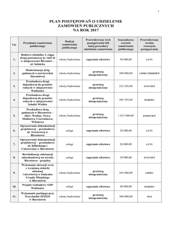 1 PLAN POSTĘPOWAŃ O UDZIELENIE ZAMÓWIEŃ PUBLICZNYCH NA ROK 2017 Lp. Przedmiot zamówienia publicznego Rodzaj zamówienia publicznego Przewidywany tryb postępowania lub innej procedury udzielenia zamówienia Szacunkowa wartość zamówienia publicznego Przewidywany termin wszczęcia postępowania 1. Budowa chodnika w ciągu drogi powiatowej nr 1463 D w miejscowości Bierutów – ul. Solnicka roboty budowlane zapytanie ofertowe 50 000,00 LUTY 2. Modernizacja dróg gminnych o nawierzchni tłuczniowej roboty budowlane przetarg nieograniczony 500 000,00 LIPIEC/SIERPIEŃ 3. Przebudowa drogi dojazdowej do gruntów rolnych w miejscowości Wabienice roboty budowlane przetarg nieograniczony 232 526,00 STYCZEŃ 4. Przebudowa drogi dojazdowej do gruntów rolnych w miejscowości Solniki Wielkie roboty budowlane przetarg nieograniczony 505 393,00 MARZEC roboty budowlane przetarg nieograniczony 1 013 000,00 KWIECIEŃ usługi zapytanie ofertowe 20 000,00 LUTY 7. Opracowanie dokumentacji projektowej – przebudowa ul. Kilińskiego ( Cukrownia) w Bierutowie usługi zapytanie ofertowe 20 000,00 LUTY 8. Rewitalizacja substancji mieszkaniowej na terenie Bierutowa - projekty usługi zapytanie ofertowe 30 000,00 STYCZEŃ 9. Wykonanie elewacji wraz z wymianą stolarki okiennej i drzwiowej w budynku Urzędu Miejskiego w Bierutowie roboty budowlane przetarg nieograniczony 565 000,00 LIPIEC 10. Projekt rozbudowy OSP Wabienice usługi zapytanie ofertowe 40 000,00 MARZEC 11. Wykonanie parkingu przy Przychodni ZPZOZ w Bierutowie roboty budowlane przetarg nieograniczony 300 000,00 MAJ 5. 6. Przebudowa dróg gminnych w Bierutowie – ulice: Wodna, Nowa, Malinowa, Czereśniowa, Wiśniowa Opracowanie dokumentacji projektowej – przebudowa ul. Towarowej w Bierutowie 2 12. Budowa zbiornika małej retencji roboty budowlane przetarg nieograniczony 160 590,00 GRUDZIEŃ 13. Zakupy inwestycyjne (plac zabaw: Rynek i ul. Bema) roboty budowlane zapytanie ofertowe 125 000,00 MARZEC 14. Wymiana stolarki okiennej w świetlicy wiejskiej w m. Solniki Wielkie roboty budowlane zapytanie ofertowe 48 000,00 STYCZEŃ 15. Projekty świetlic wiejskich we wsiach Kijowice i Strzałkowa usługi zapytanie ofertowe 80 000,00 STYCZEŃ Budowa świetlicy wiejskiej we wsi Strzałkowa roboty budowlane przetarg nieograniczony 200 000,00 MARZEC 17. Wymiana pokrycia dachowego na świetlicy wiejskiej we wsi Stronia roboty budowlane zapytanie ofertowe 150 000,00 STYCZEŃ 18. Wykonanie adaptacji budynku sali sportowej przy ul. Namysłowskiej na bibliotekę publiczną roboty budowlane przetarg nieograniczony 700 000,00 LISTOPAD 19. Budowa zaplecza dla sportowców we wsi Solniki Małe roboty budowlane przetarg nieograniczony 150 000,00 CZERWIEC 20. Budowa świetlicy wiejskiej we wsi Sątok roboty budowlane przetarg nieograniczony 150 000,00 LIPIEC 16.