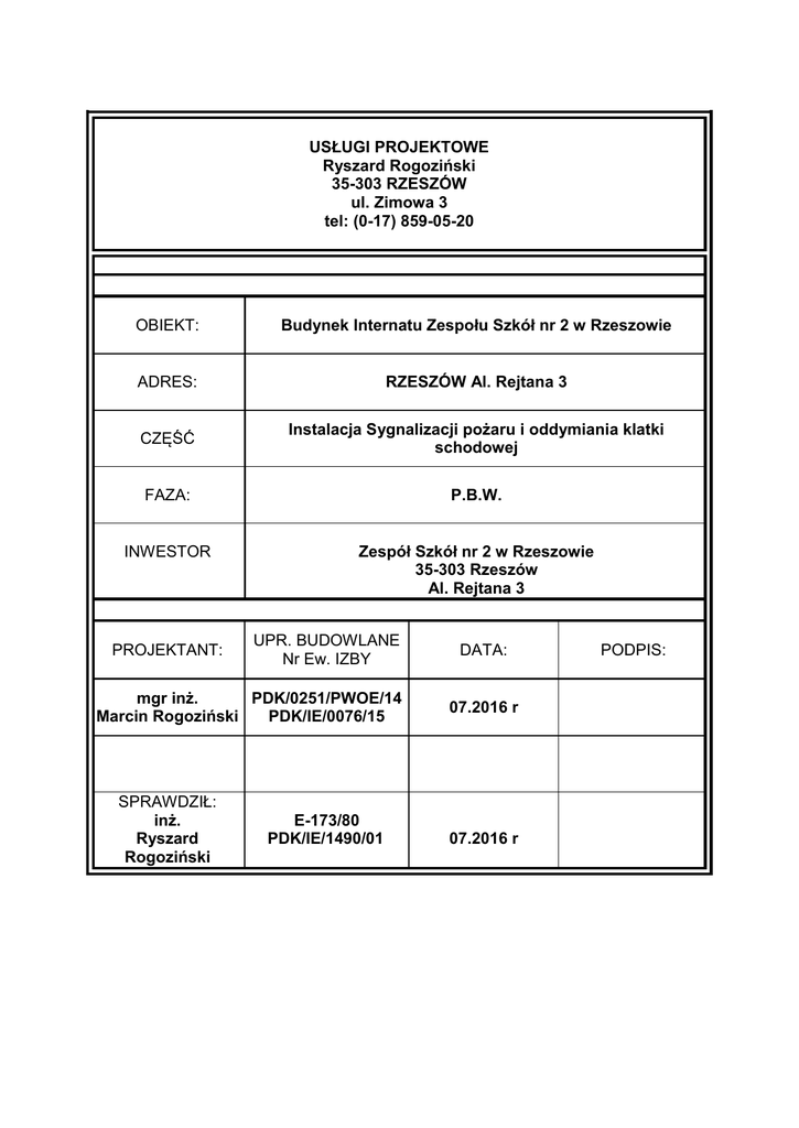 USŁUGI PROJEKTOWE Ryszard Rogoziński 35-303 RZESZÓW ul. Zimowa 3 tel: (0-17) 859-05-20 OBIEKT: Budynek Internatu Zespołu Szkół nr 2 w Rzeszowie ADRES: RZESZÓW Al. Rejtana 3 CZĘŚĆ Instalacja Sygnalizacji pożaru i oddymiania klatki schodowej FAZA: P.B.W. INWESTOR Zespół Szkół nr 2 w Rzeszowie 35-303 Rzeszów Al. Rejtana 3 PROJEKTANT: UPR. BUDOWLANE Nr Ew. IZBY mgr inż. PDK/0251/PWOE/14 Marcin Rogoziński PDK/IE/0076/15 SPRAWDZIŁ: inż. Ryszard Rogoziński E-173/80 PDK/IE/1490/01 DATA: 07.2016 r 07.2016 r PODPIS: Opis Do projektu budowlanego wykonawczego instalacji sygnalizacji pożaru i oddymiania klatki schodowej przebudowy budynku Internatu Zespołu Szkół nr 2 w Rzeszowie 1. DANE OGÓLNE 1.1. Inwestor Zespół Szkół nr 2 w Rzeszowie 35-303 Rzeszów Al. Rejtana 3 1.2. Podstawa opracowania - zlecenie inwestora - rzuty budowlane - dane zebrane przez projektanta - ekspertyza rzeczoznawcy pożarowego 1.3. Zasady opracowania projektu: Dokumentację systemu wykrywania i sygnalizacji pożaru opracowano na podstawie: - planów budowlanych obiektu, - zlecenia Inwestora - norm: PKN-CEN/TS 54-14-2006 Systemy sygnalizacji pożarowej; Część 14: Wytyczne planowania, projektowania, instalowania, odbioru, eksploatacji i konserwacji. PN-EN 54-1: 1998 Systemy sygnalizacji pożarowej. Wprowadzenie. PN-EN 54-2:2002/A1:2007 Systemy sygnalizacji pożarowej. Część 2: Centrale sygnalizacji pożarowej. PN-EN 54-3:2003/A2:2007 Systemy sygnalizacji pożarowej. Część 3: Pożarowe urządzenia alarmowe. Sygnalizatory akustyczne. PN-EN 54-4:2001/A2:2007 Systemy sygnalizacji pożarowej. Część 4: Zasilacze. PN-EN 54-13:2007 Systemy sygnalizacji pożarowej. Część 13: Ocena kompatybilności podzespołów systemu. PN-EN 54-18:2007/AC:2007 Systemy sygnalizacji pożarowej. Część 18: Urządzenia wejścia/wyjścia. Ustawa z dnia 7 lipca 1994 r. Prawo budowlane (DZ.U. DZ 2000 r., Nr 106, poz 1126 z późn. Zm.) – tekst ujednolicony z nowelizacją z 6 maja 2010 r. Rozporządzenie Ministra Infrastruktury z dnia 12 kwietnia 2002 r. w sprawie warunków technicznych, .jakim powinny odpowiadać budynki i ich usytuowanie. Rozporządzenie Ministra Spraw Wewnętrznych i Administracji z dnia 7 czerwca 2010 r. w sprawie ochrony przeciwpożarowej budynków, innych obiektów budowlanych i terenów. Rozporządzenie Ministra Spraw Wewnętrznych i Administracji z dnia 20 czerwca 2007r. zmieniające rozporządzenie w sprawie wykazu wyrobów służących zapewnieniu bezpieczeństwa publicznego lub ochronie zdrowia i życia oraz mienia, a także zasad wydawania dopuszczenia tych wyrobów do użytkowania. 1.4. Zakres projektu: Projekt techniczny instalacji systemu sygnalizacji pożarowego obejmuje zaprojektowanie w oparciu o urządzenia systemu interaktywnego (centrali sygnalizacji pożaru) współpracującego z liniowymi czujkami dymu, ręcznymi ostrzegaczami pożarowymi dla internatu. Projekt obejmuje również rozmieszczenie sygnalizatorów akustycznooptycznych. Dla potrzeb oddymiania przyjęto instalację siłowników w oknach oddymiających na II piętrze i drzwi napowietrzających wyznaczonej przez rzeczoznawcę ds. zabezpieczeń przeciwpożarowych klatki schodowej. W opracowaniu ujęto instalację drzwiowych chwytaków elektromagnetycznych wybranych przez ds. zabezpieczeń przeciwpożarowych drzwi. Przewiduje się instalację dwóch centralek zamknięć ogniowych. Z rozdzielni piętrowych budynku wykonać zasilanie w energię elektryczną centrali sygnalizacji pożaru, centrali oddymiania klatki schodowej i centralek sterowania systemami zamknięć ogniowych (drzwi). 2. ROZWIĄZANIA TECHNICZNE 2.1. Opis ogólny budynku Przebudowany budynek o konstrukcji murowanej, trzykondygnacyjny podpiwniczony. Lokalizację centrali sygnalizacji pożaru przewiduje się w pomieszczeniu biurowym na poziomie I piętra. Ponadto projektuje się wykonanie instalacji oddymiania klatki schodowej za pomocą centrali oddymiania, która zlokalizowana ma być na II piętrze oddymianej klatki schodowej. W korytarzu parteru i w pomieszczeniu wychowawcy na I piętrze mają być zainstalowane centralki sterowania systemami zamknięć ogniowych (drzwi). 2.2. Zakres ochrony obiektu Przyjęto ochronę obiektu zgodnie z opracowaną przez rzeczoznawcę ds. zabezpieczeń pożarowych ekspertyzą techniczną w zakresie bezpieczeństwa pożarowego budynku Internatu. W związku z tym projektuje się instalację centrali sygnalizacji pożaru, która współpracować będzie z centralami zamknięć ogniowych (drzwi) i centralą oddymiania wskazanej przez rzeczoznawcę klatki schodowej. Przyporządkowane punkty dozorowe w linii (liniowe czujki dymu, ręczne ostrzegacze pożarowe) zaprogramowane są w centrali CSP. W centrali należy przewidzieć możliwość docelowego przekazania sygnału alarmu pożarowego II stopnia do Komendy Państwowej Straży Pożarnej za pomocą linii telefonicznej. Na korytarzach zaprojektowano przyciski ręcznego ostrzegania pożaru ROP. Stany zagrożenia p.poż. systemu sygnalizowane będą przez sygnalizatory akustyczno-optyczne wewnętrzne i zewnętrzny zabudowany na elewacji budynku. 2.3.Zasilanie w energię elektryczną Jednym z podstawowych warunków niezawodnej pracy systemu sygnalizacji pożaru i pozostałych central jest bezprzerwowe zasilanie systemu. W tym celu zaprojektowano dwa odrębne źródła zasilania: a) sieć energetyczna prądu przemiennego 230VAC o pracy ciągłej z tablic rozdzielczych piętrowych. b) bateria akumulatorów, zabudowana w zasilaczach. Zasilacz buforuje lub ładuje dołączony w centralach akumulator w sposób automatyczny. Po zaniku napięcia w sieci następuje samoczynne przełączanie central na zasilanie z akumulatora nie powodując zmiany pracy urządzeń. Zaprojektowana wielkość akumulatorów gwarantuje 72-godzinną pracę central w dozorowaniu. 2.4. Opis techniczny systemu Centrala sygnalizacji pożaru przeznaczona ma być do współpracy z adresowalnymi liniowymi czujkami