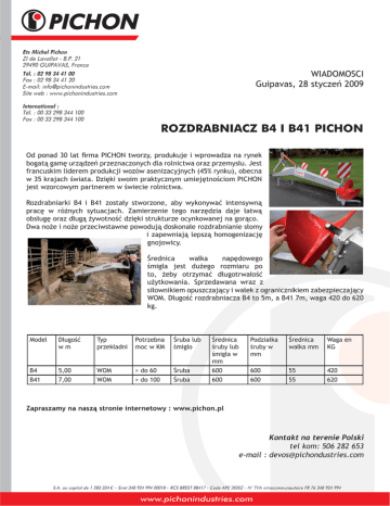 Ets Michel Pichon ZI de Lavallot - B.P. 21 29490 GUIPAVAS, France WIADOMOSCI Guipavas, 28 styczeń 2009 Tél. : 02 98 34 41 00 Fax : 02 98 34 41 20 E-mail: [email protected] Site web : www.pichonindustries.com International : Tél. : 00 33 298 344 100 Fax : 00 33 298 344 100 ROZDRABNIACZ B4 I B41 PICHON Od ponad 30 lat firma PICHON tworzy, produkuje i wprowadza na rynek bogatą gamę urządzeń przeznaczonych dla rolnictwa oraz przemysłu. Jest francuskim liderem produkcji wozów asenizacyjnych (45% rynku), obecna w 35 krajach świata. Dzięki swoim praktycznym umiejętnościom PICHON jest wzorcowym partnerem w świecie rolnictwa. Rozdrabniarki B4 i B41 zostały stworzone, aby wykonywać intensywną pracę w różnych sytuacjach. Zamierzenie tego narzędzia daje łatwą obsługę oraz długą żywotność dzięki strukturze ocynkowanej na gorąco. Dwa noże i noże przeciwstawne powodują doskonałe rozdrabnianie słomy i zapewniają lepszą homogenizację gnojowicy. Średnica wałka napędowego śmigła jest dużego rozmiaru po to, żeby otrzymać długotrwałość użytkowania. Sprzedawana wraz z siłownikiem opuszczający i wałek z ogranicznikiem zabezpieczający WOM. Długość rozdrabniacza B4 to 5m, a B41 7m, waga 420 do 620 kg. Model Długość wm Typ przekładni Potrzebna moc w KM Śruba lub śmigło Średnica śruby lub śmigła w mm Podziałka śruby w mm Średnica wałka mm Waga en KG B4 5,00 WOM > do 60 Śruba 600 600 55 420 B41 7,00 WOM > do 100 Śruba 600 600 55 620 Zapraszamy na naszą stronie internetowy : www.pichon.pl Kontakt na terenie Polski tel kom: 506 282 653 e-mail : [email protected] S.A. au capital de 1 583 334 € - Siret 348 924 994 00018 - RCS BREST 8B417 - Code APE PE 2830Z - N° TVA intracommunautaire intra acommunautaire FR 76 348 924 994 a www.pichonindustries.com