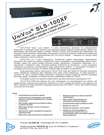 ® UniVox SLS Super Loop System, to seria wzmacniaczy stworzona do profesjonalnych zastosowań w miejscach, gdzie konieczny jest najwyŜszej jakości, idealnie odzwierciedlony dźwięk oraz ® ekstremalnie mały przeciek sygnału w kaŜdym kierunku. UniVox SLS kontroluje pole magnetyczne we wszystkich trzech wymiarach, wytwarzając róŜne poziomy dla róŜnych wysokości. Dzięki temu moŜliwe jest spełnienie wymagań normy międzynarodowej IEC dla pozycji stojącej i siedzącej lub pokrycie sekcji miejsc siedzących o róŜnej wysokości. ® UniVox SLS to w pełni zintegrowany, 2-warstwowy system zapewniający niewiarygodnie jednorodne pole nawet dla wysokich częstotliwości, które są niezbędne dla prawidłowego odbioru mowy. Ponadto, system ten niemal zupełnie eliminuje problem interferencji z instalacjami audio/video, np. z mikrofonami i projektorami video. Pozostałe problemy interferencji ze zbrojeniami i innymi strukturami metalowymi są wyraźnie zminimalizowane dzięki zastosowaniu systemu w przeciwfazie. Wszystkie te szczegóły techniczne sprawiają, Ŝe działanie instalacji staje się stabilne i przewidywalne. ® Druga generacja rodziny wzmacniaczy UniVox SLS nadal jest oparta na koncepcji stosowania dwóch oddzielnych konfiguracji pętli. Natomiast teraz układ został zintegrowany do jednej jednostki o wymiarze 19” rack'a. Jeszcze mniejsze zakłócenia i zwiększone napięcie wyjściowe wyraźnie poprawiają dynamikę sygnału, szczególnie w zakresie wysokich częstotliwości (nawet do 10kHz!) W rezultacie system ten dostarcza uŜytkownikom aparatów słuchowych sygnał jakości Hi-Fi. ® UniVox SLS-100XF jest zalecany dla nowo budowanych, czy remontowanych kin, teatrów, sali 2 konferencyjnych, szkół itp. Dla powierzchni większych niŜ 170m zastosuj SLS-300XF, a dla większych niŜ 2 2 ® 300m uŜyj SLS-700 (dwie jednostki) obsługujący powierzchnie aŜ do 650m . UniVox SLS spełnia wymogi normy IEC 60118-4:2006. Cechy • • Zminimalizowany przeciek sygnału • Jednorodne pole magnetyczne, bez spadku poziomu i zaburzeń częstotliwości na środku powierzchni Wyraźnie poszerzony zakres wysokich częstotliwości • Złącze SART (wejście/wyjście) z automatyczną kontrolą sygnału • • • • Programowalne złącza 6,35/XLR 2x RCA • Brak spadku sygnału przy pochyleniu głowy w jednym kierunku • Mały wpływ zbrojeń i innych metalowych konstrukcji • Ograniczone ryzyko wystąpienia sprzęŜenia magnetycznego • Mały pobór prądu prądu/wysoka efektywność MontaŜ do rack'a 19” Gniazdo do odsłuchu - jack 6,35mm Idealny do nowo powstających i remontowanych teatrów, kin, sal koncertowych, szkół, sal konferencyjnych, domów opieki itp. Producent: Bo EDIN AB, Förradsvägen 2B, 181 41 LIDINGÖ Oficjalny dystrybutor: NOVATEL Sp. z o.o. 43-155 Bieruń, ul. Turystyczna 1 tel. 32 20 11 704, fax. 32 20 11 511 UniVox SLS-100XF ® Zasilanie: 230-240V AC 50Hz; 7-200W, bezpiecznik 10A Powierzchnia pokrycia: 170m2, zgodnie z normą IEC 60118-4; Wyjście pętli: Maksymalny prąd 2x60App (podwójny wzmacniacz mocy), 1-5ms, 1kHz impuls 2x10A RMS ciągły ton 1kHz Maksymalne napięcie 2x47Vpp (podwójny wzmacniacz mocy) ARW wyjściowe Prąd i napięcie sygnałów jednostajnych, jak przebiegi sinusoidalne są ograniczone do -10dB po 0,6-1s. Charakterystyka częstotliwości 70-10000Hz (±3dB), do 16000Hz przy uŜyciu cienkiej taśmy miedzianej Wyjścia SLS Wejścia: Podwójny układ ARW: Regulatory: Wskaźniki optyczne: Pozostałe informacje: Uwaga Zniekształcenia <1% Połączenie pętli do dwóch terminali śrubowy na tylnym panelu 1. Wyjście (master) 0dBm gniazdo RCA (z funkcją ARW) na tylnym panelu 2. Wyjście (slave) 0dBm gniazdo RCA (z funkcją ARW) na tylnym panelu Wejście 1 Gniazda XLR/6,35mm na tylnym panelu Mikrofon: czułość 2,5mV-10V RMS/10kOhm, phantom 9-20V lub Linia: czułość 37mV-10V RMS /10kOhm (ustawienie fabryczne) Wejście 2 Dwa gniazda RCA na tylnym panelu, 45mV-10V RMS/10kOhm SCART (IN/OUT) Dwa gniazda SCART na tylnym panelu 50mV RMS IN (TV)/ OUT (DVD, VCR...) Zakres dynamiki >70dB Czas ataku 2-500ms Czas powrotu 0,5-20dB/s uwaga Czasy narastania i powrotu zaleŜą od aktywnego kanału Nastawienie pętli 0-170m2, potencjometry (master i Slave) na tylnym panelu Poziom wejściowy wejścia 1 i 2 mają oddzielne potencjometry na tylnym panelu Zasilanie LED niebieski na przednim panelu, świeci przy prawidłowym podłączeniu Prawidłowy sygnał wejściowy LED niebieski na przednim panelu, świeci jeśli działa ARW wejściowa Prąd pętli LEDy niebieski na przednim panelu (Master/Slave), świeci, gdy przez pętle płynie prąd. Wymiary 440x88x285mm (sz. x wys. x gł.) rack 19” Waga 6,3 kg Kolor Czarny Układ ARW Czasy działania zaleŜą od rodzaju dźwięku na wejściu Kontrola sygnału pętli Dioda na przednim panelu wskazuje czy przez pętlę przepływa prąd. Ponadto przydatną opcją jest moŜliwość podłączenia słuchawek lub odsłuchu do gniazda w przednim panelu. Numer katalogowy 215100 (UniVox SLS-100 XF) Akcesoria Numer 230450 230453 401010 401025 Opis UniVox Listener – odbiornik indukcyjny UniVox Listener – odbiornik indukcyjny w zestawie słuchawki FSM Miernik siły pola FSM Miernik siły pola w zestawie z walizką i płytą CD zawierającą sygnały testowe Producent: Bo EDIN AB, Förradsvägen 2B, 181 41 LIDINGÖ Oficjalny dystrybutor: NOVATEL Sp. z o.o. 43-155 Bieruń, ul. Turystyczna 1 tel. 32 20 11 704, fax. 32 20 11 511
