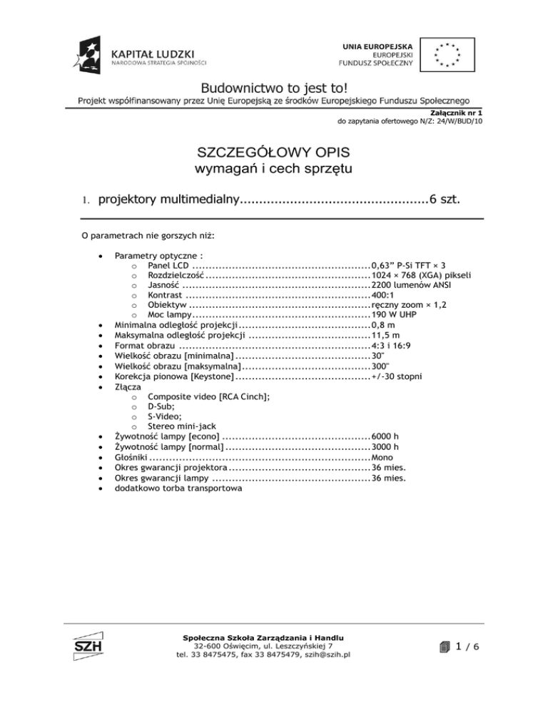 Załącznik nr 1 do zapytania ofertowego N/Z: 24/W/BUD/10 SZCZEGÓŁOWY OPIS wymagań i cech sprzętu 1. projektory multimedialny................................................. 6 szt. O parametrach nie gorszych niż: Parametry optyczne : o Panel LCD ...................................................... 0,63” P-Si TFT × 3 o Rozdzielczość .................................................. 1024 × 768 (XGA) pikseli o Jasność ......................................................... 2200 lumenów ANSI o Kontrast ........................................................ 400:1 o Obiektyw ....................................................... ręczny zoom × 1,2 o Moc lampy ...................................................... 190 W UHP Minimalna odległość projekcji ........................................ 0,8 m Maksymalna odległość projekcji ..................................... 11,5 m Format obrazu .......................................................... 4:3 i 16:9 Wielkość obrazu [minimalna] ......................................... 30" Wielkość obrazu [maksymalna] ....................................... 300" Korekcja pionowa [Keystone] ......................................... +/-30 stopni Złącza o Composite video [RCA Cinch]; o D-Sub; o S-Video; o Stereo mini-jack Żywotność lampy [econo] ............................................. 6000 h Żywotność lampy [normal] ............................................ 3000 h Głośniki ................................................................... Mono Okres gwarancji projektora ........................................... 36 mies. Okres gwarancji lampy ................................................ 36 mies. dodatkowo torba transportowa Społeczna Szkoła Zarządzania i Handlu 32-600 Oświęcim, ul. Leszczyńskiej 7 tel. 33 8475475, fax 33 8475479, [email protected] 1 /6 Załącznik nr 1 do zapytania ofertowego N/Z: 24/W/BUD/10 2. tablica interaktywna 48 cali ............................................. 3 szt. O parametrach nie gorszych niż: Efektywna powierzchnia tablicy (obszar interaktywny), na której można dokonywać notatek, sterować pracą komputera i wyświetlać obraz z projektora 97,5 cm x 73 cm (przekątna 48 cali – 121,9 cm). Format tablicy – 4 / 3. Waga – maksymalnie 16 kg. Możliwość montażu na ścianie. Powierzchnia tablicy umożliwiająca pisanie powszechnie dostępnymi pisakami suchościeralnymi. Komunikacja tablicy z komputerem i zasilanie – za pomocą przewodu USB. Gwarancja producenta na tablicę – 5 lat. Obsługa tablicy za pomocą załączonych pisaków i za pomocą palca. Pisaki do obsługi tablicy bez elementów elektronicznych i mechanicznych. W zastawie z tablicą cztery pisaki imitujące kolory czarny, czerwony, niebieski i zielony oraz gąbka do ścierania pisma elektronicznego. Półka na pisaki automatycznie rozpoznająca, który pisak został podniesiony, aktywująca automatycznie przypisany w oprogramowaniu kolor linii lub gąbkę z sygnalizacją za pomocą diod LED, które urządzenie z półki jest aktywne. Tablica automatyczne rozpoznaje używane narzędzie, tak że użytkownicy podnosząc pióro mogą pisać nim w aplikacjach, sterować programem za pomocą palca, usuwać notatki dłonią, wszystko te czynności bez konieczności odkładania pióra na półkę. Certyfikat CE i zgodność z Dyrektywą RoHS. Autoryzowany przez producenta tablicy serwis w Polsce, certyfikowany zgodnie z normą ISO 9001:2000 lub ISO 9001:2008 w zakresie urządzeń audiowizualnych. Wraz z tablicą dostarczyć (w języku polskim): o przewodnik metodyczny dla nauczycieli dotyczący wykorzystywania tablicy w procesie dydaktycznym, o podręcznik użytkownika tablicy. Oprogramowanie: Polska wersja językowa oprogramowania. Sterowanie komputerem przy pomocy interaktywnej tablicy. Zmiana kolorów tła. Wstawianie różnych rodzajów wzorców tła (np. papier w kratkę, papier w linie, papier nutowy, układy współrzędnych z tłem w kratkę itp.) z wewnętrznej bazy programu obsługującego tablicę. Możliwość wstawiania obiektów z wewnętrznej bazy programu obsługującego tablicę (np. obrazów, animacji, gotowych szablonów). Rozpoznawanie pisma ręcznego i jego konwersja na tekst. Rozpoznawanie narysowanych odręcznie kształtów i przekształcanie ich na figury geometryczne. Możliwość selektywnego ujawniania informacji umieszczonych na ekranie. Wstawianie tekstu za pomocą klawiatury ekranowej. Społeczna Szkoła Zarządzania i Handlu 32-600 Oświęcim, ul. Leszczyńskiej 7 tel. 33 8475475, fax 33 8475479, [email protected] 2 /6 Załącznik nr 1 do zapytania ofertowego N/Z: 24/W/BUD/10 Wypełnianie zamkniętych kształtów kolorem, gradientem, wzorem i wybranym plikiem graficznym. Obracanie, przesuwanie i zmiana rozmiaru obiektów, notatek. Możliwość grupowania i rozgrupowywania obiektów graficznych. Regulacja stopnia przeźroczystości obiektów. Wstawianie tabel i ich formatowanie (zmiana wielkości komórek, tła komórek, zmiana linii tabeli itp.). Rozpoznawanie ręcznie narysowanej tabeli, która po rozpoznaniu może być poddawana formatowaniu (zmiana wielkości komórek, tła komórek, zmiana linii tabeli itp.). Możliwość selektywnego ujawniania informacji umieszczonych w komórkach tabeli komórka po komórce. Definiowanie łączy do dowolnych obiektów (plików, stron html). Porządkowanie kolejności stron poprzez mechanizm przeciągnij i upuść. Przenoszenie poprzez mechanizm przeciągnij i upuść obiektów miedzy stronami w oprogramowaniu tablicy. Proste wstawianie zewnętrznych plików graficznych zapisanych w innych aplikacjach poprzez mechanizm przeciągnij i upuść pomiędzy oknem z zawartością katalogu i oknem programu dostarczanego wraz z tablicą. Wstawianie plików wykonanych w technologii Flash z wewnętrznej bazy programu obsługującego tablicę. Możliwość dodawania i uruchamiania własnych plików Flash. Możliwość modyfikowania zawarte