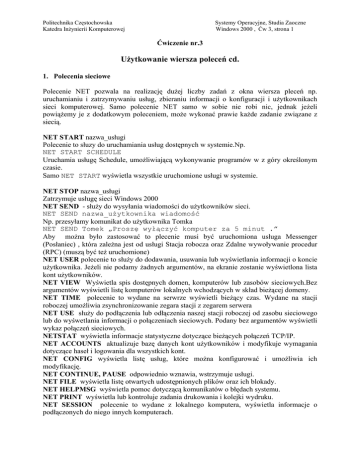 Politechnika Częstochowska Katedra Inżynierii Komputerowej Systemy Operacyjne, Studia Zaoczne Windows 2000 , Ćw 3, strona 1 Ćwiczenie nr.3 Użytkowanie wiersza poleceń cd. 1. Polecenia sieciowe Polecenie NET pozwala na realizację dużej liczby zadań z okna wiersza pleceń np. uruchamianiu i zatrzymywaniu usług, zbieraniu informacji o konfiguracji i użytkownikach sieci komputerowej. Samo polecenie NET samo w sobie nie robi nic, jednak jeżeli powiążemy je z dodatkowym poleceniem, może wykonać prawie każde zadanie związane z siecią. NET START nazwa_usługi Polecenie to słuzy do uruchamiania usług dostępnych w systemie.Np. NET START SCHEDULE Uruchamia usługę Schedule, umożliwiającą wykonywanie programów w z góry określonym czasie. Samo NET START wyświetla wszystkie uruchomione usługi w systemie. NET STOP nazwa_usługi Zatrzymuje usługę sieci Windows 2000 NET SEND - służy do wysyłania wiadomości do użytkowników sieci. NET SEND nazwa_użytkownika wiadomość Np. przesyłamy komunikat do użytkownika Tomka NET SEND Tomek „Proszę wyłączyć komputer za 5 minut .” Aby można było zastosować to plecenie musi być uruchomiona usługa Messenger (Posłaniec) , która zależna jest od usługi Stacja robocza oraz Zdalne wywoływanie procedur (RPC) (muszą być też uruchomione) NET USER polecenie to służy do dodawania, usuwania lub wyświetlania informacji o koncie użytkownika. Jeżeli nie podamy żadnych argumentów, na ekranie zostanie wyświetlona lista kont użytkowników. NET VIEW Wyświetla spis dostępnych domen, komputerów lub zasobów sieciowych.Bez argumentów wyświetli listę komputerów lokalnych wchodzących w skład bieżącej domeny. NET TIME polecenie to wydane na serwrze wyświetli bieżący czas. Wydane na stacji roboczej umożliwia zsynchronizowanie zegara stacji z zegarem serwera NET USE służy do podłączenia lub odłączenia naszej stacji roboczej od zasobu sieciowego lub do wyśwetlania informacji o połączeniach sieciowych. Podany bez argumentów wyświetli wykaz połączeń sieciowych. NETSTAT wyświetla informacje statystyczne dotyczące bieżących połączeń TCP/IP. NET ACCOUNTS aktualizuje bazę danych kont użytkowników i modyfikuje wymagania dotyczące haseł i logowania dla wszystkich kont. NET CONFIG wyświetla listę usług, które można konfigurować i umożliwia ich modyfikację. NET CONTINUE, PAUSE odpowiednio wznawia, wstrzymuje usługi. NET FILE wyświetla listę otwartych udostępnionych plików oraz ich blokady. NET HELPMSG wyświetla pomoc dotyczącą komunikatów o błędach systemu. NET PRINT wyświetla lub kontroluje zadania drukowania i kolejki wydruku. NET SESSION polecenie to wydane z lokalnego komputera, wyświetla informacje o podłączonych do niego innych komputerach. Politechnika Częstochowska Katedra Inżynierii Komputerowej Systemy Operacyjne, Studia Zaoczne Windows 2000 , Ćw 3, strona 2 FTP polecenie to uruchamia klienta FTP, podany bez żadnych parametrów, program wyświetla znak zachęty ftp>. Warunkiem działania programu FTP jest zainstalowanie protokołu TCP/IP. ftp [-v] [-n] [-i] [-d] [-g] [-s:nazwa_pliku] [-a] [-w:rozmiar_okna] [komputer] Parametry -v - Wyłącza wyświetlanie odpowiedzi serwera zdalnego. -n - Wyłącza automatyczne logowanie po nawiązaniu początkowego połączenia. -i - Wyłącza interaktywne monity w czasie przesyłania wielu plików. -d - Włącza debugowanie wyświetlając wszystkie polecenia usługi ftp przekazywane między klientem a serwerem. -g - Wyłącza mechanizm obsługi nazw plików, który pozwala używać symboli wieloznacznych (* i ?) w nazwach i ścieżkach plików lokalnych . -s:nazwa_pliku - Określa plik tekstowy zawierający polecenia usługi ftp, które zostaną automatycznie wykonane po uruchomieniu usługi ftp. W tym parametrze nie są dozwolone spacje. Należy używać tej opcji zamiast readresatora (>). -a - Używa interfejsu lokalnego przy wiązaniu połączeń danych. -w:rozmiar_okna - Zastępuje domyślny rozmiar buforu przesyłania, wynoszący 4096. Komputer - Określa nazwę lub adres IP komputera zdalnego, z którym należy nawiązać połączenie. Parametr komputer (jeśli został określony) musi być ostatnim parametrem w wierszu. Jeśli program FTP jest uruchomiony bez żadnych parametrów, przejdzie on w tryb interaktywny, wyświetlając znak zachęty ftp>. W odpowiedzi na ten znak możemy wprowadzić jedno z poniżych poleceń wewnętrznych: Ascii ustala tryb tekstowy (ASCII) transmisji. Używany do transmisji plików tekstowych. Binary ustala tryb binarny transmisji. Append pobieranie plików. Ich zawartość będzie dopisywana na koncu istniejących już plików. Close kończy sesję ftp bez kończenia działania klienta ftp Delete usuwa pliki na zdalnym serwerze. Delete kasuje jeden plik, a Mdelete może usunąć ich całą grupę. Disconnect kończy połączenie z innym komputerem Lcd zmienia lokalny katalog bieżący. Ls skrócony wykaz plików w katalogu zdalnym.. Mdir, Mkdir polecenia te służa do tworzenia katalogów Rmdir usuwania katalogów Open nawiązanie połączenia z serwerem Put, mput kopiowanie plików lokalnych do zdalnego serwera. Np. polecnie put command.com skopiuje plik command.com. Mput słuzy do kopiowania wielu plików. Pwd Wyswietla nazwę katalogu bieżącego w zdalnym serwerze Recv, get pobiera plik ze zdalnego serwera Mget pobiera pliki ze zdalnego serwera Poleceń tych jest więcej jeśli będą Ci potrzebne znajdziesz je np. w pomocy systemu Windows. Podałam te najważniejsze, które pozwolą ci zrealizować zadanie pierwsze. 2. Polecenie AT Politechnika Częstochowska Katedra Inżynierii Komputerowej Systemy Operacyjne, Studia Zaoczne Windows 2000 , Ćw 3, strona 3 AT [\\computername] [id] [/delete [/ yes]] AT [\\computername] time [/interactive] [/every :date[......] | /next:date[......]] "komenda" Polecenie At umożliwia zdefiniowanie harmonogramu automatycznego wykonywania programów. Wyma