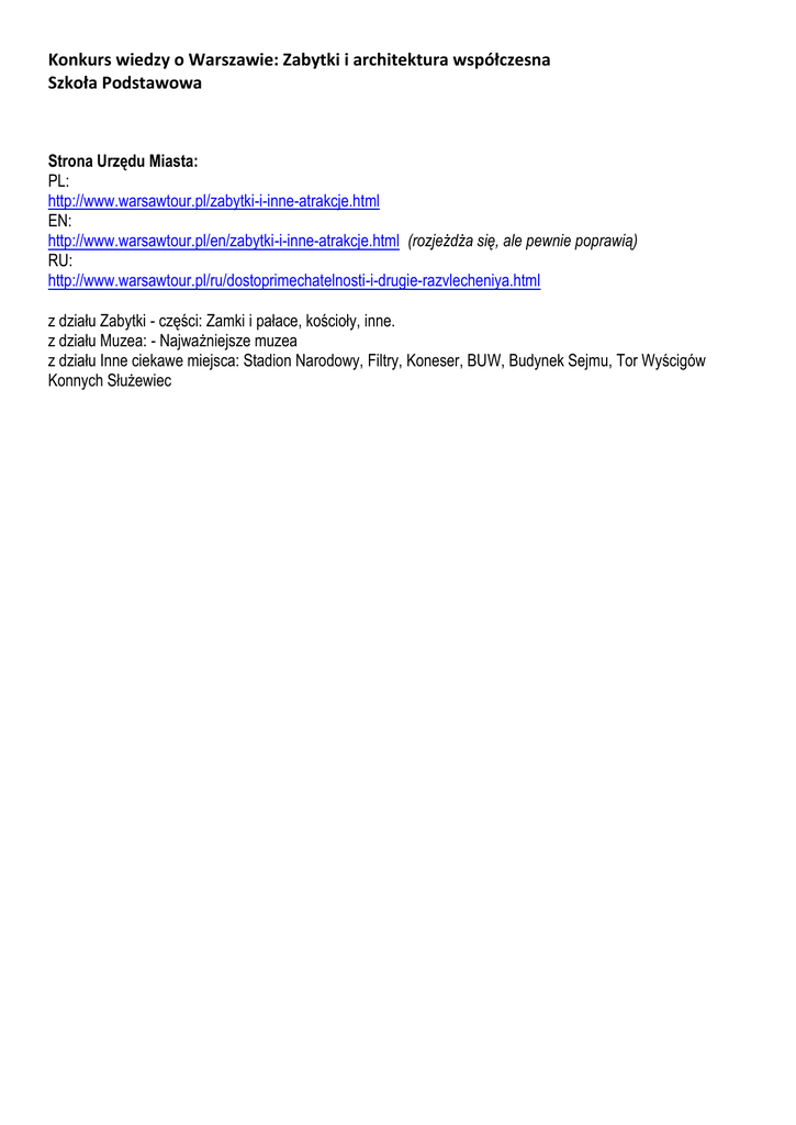 Konkurs wiedzy o Warszawie: Zabytki i architektura współczesna Szkoła Podstawowa Strona Urzędu Miasta: PL: http://www.warsawtour.pl/zabytki-i-inne-atrakcje.html EN: http://www.warsawtour.pl/en/zabytki-i-inne-atrakcje.html (rozjeżdża się, ale pewnie poprawią) RU: http://www.warsawtour.pl/ru/dostoprimechatelnosti-i-drugie-razvlecheniya.html z działu Zabytki - części: Zamki i pałace, kościoły, inne. z działu Muzea: - Najważniejsze muzea z działu Inne ciekawe miejsca: Stadion Narodowy, Filtry, Koneser, BUW, Budynek Sejmu, Tor Wyścigów Konnych Służewiec