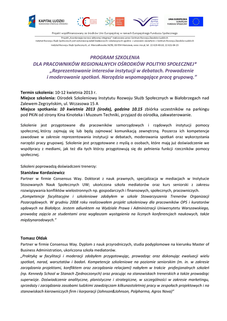 PROGRAM SZKOLENIA DLA PRACOWNIKÓW REGIONALNYCH OŚRODKÓW POLITYKI SPOŁECZNEJ* „Reprezentowanie interesów instytucji w debatach. Prowadzenie i moderowanie spotkań. Narzędzia wspomagające pracę grupową.” Termin szkolenia: 10-12 kwietnia 2013 r. Miejsce szkolenia: Ośrodek Szkoleniowy Instytutu Rozwoju Służb Społecznych w Białobrzegach nad Zalewem Zegrzyńskim, ul. Wczasowa 15 A Miejsce spotkania: 10 kwietnia 2013 (środa), godzina 10.15 zbiórka uczestników na parkingu pod PKiN od strony Kina Kinoteka i Muzeum Techniki, przyjazd do ośrodka, zakwaterowanie. Szkolenie jest przygotowane dla pracowników samorządowych i rządowych instytucji pomocy społecznej, którzy zajmują się lub będą zajmować komunikacją zewnętrzną. Poszerza ich kompetencje zawodowe w zakresie reprezentowania instytucji w debatach, moderowania spotkań oraz wykorzystania narzędzi pracy grupowej. Szkolenie jest przygotowane z myślą o osobach, które mają już doświadczenie we współpracy z mediami, jak też dla tych którzy przygotowują się do pełnienia funkcji rzeczników pomocy społecznej. Szkoleni poprowadzą doświadczeni trenerzy: Stanisław Kordasiewicz Partner w firmie Consensus Way. Doktorat z nauk prawnych, specjalizacja w mediacjach w Instytucie Stosowanych Nauk Społecznych UW; ukończona szkoła mediatorów oraz kurs seniorski z zakresu rozwiązywania konfliktów wielostronnych np. gospodarczych i finansowych, społecznych, pracowniczych. „Kompetencje facylitacyjne i szkoleniowe zdobyłem w szkole Stowarzyszenia Trenerów Organizacji Pozarządowych. W grudniu 2008 roku realizowałem projekt szkoleniowy dla pracowników OPS i kuratorów sądowych na Białołęce. Jestem adiunktem na Wydziale Prawa i Administracji Uniwersytetu Warszawskiego, prowadzę zajęcia ze studentami oraz wygłaszam wystąpienia na licznych konferencjach naukowych, także międzynarodowych.” Tomasz Ołdak Partner w firmie Consensus Way. Dyplom z nauk przyrodniczych, studia podyplomowe na kierunku Master of Business Administration, ukończona szkoła mediatorów. „Praktykę w facylitacji i moderacji zdobyłem przygotowując, prowadząc oraz dokonując ewaluacji wielu spotkań, narad, warsztatów i badań. Kompetencje szkoleniowe na poziomie seniorskim (m. in. w zakresie zarządzania projektami, konfliktem oraz zarządzania relacjami) nabyłem w trakcie profesjonalnych szkoleń (np. Kennedy School w Stanach Zjednoczonych) oraz pracując na stanowiskach trenerskich a także prowadząc superwizje. Doświadczenie analityczne, planistyczne i strategiczne, w szczególności w zakresie marketingu, sprzedaży i zarządzania zasobami ludzkimi zawdzięczam kilkunastoletniej pracy w zespołach projektowych i na stanowiskach kierowniczych firm i korporacji (Johnson&Johnson, Polpharma, Agros Nova)” DZIEŃ 1 Środa 10 kwietnia 2013 r. 10.15 11.15-11.30 Zbiórka uczestników na parkingu pod Pałacem Kultury i Nauki od strony Kina Kinoteka i Muzeum Techniki- wyjazd do Ośrodka IRSS Przyjazd do ośrodka i zakwaterowanie 11.45-12.00 Powitanie uczestniczek oraz uczestników 12.00-13.45 Temat: Umiejętności i zadania moderatora Na czym polega taktyka prowadzenia spotkań (cel, plan, narzędzia). Jakie są właściwości i konsekwencje pracy w grupie (proces grupowy). Stanisław Kordasiewicz, Tomasz Ołdak 13.45-14.30 14.30-16.00 Obiad Temat: Postawa moderatora Kompetencje komunikacyjne oraz postawa moderatora (neutralność, bezstronność, otwartość) Stanisław Kordasiewicz, Tomasz Ołdak 16.00-16.15 16.15-18.00 Przerwa kawowa Temat: Prowadzenie spotkań Uczestnicy uczą się przygotowania debat, m. in. jak definiować tematy i planować spotkania. Następnie samodzielnie prowadzą dyskusję w grupie, ćwiczą angażowanie rozmówców, wykorzystanie narzędzi, kontrolowanie jej przebiegu i podsumowanie. Wspólna analiza mocnych stron i elementów do doskonalenia, ewaluacja. Stanisław Kordasiewicz, Tomasz Ołdak 18.00 Kolacja DZIEŃ 2 Czwartek 11 kwietnia 2013 r. 8.30 9.15-11.30 Śniadanie Temat: Reprezentowanie interesów Instytucji w debatach publicznych Jak budować zwięzłe, oparte na faktach wypowiedzi. Na czym polega sztuka przekonującej argumentacji i jak uczestniczyć w dyskusji. Niewerbalne elementy budowania autorytetu. Stanisław Kordasiewicz, Tomasz Ołdak 11.30-11.45 11.45-13.45 Przerwa kawowa Temat: Moderowane spotkanie Studium przypadku. Praca z modelem TRZECH KROKÓW: jak jest? Diagnoza sytuacji. Stanisław Kordasiewicz, Tomasz Ołdak 13.45-14.30 14.30-16.45 Obiad Temat: Moderowane spotkanie Studium przypadku. Praca z modelem TRZECH KROKÓW: jak chcemy, żeby było? Wyznaczanie celów. Stanisław Kordasiewicz, Tomasz Ołdak 16.45-17.00 Przerwa kawowa 17.00-19.00 Temat: Moderowane spotkanie Studium przypadku. Praca z modelem TRZECH KROKÓW: jak to osiągnąć? Tworzenie strategii działania, uzgadnianie decyzji i harmonogramu. Stanisław Kordasiewicz, Tomasz Ołdak 19.00 Uroczysta kolacja DZIEŃ 3 Piątek 12 kwietnia 2013 r. 8.00 8.30-11.00 Śniadanie Temat: MODEL TRZECH KROKÓW Wspólna analiza i omówienie metody oraz przebiegu debaty opartej o model TRZECH KROKÓW: stan obecny, wizja przyszłości, ścieżki dojścia. Stanisław Kordasiewicz, Tomasz Ołdak 11.00-11.15 11.15-14.30 Przerwa kawowa Temat: NARZĘDZIA moderatora wspomagające analizę i podejmowanie decyzji Zastosowanie i korzyści płynące z wybranych metod pracy grupowej (np. analiza przyczyn diagramem „Rybia Ość”, diagnoza sytuacji SWOT, tabela +/Δ, cele SMART). Uczestnicy poznają i nauczą się wykorzystywać sprawdzone narzędzia z warsztatu zawodowych moderatorów. Stanisław Kordasiewicz, Tomasz Ołdak 14.30 Ok. 15.00 Obiad Wykwaterowanie i wyjazd do Warszawy * Program może ulec zmianie