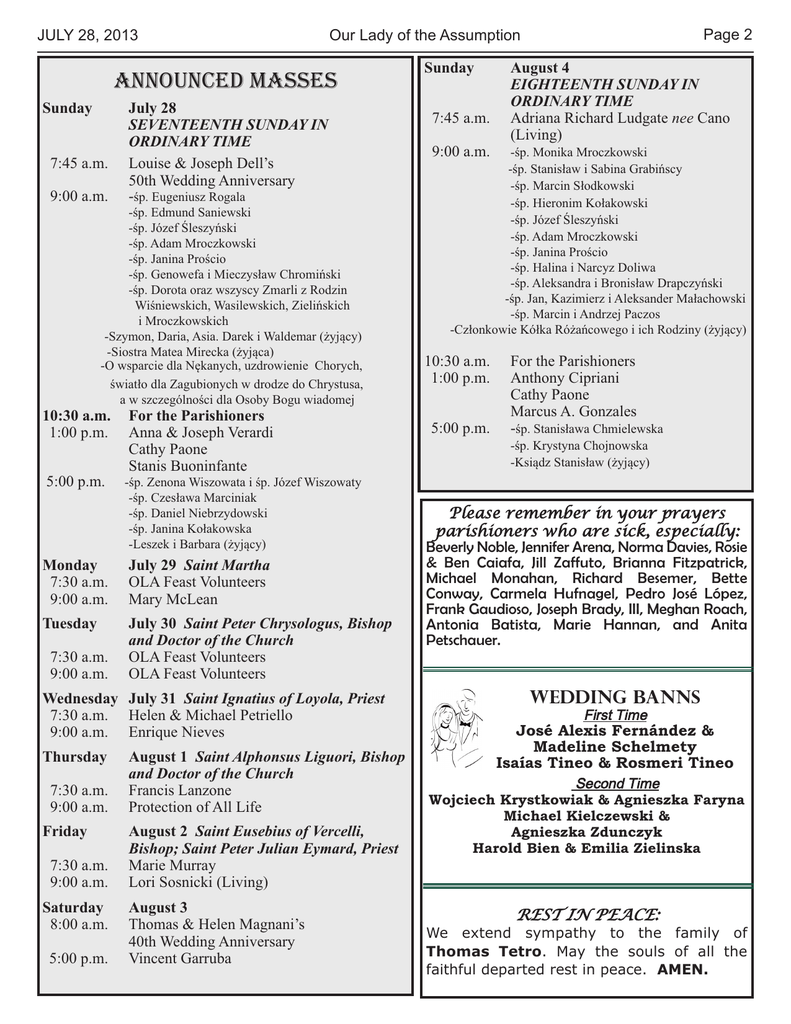 JULY 28, 2013 ANNOUNCED MASSES Sunday 7:45 a.m. 9:00 a.m. July 28 SEVENTEENTH SUNDAY IN ORDINARY TIME Louise & Joseph Dell’s 50th Wedding Anniversary -śp. Eugeniusz Rogala -śp. Edmund Saniewski -śp. Józef Śleszyński -śp. Adam Mroczkowski -śp. Janina Prościo -śp. Genowefa i Mieczysław Chromiński -śp. Dorota oraz wszyscy Zmarli z Rodzin Wiśniewskich, Wasilewskich, Zielińskich i Mroczkowskich -Szymon, Daria, Asia. Darek i Waldemar (żyjący) -Siostra Matea Mirecka (żyjąca) -O wsparcie dla Nękanych, uzdrowienie Chorych, światło dla Zagubionych w drodze do Chrystusa, a w szczególności dla Osoby Bogu wiadomej 10:30 a.m. 1:00 p.m. 5:00 p.m. Monday 7:30 a.m. 9:00 a.m. Tuesday 7:30 a.m. 9:00 a.m. For the Parishioners Anna & Joseph Verardi Cathy Paone Stanis Buoninfante -śp. Zenona Wiszowata i śp. Józef Wiszowaty -śp. Czesława Marciniak -śp. Daniel Niebrzydowski -śp. Janina Kołakowska -Leszek i Barbara (żyjący) July 29 Saint Martha OLA Feast Volunteers Mary McLean July 30 Saint Peter Chrysologus, Bishop and Doctor of the Church OLA Feast Volunteers OLA Feast Volunteers Wednesday July 31 Saint Ignatius of Loyola, Priest 7:30 a.m. Helen & Michael Petriello 9:00 a.m. Enrique Nieves Thursday 7:30 a.m. 9:00 a.m. Friday 7:30 a.m. 9:00 a.m. Saturday 8:00 a.m. 5:00 p.m. August 1 Saint Alphonsus Liguori, Bishop and Doctor of the Church Francis Lanzone Protection of All Life August 2 Saint Eusebius of Vercelli, Bishop; Saint Peter Julian Eymard, Priest Marie Murray Lori Sosnicki (Living) August 3 Thomas & Helen Magnani’s 40th Wedding Anniversary Vincent Garruba Page 2 Our Lady of the Assumption Sunday 7:45 a.m. 9:00 a.m. August 4 EIGHTEENTH SUNDAY IN ORDINARY TIME Adriana Richard Ludgate nee Cano (Living) -śp. Monika Mroczkowski -śp. Stanisław i Sabina Grabińscy -śp. Marcin Słodkowski -śp. Hieronim Kołakowski -śp. Józef Śleszyński -śp. Adam Mroczkowski -śp. Janina Prościo -śp. Halina i Narcyz Doliwa -śp. Aleksandra i Bronisław Drapczyński -śp. Jan, Kazimierz i Aleksander Małachowski -śp. Marcin i Andrzej Paczos -Członkowie Kółka Różańcowego i ich Rodziny (żyjący) 10:30 a.m. 1:00 p.m. 5:00 p.m. For the Parishioners Anthony Cipriani Cathy Paone Marcus A. Gonzales -śp. Stanisława Chmielewska -śp. Krystyna Chojnowska -Ksiądz Stanisław (żyjący) Please remember in your prayers parishioners who are sick, especially: Beverly Noble, Jennifer Arena, Norma Davies, Rosie & Ben Caiafa, Jill Zaffuto, Brianna Fitzpatrick, Michael Monahan, Richard Besemer, Bette Conway, Carmela Hufnagel, Pedro José López, Frank Gaudioso, Joseph Brady, III, Meghan Roach, Antonia Batista, Marie Hannan, and Anita Petschauer. WEDDING BANNS José Alexis Fernández & Madeline Schelmety Isaías Tineo & Rosmeri Tineo First Time Second Time Wojciech Krystkowiak & Agnieszka Faryna Michael Kielczewski & Agnieszka Zdunczyk Harold Bien & Emilia Zielinska REST IN PEACE: We extend sympathy to the family of Thomas Tetro. May the souls of all the faithful departed rest in peace. AMEN. JULY 28, 2013 Our Lady of the Assumption Registration for the 2013-2014 School Year Page 3 We are preparing for the 2013-2014 Religious Education school year and the registration process is already underway. At this time, you should be aware of the following: • Classes for the upcoming year will begin on Tuesday, October 1, 2013. • Religious Ed registration (and re-registration) will be conducted onTuesdays, Wednesdays, and Thursdays from July 16 through September 19. In July, office hours will be 2 PM to 5:30 PM. Hours for August (13th to 29th) will be Tuesdays, Wednesdays, and Thursdays, from 2:00PM to 7:00PM. September hours will be announced at Mass and published in the Church Bulletin. • All registration (and re-registration) must be done in person. You will complete a standard form for our records. There will be NO registration by mail this year. • If you are NOT a member of this parish, you must bring proof of membership at another parish; this is usually in the form of a church offering envelope, which has your name and number printed on it. • Registration Tuition Fee: Individual (1 child) $120 Family (2 or more children) $150 • Fees must be paid by check or in cash when you come in to register. There will be no refund of the fees once classes have begun. If you are registering for the first time: * Please bring your child’s Baptismal Certificate so we can make a copy for our records. This is necessary even if your child was baptized at OLA. (If your child has never been baptized, please bring the Birth Certificate.) * If your child has already received First Communion, please bring the First Communion Certificate (or other documentation) showing this. If you have any questions, call us at 842–3545. Thank you for your cooperation! Lou Mocci, Director of Religious Education 2014 MASS BOOK The 2014 Mass Book is now open. Please stop by the Rectory during office hours to arrange your Mass Intentions. No Masses may be arranged over the phone, and must done personally. The offering is $15.00 per Mass Intention. FEAST CHOIR REHEARSAL "The Feast Choir will have their next rehearsal on Wednesday, July 31st, from 7:30 - 9:00 PM in room 7 of the school building. All are welcome and invited to attend." SACRIFICIAL GIVING Parish Financial Summary Week of July 21, 2013 Weekly Budget $ 10,000.00 Collection $ 9,654.00 +/- $10,000 <$ 346.00> Year to date +$ 13,620.00 Mass Attendance 2265 Same week last year $ 9,350.00 Your kind and generous support of our parish is greatly appreciated. PLEASE NOTE CHANGES!!! MASS SCHEDULE Sunday, August 11, 2013 7:45AM English - Church 9:00AM Polish - Auditorium 10:30AM All Languages - Aud. 12:15PM Spanish - Auditorium 1:30PM English - Church Procession to the Shrine will follow the 10:30AM Mass August 6th-9th, and 12th-15th Novena to Our Lady of the Assumption After 9:00AM Mass. JULY 28, 2013 Our Lady of the Assumption Our Lady of the Assumption Parish Renovat