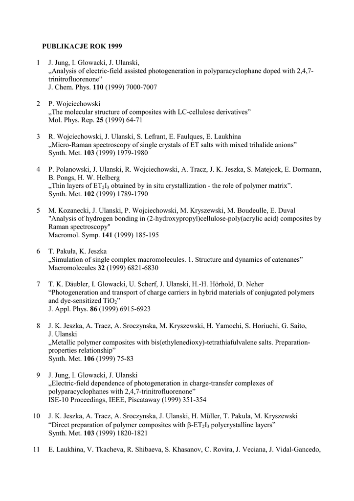 PUBLIKACJE ROK 1999 1 J. Jung, I. Glowacki, J. Ulanski, „Analysis of electric-field assisted photogeneration in polyparacyclophane doped with 2,4,7trinitrofluorenone" J. Chem. Phys. 110 (1999) 7000-7007 2 P. Wojciechowski „The molecular structure of composites with LC-cellulose derivatives” Mol. Phys. Rep. 25 (1999) 64-71 3 R. Wojciechowski, J. Ulanski, S. Lefrant, E. Faulques, E. Laukhina „Micro-Raman spectroscopy of single crystals of ET salts with mixed trihalide anions” Synth. Met. 103 (1999) 1979-1980 4 P. Polanowski, J. Ulanski, R. Wojciechowski, A. Tracz, J. K. Jeszka, S. Matejcek, E. Dormann, B. Pongs, H. W. Helberg „Thin layers of ET2I3 obtained by in situ crystallization - the role of polymer matrix”. Synth. Met. 102 (1999) 1789-1790 5 M. Kozanecki, J. Ulanski, P. Wojciechowski, M. Kryszewski, M. Boudeulle, E. Duval "Analysis of hydrogen bonding in (2-hydroxypropyl)cellulose-poly(acrylic acid) composites by Raman spectroscopy" Macromol. Symp. 141 (1999) 185-195 6 T. Pakuła, K. Jeszka „Simulation of single complex macromolecules. 1. Structure and dynamics of catenanes” Macromolecules 32 (1999) 6821-6830 7 T. K. Däubler, I. Glowacki, U. Scherf, J. Ulanski, H.-H. Hörhold, D. Neher “Photogeneration and transport of charge carriers in hybrid materials of conjugated polymers and dye-sensitized TiO2” J. Appl. Phys. 86 (1999) 6915-6923 8 J. K. Jeszka, A. Tracz, A. Sroczynska, M. Kryszewski, H. Yamochi, S. Horiuchi, G. Saito, J. Ulanski „Metallic polymer composites with bis(ethylenedioxy)-tetrathiafulvalene salts. Preparationproperties relationship” Synth. Met. 106 (1999) 75-83 9 J. Jung, I. Glowacki, J. Ulanski „Electric-field dependence of photogeneration in charge-transfer complexes of polyparacyclophanes with 2,4,7-trinitrofluorenone” ISE-10 Proceedings, IEEE, Piscataway (1999) 351-354 10 J. K. Jeszka, A. Tracz, A. Sroczynska, J. Ulanski, H. Müller, T. Pakula, M. Kryszewski “Direct preparation of polymer composites with β-ET2I3 polycrystalline layers” Synth. Met. 103 (1999) 1820-1821 11 E. Laukhina, V. Tkacheva, R. Shibaeva, S. Khasanov, C. Rovira, J. Veciana, J. Vidal-Gancedo, A. Tracz, J. K. Jeszka, A. Sroczynska, R. Wojciechowski, J. Ulanski, V. Laukhina „New conducting molecular metal/polycarbonate bilayered composites: (ET)2IBr2/PC-, (BET)2IBr2/PC- and (BET)2I3/PC-films” Synth. Met. 102 (1999) 1785-1786 12 A. Tracz, J. K. Jeszka, T. Pakula “Does β-ET2I3 really have a definite interlayer spacing?” Synth. Met. 103 (1999) 1972-1973 13 M. Kozanecki, P. Wojciechowski, J. Ulański „Zastosowanie spektroskopii Ramana do określenia struktury nadcząsteczkowej poli(kwasu metakrylowego) w anizotropowych kompozytach z ciekłokrystalicznymi pochodnymi celulozy” Biuletyn Instytutu Chemii Fizycznej i Teoretycznej Politechniki Wrocławskiej; 7 (1999) 87-93 14 M. Kryszewski “Mikroskopia ramanowska, niektóre uzyskane wyniki i oczekiwania” Biuletyn Instytutu Chemii Fizycznej i Teoretycznej Politechniki Wrocławskiej; 7 (1999) 17-24 Wykaz referatów i komunikatów przygotowanych w Katedrze Fizyki Molekularnej Wydziału Chemicznego PŁ w roku 1999 1. R.Wojciechowski, J.Ulański, S.Lefrant, E.Faulques „In situ Raman spectroscopy of thermal phase transformation of ET2I3 polycrystalline network in polymer film” Electrical and related properties of organic solids ERPOS-8, Szklarska Poręba, Poland, 2630.06.1999 2. R.Wojciechowski, J.Ulanski, S.Lefrant, E.Faulques, E.Laukhina “Low frequency Raman spectroscopy of β-ET2IclBr single crystals Electrical and related properties of organic solids ERPOS-8, Szklarska Poręba, Poland, 2630.06.1999 3. P.Polanowski, J.Ulanski, R.Wojciechowski, A.Tracz, V.Tkacheva, E.Laukhina, E.Dorman “Influence of polymer matrix on conducting properties of composites containing ET2I3 salts” Electrical and related properties of organic solids ERPOS-8, Szklarska Poręba, Poland, 2630.06.1999 4. I.Głowacki, E.Dobruchowska, J.Ulanski „Thermoluminescence of N-carbazolyl-substituted silane homo- and copolymers” Electrical and related properties of organic solids ERPOS-8, Szklarska Poręba, Poland, 2630.06.1999 5. I.Glowacki, J.Jung, J.Ulanski “Photoconductivity of N-carbazolyl-substituted polysilanes and their CT complexes with TNF” Electrical and related properties of organic solids ERPOS-8, Szklarska Poręba, Poland, 2630.06.1999 6. A.Tracz, J.K.Jeszka, A.Brau, I.Smirani, J.P.Farges “Perfection of polycrystalline ET2I3 as studied by Raman spectroscopy” Electrical and related properties of organic solids ERPOS-8, Szklarska Poręba, Poland, 2630.06.1999 7. M.Kryszewski “Nano-intercalates-novelclass of materials with promising properties” Electrical and related properties of organic solids ERPOS-8, Szklarska Poręba, Poland, 2630.06.1999 8. K.Friedrich, J.Ulanski, G.Boiteux, G.Seytre “Evolutions of conductivity and ion mobility during isothermal curing epoxy resins” VIIIeme Colloque Franco-Polonais, Ruciane – Nida, Poland, 26-30.05.1999 9. L.Okrasa, J.Ulanski, P.Wojciechowski, G.Boiteux, G.Seytre “Relaxation processes in anisotropic polymer composites containing liquid crystalline cellulose derivative” VIIIeme Colloque Franco-Polonais, Ruciane – Nida, Poland, 26-30.05.1999 10. M.Kozanecki, E.Duval, J.Ulanski, L.Okrasa, M.Boudeulle, P.Wojciechoski, M.Kryszewski, L.Saviot “Raman spectroscopy of anisotropic composites of poly(acrylic acid) and poly(metacrylic acid) with liquid crystalline cellulose derivatives: structure and intermolecular interaction” VIIIeme Colloque Franco-Polonais, Ruciane – Nida, Poland, 26-30.05.1999 11. J.Jung, I.Glowacki, J.Ulanski “Role of charge-transfer complex in electric-field assisted photogeneration in polyparacyclophanes” The 4th International Symposium on Fuctional Dyes, Osaka, Japan, 31.05-04.06.1999 12. J.Ulanski, K.Yakushi, M.Uruichi, O.Drozdova, H.Yamochi, G.Saito “Re-examination of bromide, chloride and iodide salts of bis(ethylenedioxy)tetrath