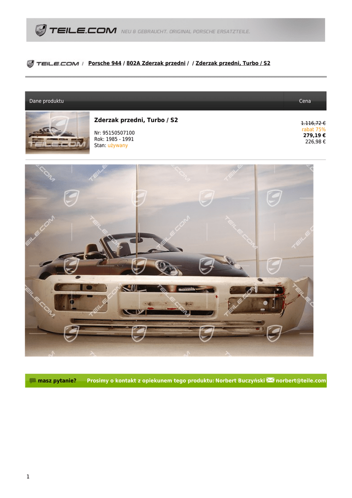Porsche 944 / 802A Zderzak przedni / / Zderzak przedni, Turbo / S2 Dane produktu Cena Zderzak przedni, Turbo / S2 Nr: 95150507100 Rok: 1985 - 1991 Stan: używany masz pytanie? 1 Prosimy o kontakt z opiekunem tego produktu: Norbert Buczyński 1.116,72 € rabat 75% 279,19 € 226,98 € [email protected] 2