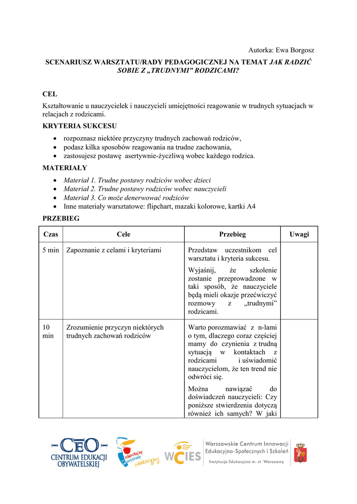 Autorka: Ewa Borgosz SCENARIUSZ WARSZTATU/RADY PEDAGOGICZNEJ NA TEMAT JAK RADZIĆ SOBIE Z „TRUDNYMI” RODZICAMI? CEL Kształtowanie u nauczycielek i nauczycieli umiejętności reagowanie w trudnych sytuacjach w relacjach z rodzicami. KRYTERIA SUKCESU rozpoznasz niektóre przyczyny trudnych zachowań rodziców, podasz kilka sposobów reagowania na trudne zachowania, zastosujesz postawę asertywnie-życzliwą wobec każdego rodzica. MATERIAŁY Materiał 1. Trudne postawy rodziców wobec dzieci Materiał 2. Trudne postawy rodziców wobec nauczycieli Materiał 3. Co może denerwować rodziców Inne materiały warsztatowe: flipchart, mazaki kolorowe, kartki A4 PRZEBIEG Czas 5 min Cele Zapoznanie z celami i kryteriami Przebieg Przedstaw uczestnikom cel warsztatu i kryteria sukcesu. Wyjaśnij, że szkolenie zostanie przeprowadzone w taki sposób, że nauczyciele będą mieli okazje przećwiczyć rozmowy z „trudnymi” rodzicami. 10 min Zrozumienie przyczyn niektórych trudnych zachowań rodziców Warto porozmawiać z n-lami o tym, dlaczego coraz częściej mamy do czynienia z trudną sytuacją w kontaktach z rodzicami i uświadomić nauczycielom, że ten trend nie odwróci się. Można nawiązać do doświadczeń nauczycieli: Czy poniższe stwierdzenia dotyczą również ich samych? W jaki Uwagi sposób? Kiedy coś mi zaczyna dolegać – sprawdzam w Internecie, o czym świadczą objawy i gdy idę do lekarza, już mam pewna orientację co do mojej ewentualnej choroby. Potem zaglądam na fora, żeby poznać opinie o przepisanych lekach i o lekarzu... To samo robią w odniesieniu do metod nauczania itp. 30 min Określenie trudnych zachowań rodziców w szkole rodzice szkoły, Wyjaśnij zasady rozmowy w parach i określ czas na wypowiedzi poszczególnych osób. Rozdaj nauczycielom kartki, na których będą mogli zapisać odpowiedzi na pytania na kolejnym slajdzie. Odpowiedzi zapisuje w skrócie osoba, która słucha! Nauczyciele odpowiadają na wszystkie pytania. 1. Opisz trudne spotkanie z rodzicem, które do dziś Cię prześladuje. Wyjaśnij, dlaczego tak się dzieje. 2. Jakie jest Twoim zdaniem największe wyzwanie we współpracy z takim rodzicem? 3. Jak strategia może być Twoim zdaniem najbardziej pomocna w pracy z takim rodzicem? 4. Czego chciałabyś się dowiedzieć o pracy z takim rodzicem? Najpierw opowiada osoba A, Kartki, długopisy, flipcharty, flamastry a potem B. Jeśli ktoś pracuje w szkole krótko i nie ma jeszcze tego rodzaju doświadczeń, zamiast trudnego spotkania z rodzicem może przypomnieć sobie inna sytuację – np. w urzędzie, firmie usługowej, na studiach czy w sklepie. Po tym ćwiczeniu poproś nauczycieli o podzielenie się swoimi przemyśleniami. Na jednym plakacie w trzech kolumnach zapisz odpowiedzi na trzy pierwsze pytania. Po każdej wypowiedzi zapytaj, czy ktoś miał podobny „trudny przypadek” – wówczas do problemu dopisz tylko wyzwanie i strategię (jeśli pojawia się różne). Na osobnym plakacie zapisz pytania. 20 min Klasyfikacja trudnych zachowań rodziców i poznanie sposobów reagowania na nie Sprawdźcie wspólnie z Materiał 1 nauczycielami, które z Materiał 2 „trudnych” postaw rodziców mieszczą się w podanych na kategoriach: zaniedbywanie nadopiekuńczość perfekcjonizm. Rozdaj materiał 1 (Trudne postawy rodziców wobec dziecka) i poproś o zapoznanie się z nim. Przedstaw kolejne trudne postawy, tym razem związane z relacjami i oczekiwaniami wobec nauczycieli – rodzic perfekcjonista, rodzic bezradny, rodzic wrogi i kłótliwy. Rozdaj materiał 2 (Trudne postawy rodziców wobec nauczycieli) i poproś o zapoznanie się z nim. 30 min Zastosowanie w praktyce sposobów reagowania. Kolejnym ćwiczeniem symulacja rozmowy „trudnym” rodzicem. jest z Każdy nauczyciel wybiera sytuację, którą chciałby przećwiczyć – może to być sytuacja o której opowiadał w poprzednim ćwiczeniu. Najlepiej, jeśli pary są te same, bo wówczas każdy z nauczycieli zna sytuację. Zadaniem jest przećwiczenie innej strategii. Jeden z nauczycieli pozostaje w swojej roli, a drugi wciela się w rolę rodzica. Po symulacji nauczyciele omawiają swoje refleksje i odczucia. Można to ćwiczenie przeprowadzić w inny sposób – połączyć dwie pary o wówczas dwie osoby są obserwatorami w czasie odgrywania scenek. Tylko to zabierze o wiele więcej czasu. 15 min Uświadomienie wpływu szkoły i nauczycieli na postawy rodziców Warto podkreślić, że zdarza Materiał 3 się tak, że sami wprowadzamy rodziców w stan podenerwowania – dodatkowe informacje znajdziesz w materiale nr 3. Zapytaj uczestników: O co powinniśmy zadbać w relacjach z rodzicami, żeby uniknąć trudnych sytuacji, zapobiec im? Jeśli zabraknie czasu – rozdaj materiał 3. Przeczytanie i przedyskutowanie go można zadać jako pracę domową. 15 min Podsumowanie i refleksja W podsumowaniu poproś nauczycieli o refleksję: Co zmienię/zastosuję/zapamiętam. Sprawdź, czy na wszystkie pytania z plakatu „Czego chciałabyś się dowiedzieć o pracy z takim rodzicem?” Wykreśl te, pytania, na które odpowiedź nauczyciele uzyskali, dopisz te, które nauczyciele podadzą w rundce końcowej. Jako pracę domową można zadać przećwiczenie w praktyce poznanych technik.