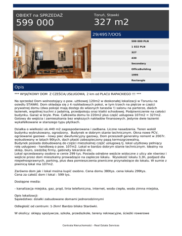 OBIEKT na SPRZEDAŻ 599 000 Toruń, Stawki 327 m2 29/4957/OOS 599 000 PLN 1 832 PLN 327 430 Secondary OfficeBuilding 1995 Rectangle Opis *** WYJĄTKOWY DOM Z CZEŚCIĄ USŁUGOWĄ 2 km od PLACU RAPACKIEGO !!! *** Na sprzedaż Dom wolnostojący o pow. użtkowej 120m2 w doskonałej lokalizacji w Toruniu na osiedlu STAWKI. Dom składaja się z 4 rozkładowych pokoi, w tym trzech na piętrze w części prywatnej domu (dwa pokoje mają dostęp do własnych tarasów !) salonu na parterze, dwóch łazienek, wspólnej kuchni z jadalnią, przedpokoju oraz klatki schodowej. Podpiwniczenie na całości budynku. Garaż w bryle. Pow. Całkowita domu to 220m2 plus część usługowa 107m2 = 327m2. Gotowy do wejścia i zamieszkania bez większych nakładów finansowych. Jedynie dwie łazienki wykafelkowane w starszego typu płytkach. Działka o wielkości ok.440 m2 zagospodarowana i zadbana. Liczne nasadzenia. Teren wokół budynku wybrukowany, ogrodzony. Budynek w dobrym stanie technicznym. Okna nowe PCV, ogrzewanie gazowe - nowy piec dwufunkcyjny gazowy, Dom przeszedł generalny remont w 2007r. wybudowany w latach 90tych, dach płaski zabezpieczony papą termozgrzewalną. Budynek posiada dobudowaną do części mieszkalnej część usługową tj. lokal użytkowy pełniący rolę usługowo - handlową o pow. 107m2. Lokal w bardzo dobrym stanie technicznym. Idealny na sklep, biuro, siedzibę firmy, gabinety lekarskie etc. Lokal sprzedawany osobno w cenie 299 tys. Posiada odrębne wejście widoczne z ulicy ale równiez i wejście przez dom mieszkalny prowadzące na zaplecze lokalu. Wysokość lokalu 3,3h, podjazd dla niepełnosprawnych, parking, plus dwa pomieszczenia piwniczne przynależące do lokalu. W sumie z piwinicą lokal ma 107m2. Zarówno dom jak i lokal można kupić osobno. Cena domu 380tys. cena lokalu 299tys. Cena za całość dom i lokal : 599 tys. Dostępne media: - kanalizacja miejska, gaz, prąd, linia telefoniczna, internet, woda ciepła, woda zimna miejska, Opis lokalizacji: Sąsiedztwo: działki zabudowane domami jednorodzinnymi Odległość od centrum: 1-2km! Bardzo blisko Starówki. W okolicy: sklepy spożywcze, szkoła, przedszkole, tereny rekreacyjne, ścieżki rowerowe Centrala Nieruchomości - Real Estate Services spacerowe, piekarnia, cukiernia, liczne punkty usługowe, ośrodek zdrowia Dojazd: asfalt, następnie droga utwardzona Komunikacja: autobus miejski, gimbus szkolny, przystanek 100m Szybki Termin wydania nieruchomości! Cena: Dom: 380 000 PLN Lokal użytkowy: 299 000 PLN Dom i lokal razem za : 599 000 PLN POLECAM !!! *********** KAROLINA RUTKOWSKA tel. 663 899 715 ********** Centrala Nieruchomości: ZAPEWNIAMY BEZPŁATNE I PROFESJONALNE DORADZTWO ZARÓWNO W ZAKRESIE NIERUCHOMOŚCI JAK I POZYSKIWANIU POD NIE KREDYTÓW HIPOTECZNYCH Powyższe informacje zostały sporządzone na podstawie oświadczeń właścicieli i nie są ofertą w rozumieniu przepisów Kodeksu Cywilnego. Mają one jedynie charakter informacyjny. Większość naszych klientów pochodzi z polecenia - ZAUFAJ NAM I TY I NIE CZEKAJ, AŻ KTOŚ CIĘ WYPRZEDZI! Zadzwoń i umów się na prezentację ! Nr licencji pośrednika odpowiedzialnego za wykonanie umowy pośrednictwa 14260. zobacz inne nasze oferty na www.centralanieruchomosci.pl facebook.com/Centrala.N Karolina Rutkowska tel. (+48) 663 899 715 email: [email protected] Centrala Nieruchomości - Real Estate Services Powered by TCPDF (www.tcpdf.org)