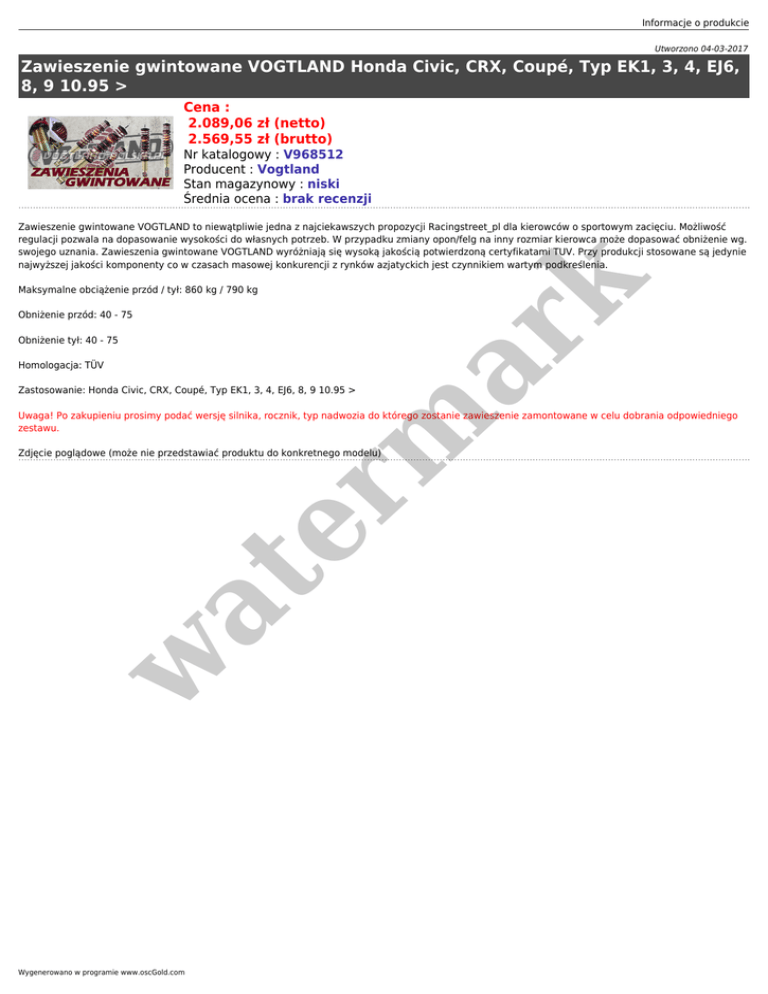 Informacje o produkcie Utworzono 04-03-2017 Zawieszenie gwintowane VOGTLAND Honda Civic, CRX, Coupé, Typ EK1, 3, 4, EJ6, 8, 9 10.95 > Cena : 2.089,06 zł (netto) 2.569,55 zł (brutto) Nr katalogowy : V968512 Producent : Vogtland Stan magazynowy : niski Średnia ocena : brak recenzji er m ar k Zawieszenie gwintowane VOGTLAND to niewątpliwie jedna z najciekawszych propozycji Racingstreet_pl dla kierowców o sportowym zacięciu. Możliwość regulacji pozwala na dopasowanie wysokości do własnych potrzeb. W przypadku zmiany opon/felg na inny rozmiar kierowca może dopasować obniżenie wg. swojego uznania. Zawieszenia gwintowane VOGTLAND wyróżniają się wysoką jakością potwierdzoną certyfikatami TUV. Przy produkcji stosowane są jedynie najwyższej jakości komponenty co w czasach masowej konkurencji z rynków azjatyckich jest czynnikiem wartym podkreślenia. Maksymalne obciążenie przód / tył: 860 kg / 790 kg Obniżenie przód: 40 - 75 Obniżenie tył: 40 - 75 Homologacja: TÜV Zastosowanie: Honda Civic, CRX, Coupé, Typ EK1, 3, 4, EJ6, 8, 9 10.95 > Uwaga! Po zakupieniu prosimy podać wersję silnika, rocznik, typ nadwozia do którego zostanie zawieszenie zamontowane w celu dobrania odpowiedniego zestawu. w at Zdjęcie poglądowe (może nie przedstawiać produktu do konkretnego modelu) Wygenerowano w programie www.oscGold.com
