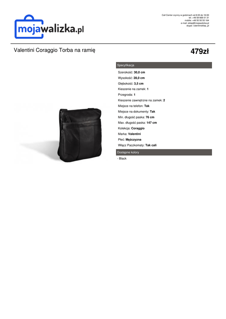 Call Center czynny w godzinach od 8:00 do 16:00 tel. +48 58 668 01 31 mobile: +48 50 50 50 164 e-mail: [email protected] skype: valentinisklep_pl 479zł Valentini Coraggio Torba na ramię Specyfikacja Szerokość: 30,0 cm Wysokość: 28,0 cm Głębokość: 3,5 cm Kieszenie na zamek: 1 Przegroda: 1 Kieszenie zawnętrzne na zamek: 2 Miejsce na telefon: Tak Miejsce na dokumenty: Tak Min. długość paska: 76 cm Max. długość paska: 147 cm Kolekcja: Coraggio Marka: Valentini Płeć: Mężczyzna Włącz Paczkomaty: Tak cali Dostępne kolory - Black Powered by TCPDF (www.tcpdf.org)
