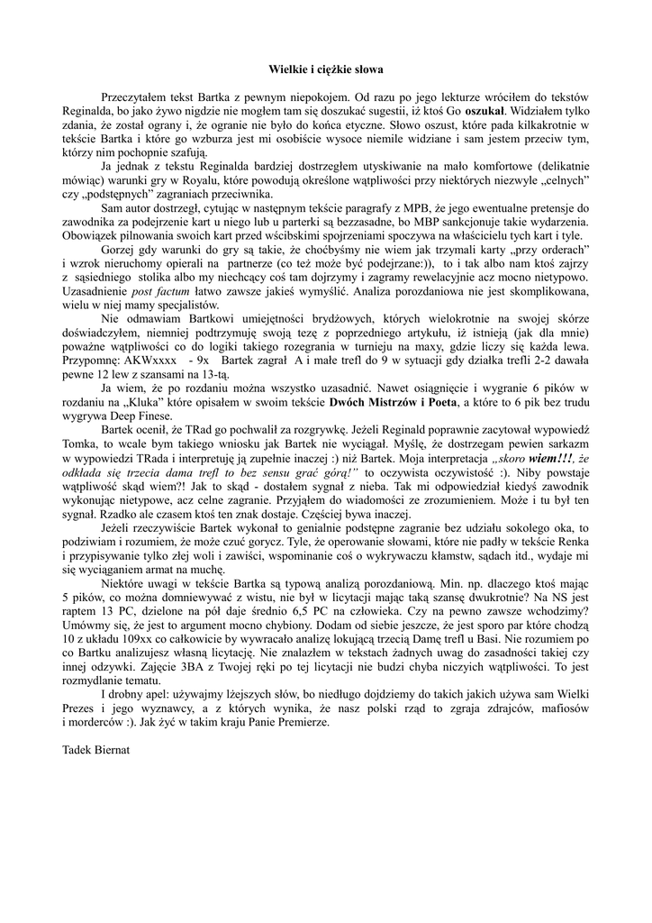 Wielkie i ciężkie słowa Przeczytałem tekst Bartka z pewnym niepokojem. Od razu po jego lekturze wróciłem do tekstów Reginalda, bo jako żywo nigdzie nie mogłem tam się doszukać sugestii, iż ktoś Go oszukał. Widziałem tylko zdania, że został ograny i, że ogranie nie było do końca etyczne. Słowo oszust, które pada kilkakrotnie w tekście Bartka i które go wzburza jest mi osobiście wysoce niemile widziane i sam jestem przeciw tym, którzy nim pochopnie szafują. Ja jednak z tekstu Reginalda bardziej dostrzegłem utyskiwanie na mało komfortowe (delikatnie mówiąc) warunki gry w Royalu, które powodują określone wątpliwości przy niektórych niezwyle „celnych” czy „podstępnych” zagraniach przeciwnika. Sam autor dostrzegł, cytując w następnym tekście paragrafy z MPB, że jego ewentualne pretensje do zawodnika za podejrzenie kart u niego lub u parterki są bezzasadne, bo MBP sankcjonuje takie wydarzenia. Obowiązek pilnowania swoich kart przed wścibskimi spojrzeniami spoczywa na właścicielu tych kart i tyle. Gorzej gdy warunki do gry są takie, że choćbyśmy nie wiem jak trzymali karty „przy orderach” i wzrok nieruchomy opierali na partnerze (co też może być podejrzane:)), to i tak albo nam ktoś zajrzy z sąsiedniego stolika albo my niechcący coś tam dojrzymy i zagramy rewelacyjnie acz mocno nietypowo. Uzasadnienie post factum łatwo zawsze jakieś wymyślić. Analiza porozdaniowa nie jest skomplikowana, wielu w niej mamy specjalistów. Nie odmawiam Bartkowi umiejętności brydżowych, których wielokrotnie na swojej skórze doświadczyłem, niemniej podtrzymuję swoją tezę z poprzedniego artykułu, iż istnieją (jak dla mnie) poważne wątpliwości co do logiki takiego rozegrania w turnieju na maxy, gdzie liczy się każda lewa. Przypomnę: AKWxxxx - 9x Bartek zagrał A i małe trefl do 9 w sytuacji gdy działka trefli 2-2 dawała pewne 12 lew z szansami na 13-tą. Ja wiem, że po rozdaniu można wszystko uzasadnić. Nawet osiągnięcie i wygranie 6 pików w rozdaniu na „Kluka” które opisałem w swoim tekście Dwóch Mistrzów i Poeta, a które to 6 pik bez trudu wygrywa Deep Finese. Bartek ocenił, że TRad go pochwalił za rozgrywkę. Jeżeli Reginald poprawnie zacytował wypowiedź Tomka, to wcale bym takiego wniosku jak Bartek nie wyciągał. Myślę, że dostrzegam pewien sarkazm w wypowiedzi TRada i interpretuję ją zupełnie inaczej :) niż Bartek. Moja interpretacja „skoro wiem!!!, że odkłada się trzecia dama trefl to bez sensu grać górą!” to oczywista oczywistość :). Niby powstaje wątpliwość skąd wiem?! Jak to skąd - dostałem sygnał z nieba. Tak mi odpowiedział kiedyś zawodnik wykonując nietypowe, acz celne zagranie. Przyjąłem do wiadomości ze zrozumieniem. Może i tu był ten sygnał. Rzadko ale czasem ktoś ten znak dostaje. Częściej bywa inaczej. Jeżeli rzeczywiście Bartek wykonał to genialnie podstępne zagranie bez udziału sokolego oka, to podziwiam i rozumiem, że może czuć gorycz. Tyle, że operowanie słowami, które nie padły w tekście Renka i przypisywanie tylko złej woli i zawiści, wspominanie coś o wykrywaczu kłamstw, sądach itd., wydaje mi się wyciąganiem armat na muchę. Niektóre uwagi w tekście Bartka są typową analizą porozdaniową. Min. np. dlaczego ktoś mając 5 pików, co można domniewywać z wistu, nie był w licytacji mając taką szansę dwukrotnie? Na NS jest raptem 13 PC, dzielone na pół daje średnio 6,5 PC na człowieka. Czy na pewno zawsze wchodzimy? Umówmy się, że jest to argument mocno chybiony. Dodam od siebie jeszcze, że jest sporo par które chodzą 10 z układu 109xx co całkowicie by wywracało analizę lokującą trzecią Damę trefl u Basi. Nie rozumiem po co Bartku analizujesz własną licytację. Nie znalazłem w tekstach żadnych uwag do zasadności takiej czy innej odzywki. Zajęcie 3BA z Twojej ręki po tej licytacji nie budzi chyba niczyich wątpliwości. To jest rozmydlanie tematu. I drobny apel: używajmy lżejszych słów, bo niedługo dojdziemy do takich jakich używa sam Wielki Prezes i jego wyznawcy, a z których wynika, że nasz polski rząd to zgraja zdrajców, mafiosów i morderców :). Jak żyć w takim kraju Panie Premierze. Tadek Biernat