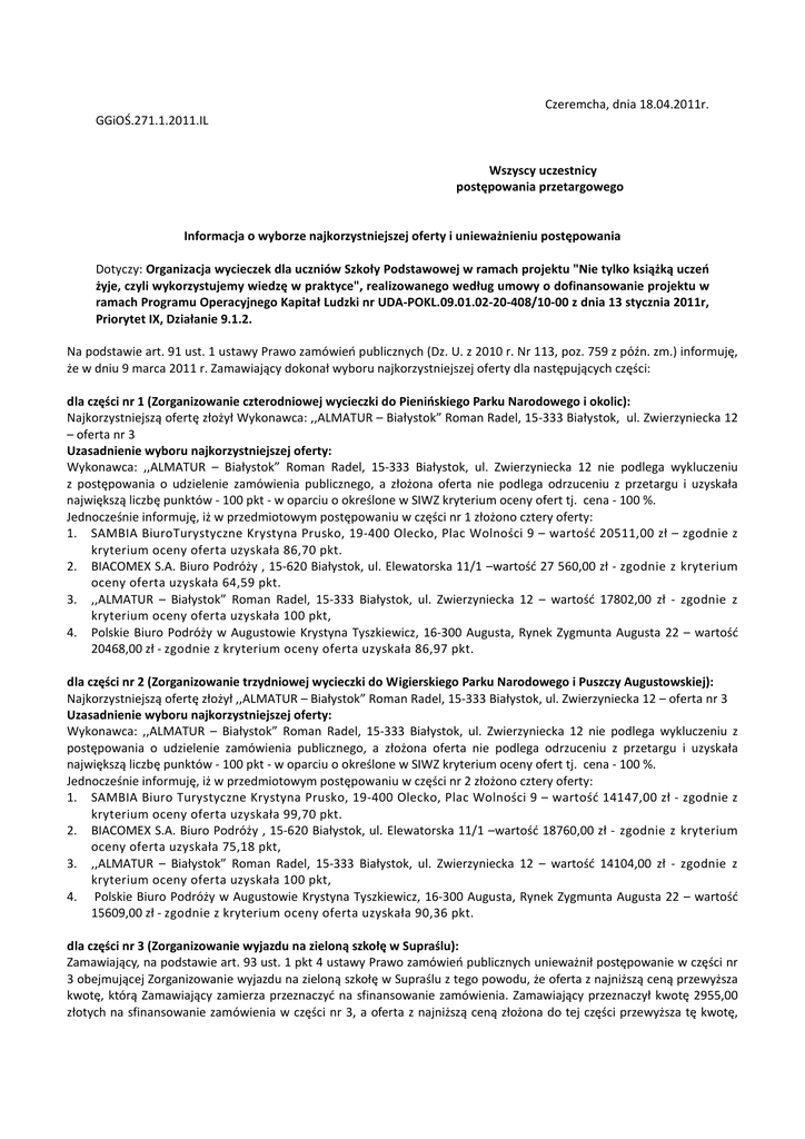 Czeremcha, dnia 18.04.2011r. GGiOŚ.271.1.2011.IL Wszyscy uczestnicy postępowania przetargowego Informacja o wyborze najkorzystniejszej oferty i unieważnieniu postępowania Dotyczy: Organizacja wycieczek dla uczniów Szkoły Podstawowej w ramach projektu "Nie tylko książką uczeń żyje, czyli wykorzystujemy wiedzę w praktyce", realizowanego według umowy o dofinansowanie projektu w ramach Programu Operacyjnego Kapitał Ludzki nr UDA-POKL.09.01.02-20-408/10-00 z dnia 13 stycznia 2011r, Priorytet IX, Działanie 9.1.2. Na podstawie art. 91 ust. 1 ustawy Prawo zamówień publicznych (Dz. U. z 2010 r. Nr 113, poz. 759 z późn. zm.) informuję, że w dniu 9 marca 2011 r. Zamawiający dokonał wyboru najkorzystniejszej oferty dla następujących części: dla części nr 1 (Zorganizowanie czterodniowej wycieczki do Pienińskiego Parku Narodowego i okolic): Najkorzystniejszą ofertę złożył Wykonawca: ,,ALMATUR – Białystok” Roman Radel, 15-333 Białystok, ul. Zwierzyniecka 12 – oferta nr 3 Uzasadnienie wyboru najkorzystniejszej oferty: Wykonawca: ,,ALMATUR – Białystok” Roman Radel, 15-333 Białystok, ul. Zwierzyniecka 12 nie podlega wykluczeniu z postępowania o udzielenie zamówienia publicznego, a złożona oferta nie podlega odrzuceniu z przetargu i uzyskała największą liczbę punktów - 100 pkt - w oparciu o określone w SIWZ kryterium oceny ofert tj. cena - 100 %. Jednocześnie informuję, iż w przedmiotowym postępowaniu w części nr 1 złożono cztery oferty: 1. SAMBIA BiuroTurystyczne Krystyna Prusko, 19-400 Olecko, Plac Wolności 9 – wartość 20511,00 zł – zgodnie z kryterium oceny oferta uzyskała 86,70 pkt. 2. BIACOMEX S.A. Biuro Podróży , 15-620 Białystok, ul. Elewatorska 11/1 –wartość 27 560,00 zł - zgodnie z kryterium oceny oferta uzyskała 64,59 pkt. 3. ,,ALMATUR – Białystok” Roman Radel, 15-333 Białystok, ul. Zwierzyniecka 12 – wartość 17802,00 zł - zgodnie z kryterium oceny oferta uzyskała 100 pkt, 4. Polskie Biuro Podróży w Augustowie Krystyna Tyszkiewicz, 16-300 Augusta, Rynek Zygmunta Augusta 22 – wartość 20468,00 zł - zgodnie z kryterium oceny oferta uzyskała 86,97 pkt. dla części nr 2 (Zorganizowanie trzydniowej wycieczki do Wigierskiego Parku Narodowego i Puszczy Augustowskiej): Najkorzystniejszą ofertę złożył ,,ALMATUR – Białystok” Roman Radel, 15-333 Białystok, ul. Zwierzyniecka 12 – oferta nr 3 Uzasadnienie wyboru najkorzystniejszej oferty: Wykonawca: ,,ALMATUR – Białystok” Roman Radel, 15-333 Białystok, ul. Zwierzyniecka 12 nie podlega wykluczeniu z postępowania o udzielenie zamówienia publicznego, a złożona oferta nie podlega odrzuceniu z przetargu i uzyskała największą liczbę punktów - 100 pkt - w oparciu o określone w SIWZ kryterium oceny ofert tj. cena - 100 %. Jednocześnie informuję, iż w przedmiotowym postępowaniu w części nr 2 złożono cztery oferty: 1. SAMBIA Biuro Turystyczne Krystyna Prusko, 19-400 Olecko, Plac Wolności 9 – wartość 14147,00 zł - zgodnie z kryterium oceny oferta uzyskała 99,70 pkt. 2. BIACOMEX S.A. Biuro Podróży , 15-620 Białystok, ul. Elewatorska 11/1 –wartość 18760,00 zł - zgodnie z kryterium oceny oferta uzyskała 75,18 pkt, 3. ,,ALMATUR – Białystok” Roman Radel, 15-333 Białystok, ul. Zwierzyniecka 12 – wartość 14104,00 zł - zgodnie z kryterium oceny oferta uzyskała 100 pkt, 4. Polskie Biuro Podróży w Augustowie Krystyna Tyszkiewicz, 16-300 Augusta, Rynek Zygmunta Augusta 22 – wartość 15609,00 zł - zgodnie z kryterium oceny oferta uzyskała 90,36 pkt. dla części nr 3 (Zorganizowanie wyjazdu na zieloną szkołę w Supraślu): Zamawiający, na podstawie art. 93 ust. 1 pkt 4 ustawy Prawo zamówień publicznych unieważnił postępowanie w części nr 3 obejmującej Zorganizowanie wyjazdu na zieloną szkołę w Supraślu z tego powodu, że oferta z najniższą ceną przewyższa kwotę, którą Zamawiający zamierza przeznaczyć na sfinansowanie zamówienia. Zamawiający przeznaczył kwotę 2955,00 złotych na sfinansowanie zamówienia w części nr 3, a oferta z najniższą ceną złożona do tej części przewyższa tę kwotę, przy czym Zamawiający nie może zwiększyć tej kwoty do poziomu ceny najkorzystniejszej oferty, z powodu ograniczonych środków finansowych. dla części nr 4 (Zorganizowanie czterodniowej wycieczki do Słowińskiego Parku Narodowego i okolic): Zamawiający, na podstawie art. 93 ust. 1 pkt 4 ustawy Prawo zamówień publicznych unieważnił postępowanie w części nr 4 obejmującej Zorganizowanie czterodniowej wycieczki do Słowińskiego Parku Narodowego i okolic z tego powodu, że oferta z najniższą ceną przewyższa kwotę, którą Zamawiający zamierza przeznaczyć na sfinansowanie zamówienia. Zamawiający przeznaczył kwotę 20000,00 złotych na sfinansowanie zamówienia w części nr 4, a oferta z najniższą ceną złożona do tej części przewyższa tę kwotę, przy czym Zamawiający nie może zwiększyć tej kwoty do poziomu ceny najkorzystniejszej oferty, z powodu ograniczonych środków finansowych. dla części nr 5 (Zorganizowanie jednodniowej wycieczki do Białowieskiego Parku Narodowego): Zamawiający, na podstawie art. 93 ust. 1 pkt 4 ustawy Prawo zamówień publicznych unieważnił postępowanie w części nr 5 obejmującej Zorganizowanie jednodniowej wycieczki do Białowieskiego Parku Narodowego z tego powodu, że oferta z najniższą ceną przewyższa kwotę, którą Zamawiający zamierza przeznaczyć na sfinansowanie zamówienia. Zamawiający przeznaczył kwotę 1610,00 złotych na sfinansowanie zamówienia w części nr 5, a oferta z najniższą ceną złożona do tej części przewyższa tę kwotę, przy czym Zamawiający nie może zwiększyć tej kwoty do poziomu ceny najkorzystniejszej oferty, z powodu ograniczonych środków finansowych. Działając na podstawie art. 92 ust. 1 pkt. 2 Prawa zamówień publicznych, Zamawiający zawiadamia, że w prowadzonym p