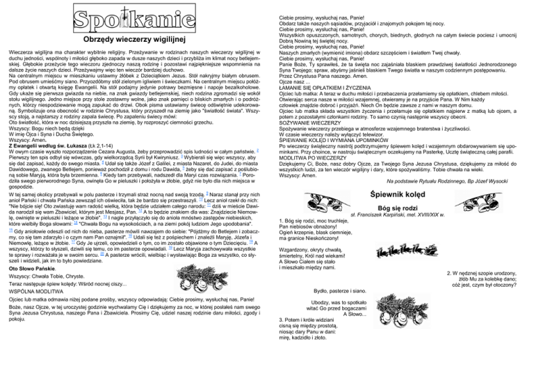 Obrzędy wieczerzy wigilijnej Wieczerza wigilijna ma charakter wybitnie religijny. Przeżywanie w rodzinach naszych wieczerzy wigilijnej w duchu jedności, wspólnoty i miłości głęboko zapada w dusze naszych dzieci i przybliża im klimat nocy betlejemskiej. Głębokie przeżycie tego wieczoru zjednoczy naszą rodzinę i pozostawi najpiękniejsze wspomnienia na dalsze życie naszych dzieci. Przeżywajmy więc ten wieczór bardziej duchowo. Na centralnym miejscu w mieszkaniu ustawmy żłóbek z Dzieciątkiem Jezus. Stół nakryjmy białym obrusem. Pod obrusem umieśćmy siano. Przyozdóbmy stół zielonym igliwiem i świeczkami. Na centralnym miejscu połóżmy opłatek i otwartą księgę Ewangelii. Na stół podajmy jedynie potrawy bezmięsne i napoje bezalkoholowe. Gdy ukaże się pierwsza gwiazda na niebie, na znak gwiazdy betlejemskiej, niech rodzina zgromadzi się wokół stołu wigilijnego. Jedno miejsce przy stole zostawmy wolne, jako znak pamięci o bliskich zmarłych i o podróżnych, którzy niespodziewanie mogą zapukać do drzwi. Obok pisma ustawiamy świecę odświętnie udekorowaną. Symbolizuje ona obecność w rodzinie Chrystusa, który przyszedł na ziemię jako "światłość świata". Wszyscy stoją, a najstarszy z rodziny zapala świecę. Po zapaleniu świecy mówi: Oto światłość, która w noc dzisiejszą przyszła na ziemię, by rozproszyć ciemności grzechu. Wszyscy: Bogu niech będą dzięki W imię Ojca i Syna i Ducha Świętego. Wszyscy: Amen. Z Ewangelii według św. Łukasza (Łk 2,1-14) W owym czasie wyszło rozporządzenie Cezara Augusta, żeby przeprowadzić spis ludności w całym państwie. 2 Pierwszy ten spis odbył się wówczas, gdy wielkorządcą Syrii był Kwiryniusz. 3 Wybierali się więc wszyscy, aby się dać zapisać, każdy do swego miasta. 4 Udał się także Józef z Galilei, z miasta Nazaret, do Judei, do miasta Dawidowego, zwanego Betlejem, ponieważ pochodził z domu i rodu Dawida, 5 żeby się dać zapisać z poślubioną sobie Maryją, która była brzemienna. 6 Kiedy tam przebywali, nadszedł dla Maryi czas rozwiązania. 7 Porodziła swego pierworodnego Syna, owinęła Go w pieluszki i położyła w żłobie, gdyż nie było dla nich miejsca w gospodzie. W tej samej okolicy przebywali w polu pasterze i trzymali straż nocną nad swoją trzodą. 9 Naraz stanął przy nich anioł Pański i chwała Pańska zewsząd ich oświeciła, tak że bardzo się przestraszyli. 10 Lecz anioł rzekł do nich: "Nie bójcie się! Oto zwiastuję wam radość wielką, która będzie udziałem całego narodu: 11 dziś w mieście Dawida narodził się wam Zbawiciel, którym jest Mesjasz, Pan. 12 A to będzie znakiem dla was: Znajdziecie Niemowlę, owinięte w pieluszki i leżące w żłobie". 13 I nagle przyłączyło się do anioła mnóstwo zastępów niebieskich, które wielbiły Boga słowami: 14 "Chwała Bogu na wysokościach, a na ziemi pokój ludziom Jego upodobania". 15 Gdy aniołowie odeszli od nich do nieba, pasterze mówili nawzajem do siebie: "Pójdźmy do Betlejem i zobaczmy, co się tam zdarzyło i o czym nam Pan oznajmił". 16 Udali się też z pośpiechem i znaleźli Maryję, Józefa i Niemowlę, leżące w żłobie. 17 Gdy Je ujrzeli, opowiedzieli o tym, co im zostało objawione o tym Dziecięciu. 18 A wszyscy, którzy to słyszeli, dziwili się temu, co im pasterze opowiadali. 19 Lecz Maryja zachowywała wszystkie te sprawy i rozważała je w swoim sercu. 20 A pasterze wrócili, wielbiąc i wysławiając Boga za wszystko, co słyszeli i widzieli, jak im to było powiedziane. Oto Słowo Pańskie. Wszyscy: Chwała Tobie, Chryste. Ciebie prosimy, wysłuchaj nas, Panie! Obdarz także naszych sąsiadów, przyjaciół i znajomych pokojem tej nocy. Ciebie prosimy, wysłuchaj nas, Panie! Wszystkich opuszczonych, samotnych, chorych, biednych, głodnych na całym świecie pociesz i umocnij Dobrą Nowiną tej świętej nocy. Ciebie prosimy, wysłuchaj nas, Panie! Naszych zmarłych (wymienić imiona) obdarz szczęściem i światłem Twej chwały. Ciebie prosimy, wysłuchaj nas, Panie! Panie Boże, Ty sprawiłeś, że ta święta noc zajaśniała blaskiem prawdziwej światłości Jednorodzonego Syna Twojego; spraw, abyśmy jaśnieli blaskiem Twego światła w naszym codziennym postępowaniu. Przez Chrystusa Pana naszego. Amen. Ojcze nasz ... ŁAMANIE SIĘ OPŁATKIEM I ŻYCZENIA Ojciec lub matka: A teraz w duchu miłości i przebaczenia przełamiemy się opłatkiem, chlebem miłości. Otwierając serca nasze w miłości wzajemnej, otwieramy je na przyjście Pana. W Nim każdy człowiek znajdzie dobroć i przyjaźń. Niech On będzie zawsze z nami w naszym domu. Ojciec lub matka składa wszystkim życzenia i przełamuje się opłatkiem najpierw z matką lub ojcem, a potem z pozostałymi członkami rodziny. To samo czynią następnie wszyscy obecni. SOŻYWANIE WIECZERZY Spożywanie wieczerzy przebiega w atmosferze wzajemnego braterstwa i życzliwości. W czasie wieczerzy należy wyłączyć telewizor. ŚPIEWANIE KOLĘD I WYMIANA UPOMINKÓW Po wieczerzy świąteczny nastrój podtrzymujemy śpiewem kolęd i wzajemnym obdarowywaniem się upominkami. Przy choince, w nastroju świątecznym oczekujemy na Pasterkę, Ucztę świąteczną całej parafii. MODLITWA PO WIECZERZY Dziękujemy Ci, Boże, nasz dobry Ojcze, za Twojego Syna Jezusa Chrystusa, dziękujemy za miłość do wszystkich ludzi, za ten wieczór wigilijny i dary, które spożywaliśmy. Tobie chwała na wieki. Wszyscy: Amen. Na podstawie Rytuału Rodzinnego, Bp Józef Wysocki Śpiewnik kolęd Bóg się rodzi sł. Franciszek Karpiński, mel. XVIII/XIX w. 1. Bóg się rodzi, moc truchleje, Pan niebiosów obnażony! Ogień krzepnie, blask ciemnieje, ma granice Nieskończony! Wzgardzony, okryty chwałą, śmiertelny, Król nad wiekami! A Słowo Ciałem się stało i mieszkało między nami. 2. W nędznej szopie urodzony, żłób Mu za kolebkę dano; cóż jest, czym był otoczony? Teraz następuje 