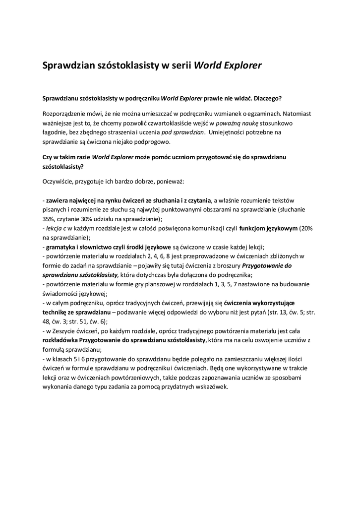 Sprawdzian szóstoklasisty w serii World Explorer Sprawdzianu szóstoklasisty w podręczniku World Explorer prawie nie widać. Dlaczego? Rozporządzenie mówi, że nie można umieszczać w podręczniku wzmianek o egzaminach. Natomiast ważniejsze jest to, że chcemy pozwolić czwartoklasiście wejść w poważną naukę stosunkowo łagodnie, bez zbędnego straszenia i uczenia pod sprawdzian. Umiejętności potrzebne na sprawdzianie są ćwiczona niejako podprogowo. Czy w takim razie World Explorer może pomóc uczniom przygotować się do sprawdzianu szóstoklasisty? Oczywiście, przygotuje ich bardzo dobrze, ponieważ: - zawiera najwięcej na rynku ćwiczeń ze słuchania i z czytania, a właśnie rozumienie tekstów pisanych i rozumienie ze słuchu są najwyżej punktowanymi obszarami na sprawdzianie (słuchanie 35%, czytanie 30% udziału na sprawdzianie); - lekcja c w każdym rozdziale jest w całości poświęcona komunikacji czyli funkcjom językowym (20% na sprawdzianie); - gramatyka i słownictwo czyli środki językowe są ćwiczone w czasie każdej lekcji; - powtórzenie materiału w rozdziałach 2, 4, 6, 8 jest przeprowadzone w ćwiczeniach zbliżonych w formie do zadań na sprawdzianie – pojawiły się tutaj ćwiczenia z broszury Przygotowanie do sprawdzianu szóstoklasisty, która dotychczas była dołączona do podręcznika; - powtórzenie materiału w formie gry planszowej w rozdziałach 1, 3, 5, 7 nastawione na budowanie świadomości językowej; - w całym podręczniku, oprócz tradycyjnych ćwiczeń, przewijają się ćwiczenia wykorzystujące technikę ze sprawdzianu – podawanie więcej odpowiedzi do wyboru niż jest pytań (str. 13, ćw. 5; str. 48, ćw. 3; str. 51, ćw. 6); - w Zeszycie ćwiczeń, po każdym rozdziale, oprócz tradycyjnego powtórzenia materiału jest cała rozkładówka Przygotowanie do sprawdzianu szóstoklasisty, która ma na celu oswojenie uczniów z formułą sprawdzianu; - w klasach 5 i 6 przygotowanie do sprawdzianu będzie polegało na zamieszczaniu większej ilości ćwiczeń w formule sprawdzianu w podręczniku i ćwiczeniach. Będą one wykorzystywane w trakcie lekcji oraz w ćwiczeniach powtórzeniowych, także podczas zapoznawania uczniów ze sposobami wykonania danego typu zadania za pomocą przydatnych wskazówek.