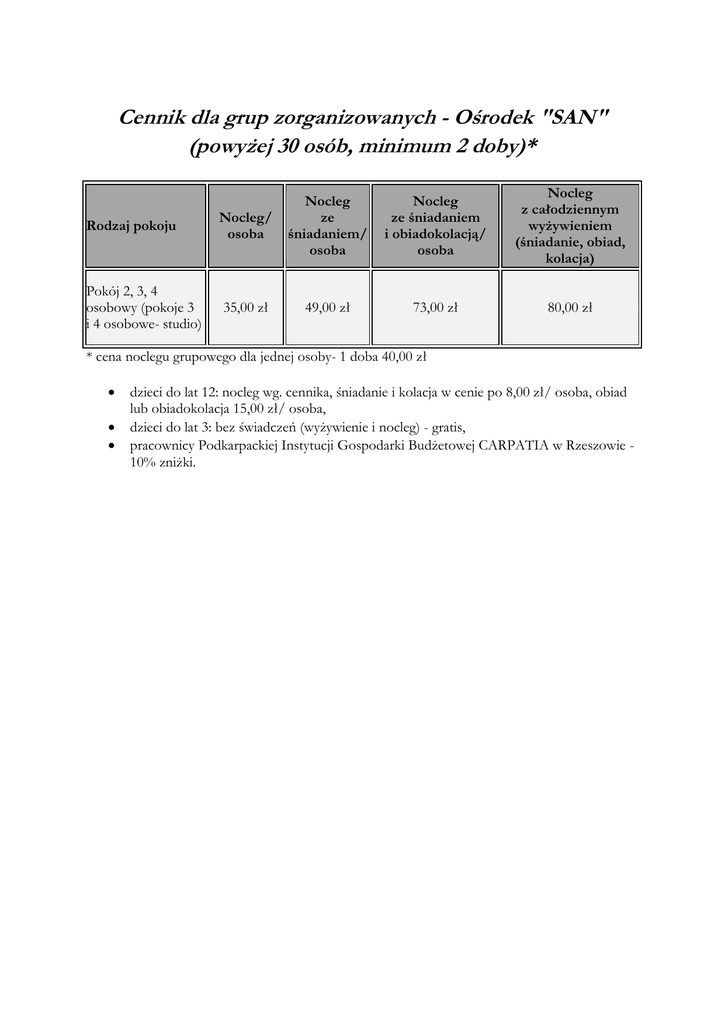 Cennik dla grup zorganizowanych - Ośrodek "SAN" (powyżej 30 osób, minimum 2 doby)* Rodzaj pokoju Nocleg/ osoba Nocleg ze śniadaniem/ osoba Pokój 2, 3, 4 osobowy (pokoje 3 i 4 osobowe- studio) 35,00 zł 49,00 zł Nocleg ze śniadaniem i obiadokolacją/ osoba Nocleg z całodziennym wyżywieniem (śniadanie, obiad, kolacja) 73,00 zł 80,00 zł * cena noclegu grupowego dla jednej osoby- 1 doba 40,00 zł dzieci do lat 12: nocleg wg. cennika, śniadanie i kolacja w cenie po 8,00 zł/ osoba, obiad lub obiadokolacja 15,00 zł/ osoba, dzieci do lat 3: bez świadczeń (wyżywienie i nocleg) - gratis, pracownicy Podkarpackiej Instytucji Gospodarki Budżetowej CARPATIA w Rzeszowie 10% zniżki.