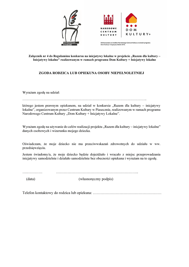 Załącznik nr 4 do Regulaminu konkursu na inicjatywy lokalne w projekcie „Razem dla kultury – Inicjatywy lokalne” realizowanym w ramach programu Dom Kultury + Inicjatywy lokalne ZGODA RODZICA LUB OPIEKUNA OSOBY NIEPEŁNOLETNIEJ Wyrażam zgodę na udział: …………………………………………………………………………………………….. którego jestem prawnym opiekunem, na udział w konkursie „Razem dla kultury – inicjatywy lokalne”, organizowanym przez Centrum Kultury w Piasecznie, realizowanym w ramach programu Narodowego Centrum Kultury „Dom Kultury + Inicjatywy Lokalne”. Wyrażam zgodę na używanie do celów realizacji projektu „Razem dla kultury – inicjatywy lokalne” danych osobowych i wizerunku mojego dziecka. Oświadczam, że moje dziecko nie ma przeciwwskazań zdrowotnych do udziału w ww. przedsięwzięciu. Jestem świadomy/a, że moje dziecko będzie dojeżdżało i wracało z miejsc przeprowadzania inicjatywy samodzielnie i działało samodzielnie bez obecności opiekuna i wyrażam na to zgodę. ….………… (data) ……………………………………………………….. (własnoręczny podpis) Telefon kontaktowy do rodzica lub opiekuna: ………………………………………………