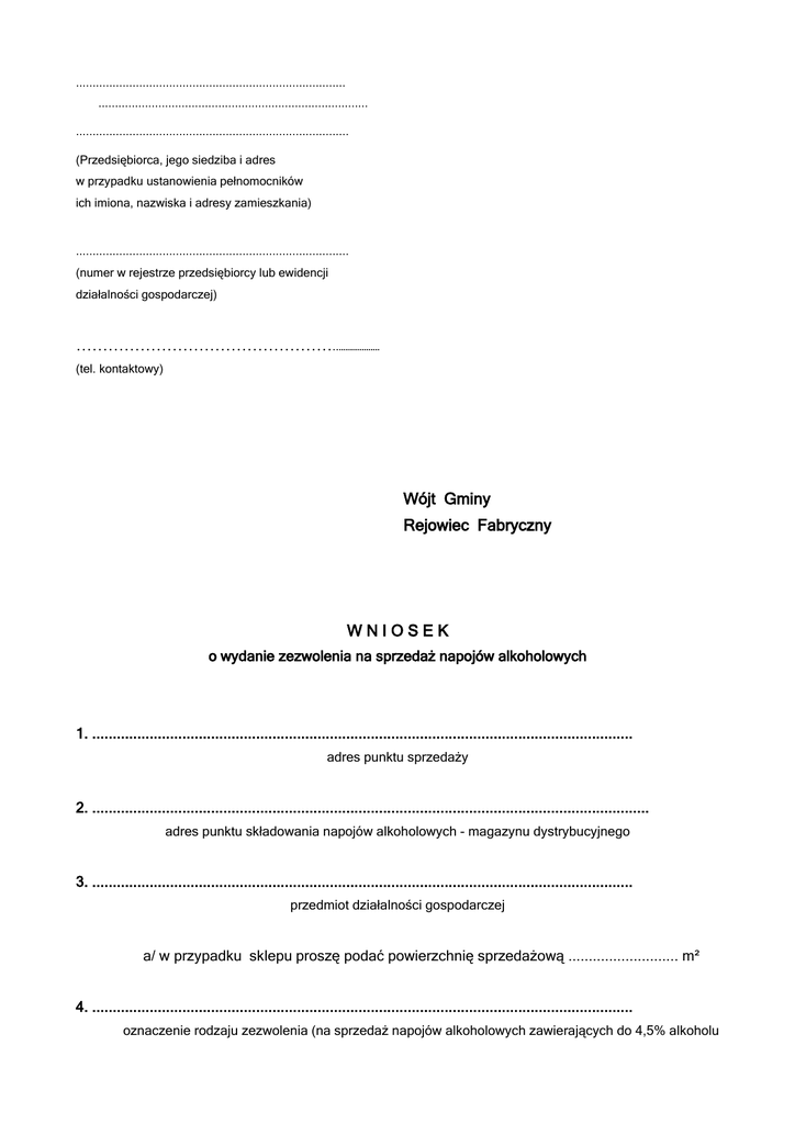 ................................................................................. ................................................................................. .................................................................................. (Przedsiębiorca, jego siedziba i adres w przypadku ustanowienia pełnomocników ich imiona, nazwiska i adresy zamieszkania) .................................................................................. (numer w rejestrze przedsiębiorcy lub ewidencji działalności gospodarczej) …………………………………………..……………… (tel. kontaktowy) Wójt Gminy Rejowiec Fabryczny WNIOSEK o wydanie zezwolenia na sprzedaż napojów alkoholowych 1. .................................................................................................................................... adres punktu sprzedaży 2. ........................................................................................................................................ adres punktu składowania napojów alkoholowych - magazynu dystrybucyjnego 3. .................................................................................................................................... przedmiot działalności gospodarczej a/ w przypadku sklepu proszę podać powierzchnię sprzedażową ........................... m² 4. .................................................................................................................................... oznaczenie rodzaju zezwolenia (na sprzedaż napojów alkoholowych zawierających do 4,5% alkoholu oraz na piwo, powyżej 4,5% do 18% alkoholu (z wyjątkiem piwa), powyżej 18% alkoholu) 5. Czy sklep / punkt gastronomiczny znajduje się w budynku wielorodzinnym tak* / nie* Jeżeli tak, to proszę podać właściciela, użytkownika, zarządcę lub administratora budynku ........................................................................................................................................ ....................................................... (podpis/y przedsiębiorcy/-ów) 6. O wydanie zezwolenia ubiegam się: a) po raz pierwszy tak*/nie* b) w związku z upływem terminu ważności poprzedniego zezwolenia ............................................................................................................................. (proszę podać numery poprzednich zezwoleń i datę ich wystawienia ) c) w związku ze zmianą użytkownika sklepu/baru w którym prowadzona była sprzedaż napojów alkoholowych ............................................................................................................................. (proszę podać numery poprzednich zezwoleń i datę ich wystawienia ) 7. Czy sklep / punkt gastronomiczny usytuowany jest: - na terenie targowiska – tak*/nie* - na terenie szkół oraz innych placówek oświatowo-wychowawczych, opiekuńczych - tak*/nie*. ............................................................. (podpis przedsiębiorcy) */niepotrzebne skreślić Uwaga: Do wniosku należy dołączyć (zgodnie z art. 18 ust. 6 ustawy z dnia 26 października 1982 r. o wychowaniu w trzeźwości i przeciwdziałaniu alkoholizmowi (Jednolity tekst: Dz.U. z 2002 r., Nr 147 z późn. zmianami): 1. zaświadczenie o wpisie do ewidencji działalności gospodarczej lub odpis z rejestru przedsiębiorców, 2. dokument potwierdzający tytuł prawny wnioskodawcy do lokalu stanowiącego punkt sprzedaży napojów alkoholowych, 3. pisemną zgodę właściciela, użytkownika, zarządcy lub administratora budynku, jeżeli punkt sprzedaży zlokalizowany będzie w budynku mieszkalnym wielorodzinnym 4. decyzję właściwego państwowego powiatowego inspektora sanitarnego, potwierdzającą spełnienie warunków sanitarnych przez punkt sprzedaży.