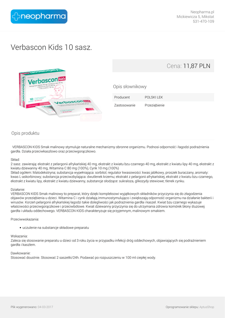 Neopharma.pl Mickiewicza 5, Mikstat 531-470-109 Verbascon Kids 10 sasz. Cena: 11,87 PLN Opis słownikowy Producent POLSKI LEK Zastosowanie Przeziębienie Opis produktu VERBASCON KIDS Smak malinowy stymuluje naturalne mechanizmy obronne organizmu. Podnosi odporność i łagodzi podrażnienia gardła. Działa przeciwkaszlowo oraz przeciwgorączkowo. Skład: 2 sasz. zawierają: ekstrakt z pelargonii afrykańskiej 40 mg, ekstrakt z kwiatu bzu czarnego 40 mg, ekstrakt z kwiatu lipy 40 mg, ekstrakt z kwiatu dziewanny 40 mg, Witamina C 80 mg (100%), Cynk 10 mg (100%) Skład ogółem: Matodekstryna; substancja wypełniająca: sorbitol; regulator kwasowości: kwas jabłkowy, proszek buraczany, aromaty: kwas L-askorbinowy; substancja przeciwzbylająca: dwutlenek krzemu; ekstrakt z pelargonii afrykańskiej, ekstrakt z kwiatu bzu czarnego, ekstrakt z kwiatu lipy, ekstrakt z kwiatu dziewanny, substancje słodzące: sukraloza, glikozydy stewiowe; tlenek cynku. Działanie: VERBASCON KIDS Smak malinowy to preparat, który dzięki kompleksowi wyjątkowych składników przyczynia się do złagodzenia objawów przeziębienia u dzieci. Witamina C i cynk działają immunostymulująco i zwiększają odporność organizmu na działanie bakterii i wirusów. Korzeń pelargonii afrykańskiej łagodzi takie dolegliwości jak podrażnienia gardła i kaszel. Kwiat bzu czarnego wykazuje właściwości przeciwgorączkowe i przeciwbólowe. Kwiat dziewanny przyczynia się do utrzymania zdrowia komórek błony śluzowej gardła i układu oddechowego. VERBASCON KIDS charakteryzuje się przyjemnym, malinowym smakiem. Przeciwwskazania: uczulenie na substancje składowe preparatu Wskazania: Zaleca się stosowanie preparatu u dzieci od 3 roku życia w przypadku infekcji dróg oddechowych, objawiających się podrażnieniem gardła i kaszlem. Dawkowanie: Stosować doustnie. Stosować 2 saszetki/24h. Podawać po rozpuszczeniu w 100 ml ciepłej wody. Plik wygenerowano: 04-03-2017 Powered by TCPDF (www.tcpdf.org) Oprogramowanie sklepu: AptusShop
