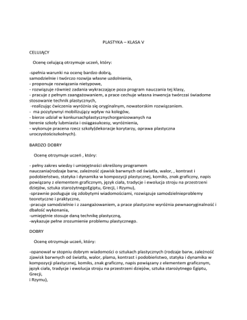 PLASTYKA – KLASA V CELUJĄCY Ocenę celującą otrzymuje uczeo, który: -spełnia warunki na ocenę bardzo dobrą, samodzielnie i twórczo rozwija własne uzdolnienia, - proponuje rozwiązania nietypowe, - rozwiązuje również zadania wykraczające poza program nauczania tej klasy, - pracuje z pełnym zaangażowaniem, a prace cechuje własna inwencja twórczai świadome stosowanie technik plastycznych, -realizując dwiczenia wyróżnia się oryginalnym, nowatorskim rozwiązaniem. - ma pozytywnyi mobilizujący wpływ na kolegów, - bierze udział w konkursachplastycznychorganizowanych na terenie szkoły lubmiasta i osiągasukcesy, wyróżnienia, - wykonuje pracena rzecz szkoły(dekoracje korytarzy, oprawa plastyczna uroczystościszkolnych). BARDZO DOBRY Ocenę otrzymuje uczeo , który: - pełny zakres wiedzy i umiejętności określony programem nauczania(rodzaje barw, zależnośd zjawisk barwnych od światła, walor, , kontrast i podobieostwo, statyka i dynamika w kompozycji plastycznej, komiks, znak graficzny, napis powiązany z elementem graficznym, język ciała, tradycje i ewolucja stroju na przestrzeni dziejów, sztuka starożytnegoEgiptu, Grecji, i Rzymu), -sprawnie posługuje się zdobytymi wiadomościami, rozwiązuje samodzielnieproblemy teoretyczne i praktyczne, -pracuje samodzielnie i z zaangażowaniem, a prace plastyczne wyróżnia pewnaoryginalnośd i dbałośd wykonania, -umiejętnie stosuje daną technikę plastyczną, -wykazuje pełne zrozumienie problemu plastycznego. DOBRY Ocenę otrzymuje uczeo, który: -opanował w stopniu dobrym wiadomości o sztukach plastycznych (rodzaje barw, zależnośd zjawisk barwnych od światła, walor, plama, kontrast i podobieostwo, statyka i dynamika w kompozycji plastycznej, komiks, znak graficzny, napis powiązany z elementem graficznym, język ciała, tradycje i ewolucja stroju na przestrzeni dziejów, sztuka starożytnego Egiptu, Grecji, i Rzymu), - poprawnie stosuje poznane wiadomości, rozwiązuje samodzielnie typowe zadania teoretyczne i praktyczne, -pracuje samodzielnie, ale praca nie wyróżnia się oryginalnością, - wykazuje zrozumienie zagadnienia plastycznego i danej techniki plastycznej, - poprawnie realizuje założone dwiczenia. DOSTATECZNY Ocenę otrzymuje uczeo, który: -opanował podstawowe treści programowe w zakresie wiedzy o sztukach plastycznych, które umożliwiają postępy w dalszym uczeniu się tego przedmiotu (rodzaje barw, zależnośd zjawisk barwnych od światła, walor, plama, kontrast i podobieostwo, statyka i dynamika w kompozycji plastycznej, komiks, znak graficzny, napis powiązany z elementem graficznym, język ciała, tradycje i ewolucja stroju na przestrzeni dziejów), - rozwiązuje typowe zadania o średnim stopniu trudności, czasem przy pomocy nauczyciela, nie posiada własnej inwencji twórczej, nie rozwiązuje w pełni problemu plastycznego. DOPUSZCZAJĄCY Ocenę otrzymuje uczeo, który: -opanował w ograniczonym zakresie podstawowe wiadomości i umiejętności z zakresu wiedzy o sztukach plastycznych, - podjął realizację tematu pracy plastycznej, ale problem plastyczny realizuje w minimalnym stopniu, - pracuje niesamodzielnie, brak pomysłu i własnych rozwiązao., - niesystematycznie przygotowuje się do lekcji, - w zajęciach. FORMY OCENY Każdy uczeo jest oceniany przede wszystkim za wkład pracy i zaangażowanie. Bierze się pod uwagę indywidualne predyspozycje. Uczeo otrzymuje ocenę za umiejętności praktyczne : pracę plastyczną w określonej technice, projekt plastyczny,przygotowanie scenografii, dbałośd o estetykę otoczenia. Wiedza teoretyczna jest sprawdzana przy pomocy testów. Aktywna praca jest oceniana plusem:3 plusy = 5, 3 minusy = 1. W każdym semestrze uczeo może dwukrotnie zgłosid nieprzygotowanie. i warunki uzyskiwania oceny wyższej niż przewidywana na semestr i koniec roku szkolnego W celu uzyskania wyższej oceny uczeo powinien wyrazid chęd jej poprawy w obecności całej klasy w terminie trzech tygodni przed klasyfikacją. Ocena będzie ustalona trzy dni wcześniej przed Radą Pedagogiczną. Warunkami uzyskania wyższej oceny są: zaliczone w terminie prace plastyczne, projekty, wiedza teoretyczna , systematycznie, starannie prowadzony zeszyt przedmiotowy, aktywna praca podczas lekcji w trakcie całego semestru. Uczeo zalicza praktycznie określone techniki plastyczne . Wiedza teoretyczna jest sprawdzana przy pomocy testu wiadomości.