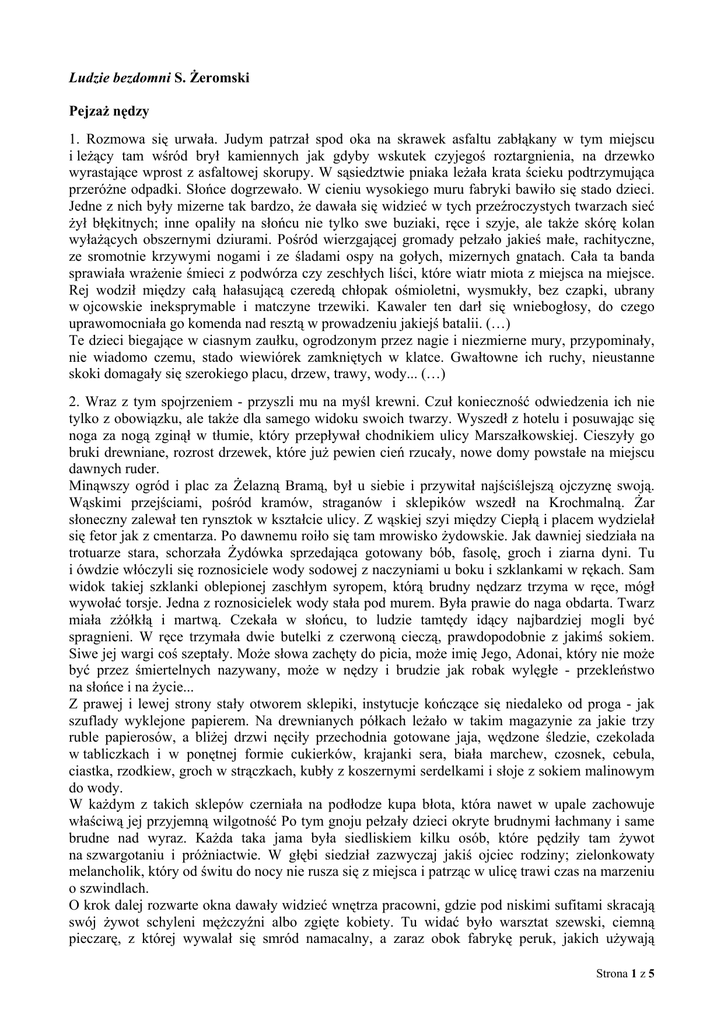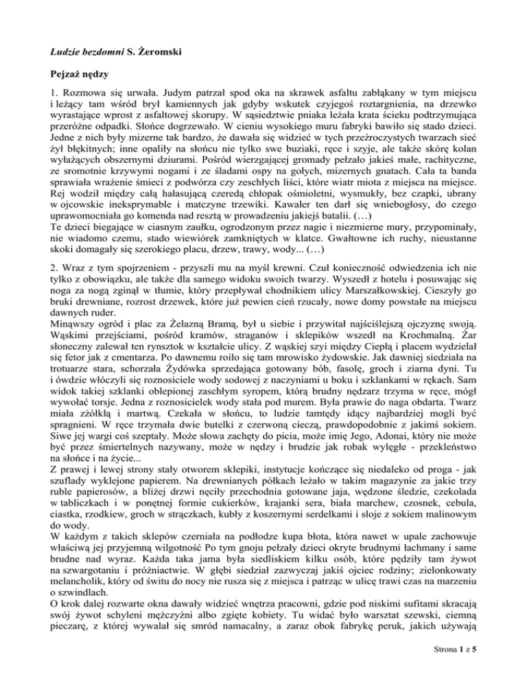 Ludzie bezdomni S. Żeromski Pejzaż nędzy 1. Rozmowa się urwała. Judym patrzał spod oka na skrawek asfaltu zabłąkany w tym miejscu i leżący tam wśród brył kamiennych jak gdyby wskutek czyjegoś roztargnienia, na drzewko wyrastające wprost z asfaltowej skorupy. W sąsiedztwie pniaka leżała krata ścieku podtrzymująca przeróżne odpadki. Słońce dogrzewało. W cieniu wysokiego muru fabryki bawiło się stado dzieci. Jedne z nich były mizerne tak bardzo, że dawała się widzieć w tych przeźroczystych twarzach sieć żył błękitnych; inne opaliły na słońcu nie tylko swe buziaki, ręce i szyje, ale także skórę kolan wyłażących obszernymi dziurami. Pośród wierzgającej gromady pełzało jakieś małe, rachityczne, ze sromotnie krzywymi nogami i ze śladami ospy na gołych, mizernych gnatach. Cała ta banda sprawiała wrażenie śmieci z podwórza czy zeschłych liści, które wiatr miota z miejsca na miejsce. Rej wodził między całą hałasującą czeredą chłopak ośmioletni, wysmukły, bez czapki, ubrany w ojcowskie ineksprymable i matczyne trzewiki. Kawaler ten darł się wniebogłosy, do czego uprawomocniała go komenda nad resztą w prowadzeniu jakiejś batalii. (…) Te dzieci biegające w ciasnym zaułku, ogrodzonym przez nagie i niezmierne mury, przypominały, nie wiadomo czemu, stado wiewiórek zamkniętych w klatce. Gwałtowne ich ruchy, nieustanne skoki domagały się szerokiego placu, drzew, trawy, wody... (…) 2. Wraz z tym spojrzeniem - przyszli mu na myśl krewni. Czuł konieczność odwiedzenia ich nie tylko z obowiązku, ale także dla samego widoku swoich twarzy. Wyszedł z hotelu i posuwając się noga za nogą zginął w tłumie, który przepływał chodnikiem ulicy Marszałkowskiej. Cieszyły go bruki drewniane, rozrost drzewek, które już pewien cień rzucały, nowe domy powstałe na miejscu dawnych ruder. Minąwszy ogród i plac za Żelazną Bramą, był u siebie i przywitał najściślejszą ojczyznę swoją. Wąskimi przejściami, pośród kramów, straganów i sklepików wszedł na Krochmalną. Żar słoneczny zalewał ten rynsztok w kształcie ulicy. Z wąskiej szyi między Ciepłą i placem wydzielał się fetor jak z cmentarza. Po dawnemu roiło się tam mrowisko żydowskie. Jak dawniej siedziała na trotuarze stara, schorzała Żydówka sprzedająca gotowany bób, fasolę, groch i ziarna dyni. Tu i ówdzie włóczyli się roznosiciele wody sodowej z naczyniami u boku i szklankami w rękach. Sam widok takiej szklanki oblepionej zaschłym syropem, którą brudny nędzarz trzyma w ręce, mógł wywołać torsje. Jedna z roznosicielek wody stała pod murem. Była prawie do naga obdarta. Twarz miała zżółkłą i martwą. Czekała w słońcu, to ludzie tamtędy idący najbardziej mogli być spragnieni. W ręce trzymała dwie butelki z czerwoną cieczą, prawdopodobnie z jakimś sokiem. Siwe jej wargi coś szeptały. Może słowa zachęty do picia, może imię Jego, Adonai, który nie może być przez śmiertelnych nazywany, może w nędzy i brudzie jak robak wylęgłe - przekleństwo na słońce i na życie... Z prawej i lewej strony stały otworem sklepiki, instytucje kończące się niedaleko od proga - jak szuflady wyklejone papierem. Na drewnianych półkach leżało w takim magazynie za jakie trzy ruble papierosów, a bliżej drzwi nęciły przechodnia gotowane jaja, wędzone śledzie, czekolada w tabliczkach i w ponętnej formie cukierków, krajanki sera, biała marchew, czosnek, cebula, ciastka, rzodkiew, groch w strączkach, kubły z koszernymi serdelkami i słoje z sokiem malinowym do wody. W każdym z takich sklepów czerniała na podłodze kupa błota, która nawet w upale zachowuje właściwą jej przyjemną wilgotność Po tym gnoju pełzały dzieci okryte brudnymi łachmany i same brudne nad wyraz. Każda taka jama była siedliskiem kilku osób, które pędziły tam żywot na szwargotaniu i próżniactwie. W głębi siedział zazwyczaj jakiś ojciec rodziny; zielonkowaty melancholik, który od świtu do nocy nie rusza się z miejsca i patrząc w ulicę trawi czas na marzeniu o szwindlach. O krok dalej rozwarte okna dawały widzieć wnętrza pracowni, gdzie pod niskimi sufitami skracają swój żywot schyleni mężczyźni albo zgięte kobiety. Tu widać było warsztat szewski, ciemną pieczarę, z której wywalał się smród namacalny, a zaraz obok fabrykę peruk, jakich używają Strona 1 z 5 pobożne Żydówki. Było takich zakładów fryzjerskich kilkanaście z rzędu. Blade, żółte, obumarłe dziewczyny, same nie czesane ani myte, pracowicie rozdzielały kłaki... Z dziedzińców, drzwi, nawet ze starych dachów krytych blachą lub cegłą, gdzie szeregiem tkwiły okna facjatek, wychylały się twarze chore, chude, długonose, zielone, moręgowate i patrzały oczy krwawe, cieknące albo zobojętniałe na wszystko w niedoli, oczy, które w smutku wiecznym śnią o śmierci. (…) 3. Wysunąwszy się ż tego domu, doktor szedł ulicami w stronę przedmieścia ze zwieszoną głową, machinalnie szukając oczyma fabryki cygar. (…) Proszek tabaki wdzierał się tam do nosa, gardła, płuc przychodnia i podwajał szybkość oddechu. Na pierwszym piętrze ukazała się duża sala, formalnie wypełniona przez tłum kobiet złożony z jakich stu osób, pochylonych nad długimi a wąskimi stołami. Kobiety te, rozebrane w sposób jak najbardziej niepretensjonalny, zwijały cygara prędkimi ruchami, które na pierwszy rzut oka czyniły wrażenie jakichś kurczów bolesnych. Jedne z nich schylały głowy i trzęsły ramionami jak kucharki wałkujące ciasto. Te zajęte były zwijaniem grubo siekanego tytoniu w liście, które poprzednio zostały szybko a misternie przykrojone. Inne kładły zwinięte cygara w prasy drewniane. Duszące powietrze, pełne smrodu ciał pracujących w upale, w miejscu niskim i ciasnym, przeładowane pyłem starego tytoniu, zdawało się rozdzierać tkanki, żarło gardziel i oczy. Za pierw