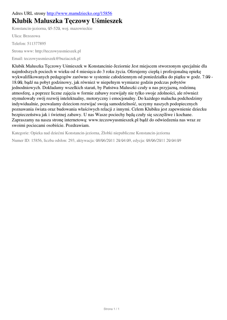 Adres URL strony http://www.mamdziecko.org/15856 Klubik Maluszka Tęczowy Uśmieszek Konstancin-jeziorna, 05-520, woj. mazowieckie Ulica: Brzozowa Telefon: 511377895 Strona www: http://teczowyusmieszek.pl Email: [email protected] Klubik Maluszka Tęczowy Uśmieszek w Konstancinie-Jeziornie Jest miejscem stworzonym specjalnie dla najmłodszych pociech w wieku od 4 miesięca do 3 roku życia. Oferujemy ciepłą i profesjonalną opiekę wykwalifikowanych pedagogów zarówno w systemie całodziennym od poniedziałku do piątku w godz. 7.00 18.00, bądź na pobyt godzinowy, jak również w niepełnym wymiarze godzin podczas pobytów jednodniowych. Dokładamy wszelkich starań, by Państwa Maluszki czuły u nas przyjazną, rodzinną atmosferę, a poprzez liczne zajęcia w formie zabawy rozwijały nie tylko swoje zdolności, ale również stymulowały swój rozwój intelektualny, motoryczny i emocjonalny. Do każdego malucha podchodzimy indywidualnie, pozwalamy dzieciom rozwijać swoją samodzielność, uczymy naszych podopiecznych poznawania świata oraz budowania właściwych relacji z innymi. Celem Klubiku jest zapewnienie dziecku bezpieczeństwa jak i świetnej zabawy. U nas Wasze pociechy będą czuły się szczęśliwe i kochane. Zapraszamy na nasza stronę internetową: www.teczowyusmieszek.pl bądź do odwiedzenia nas wraz ze swoimi pociecami osobiście. Pozdrawiam. Kategorie: Opieka nad dziećmi Konstancin-jeziorna, Żłobki niepubliczne Konstancin-jeziorna Numer ID: 15856, liczba odsłon: 293, aktywacja: 08/06/2011 20:04:09, edycja: 08/06/2011 20:04:09 Strona 1 / 1