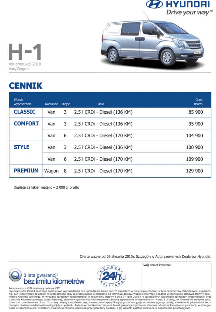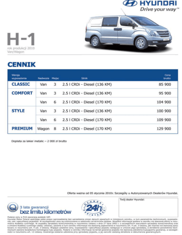 WYPOSAŻENIE STANDARDOWE BEZPIECZEŃSTWO Poduszka powietrzna kierowcy Poduszka powietrzna pasażera System hamulcowy z ABS System stabilizacji toru jazdy (ESP) FUNKCJONALNOŚĆ Regulowana wysokość kolumny kierownicy Regulowana wysokość zagłówków Czasowy regulator pracy wycieraczek Poziomowanie świateł przednich Tylne światła przeciwmgielne Oświetlenie kabiny pasażerskiej Oświetlenie przestrzeni bagażowej Haki mocujące w przestrzeni bagażowej Boczne drzwi przesuwne z obu stron Drzwi przestrzeni ładunkowej dzielone i otwierane na boki Drzwi przestrzeni ładunkowej otwierane do góry Czujnik cofania KOMFORT Wspomaganie układu kierowniczego Immobilizer Centralny zamek Składany kluczyk Otwieranie wlewu paliwa z wnętrza samochodu Lusterka zewnętrzne sterowane elektrycznie Lusterka zewnętrzne sterowane elektrycznie i podgrzewane Szyby sterowane elektrycznie Przyciemniana szyba z pasem przeciwsłonecznym Przyciemniane szyby bocznych i tylnych drzwi Ogrzewana tylna szyba Klimatyzacja manualna Komputer pokładowy Zegar cyfrowy STYLIZACJA Zderzaki w kolorze nadwozia Winylowa wykładzina podłogi w przestrzeni bagażowej KOŁA I OPONY Felgi stalowe z oponami 215/70R16 Felgi aluminiowe z oponami 215/70R16 Kołpaki kół Pełnowymiarowe koło zapasowe Osłony przeciwbłotne przy przednich i tylnych kołach AUDIO Instalacja radiowa + głośniki Radio CD MP3 1) 2) Classic + + + + + + + + + + + + + + + rok produkcji 2010 Van/Wagon Comfort Style Premium + + + + + + + + + + + + + + + + + + + + + + + + + + + + + + + + + + + + + + + + + + + + + + + + + + + + + + + + + + + + + + + + + 2) + + + + + + + 1) + + + + + + + Dotyczy wersji Van 3-osobowej Dotyczy wersji Van 6-osobowej WYPOSAŻENIE OPCJONALNE I AKCESORIA Lakier metalik/mika 2 000 zł + + + + + + + + + + + + + + + + + + + + + + + + + + + + DANE TECHNICZNE SILNIKI Wersja nadwozia Ilość miejsc siedzących WYMIARY Długość całkowita (mm) Szerokość całkowita (mm) Wysokość całkowita (mm) Rozstaw osi (mm) Rozstaw kół przednich / tylnych (mm) Zwis przedni / tylny (mm) Prześwit (mm) Pojemność zbiornika paliwa (l) Długość przedziału ładunkowego (mm) Szerokość przedziału ładunkowego (mm) Wysokość przedziału ładunkowego (mm) Pojemność przedziału ładunkowego (l) Konfiguracja miejsc siedzących MASY I ŁADOWNOŚCI DMC Ładowność SILNIK I PRZENIESIENIE NAPĘDU Pojemność skokowa (cm3) Średnica cylindra x skok tłoka (mm) Stopień sprężania Moc maksymalna (KM (kW) przy obr./min.) Maksymalny moment obrotowy (Nm przy obr./min.) Skrzynia biegów OSIĄGI Prędkość maksymalna (km/h) Przyspieszenie 0-100 km/h (s) ZUŻYCIE PALIWA Cykl miejski (l/100 km) Cykl pozamiejski (l/100 km) Cykl mieszany (l/100 km) Emisja CO2 (g/km) ZAWIESZENIE Zawieszenie kół przednich Zawieszenie kół tylnych HAMULCE Typ Hamulce przednie rok produkcji 2010 Van/Wagon 2.5 WGT 136 KM Van dostawczy 3 2.5 VGT 170 KM Van dostawczy 6 2.5 VGT 170 KM Wagon 8 3160 1186 3230 1151 3030 760 5125 1920 1935 3200 1685 / 1660 855 / 1070 190 75 2375 1620 1350 4308 3 2497 91 x 96 17,6 170 (125) / 3800 392 / 2000 5-stopniowa, manualna 2497 91 x 96 17,6 170 (125) / 3800 392 / 2000 5-stopniowa, manualna 10,7 7,1 8,3 222 10,9 7,1 8,5 225 10,9 7,1 8,5 225 167 17,9 180 14,5 Hydrauliczny ze wspomaganiem i korektorem siły hamowania wentylowane tarcze, 2-tłoczkowe zaciski oraz system ostrzegania o zużyciu klocków wentylowane tarcze, 1-tłoczkowe zaciski, wbudowany bębnowy hamulec postojowy oraz system ostrzegania o zużyciu klocków 215/70R16 wersja 8-osobowa Wagon 180 15,5 Kolumny MacPhersona Resory piórowe, drążek Panharda Wielowahaczowe ze sztywną belką OPONY Rozmiar Podane wartości zużycia paliwa oraz emisji CO2 stanowią dane porównawcze uzyskane na podstawie pomiarów stanowiskowych wykonanych w warunkach ściśle określonych Dyrektywą Europejskiej Komisji Gospodarczej nr 80/1268/EEC. Wielkość zużycia paliwa oraz emisji CO2 w warunkach rzeczywistych może się różnić od danych katalogowych, na co mają szczególny wpływ: technika jazdy kierowcy oraz rodzaj eksploatacji, warunki drogowe, warunki pogodowe, jakość paliwa, stan techniczny pojazdu oraz jego obciążenie. Zestawienie zużycia paliwa i emisji CO2 zawierające dane wszystkich nowych samochodów marki Hyundai jest dostępne nieodpłatnie w każdym autoryzowanym punkcie sprzedaży pojazdów. 5125 1920 1925 3200 1685 / 1660 855 / 1070 190 75 851 1591 833 851 2/3/3 2497 91 x 96 17,6 136 (100) / 3800 343 / 1750-2500 5-stopniowa, manualna Hamulce tylne wymiary podano w mm 5125 1920 1935 3200 1685 / 1660 855 / 1070 190 75 1585 1620 1350 2500 3/3 Van 215/70R16 215/70R16 wersja 6-osobowa wersja 3-osobowa wersja 5-osobowa wersja 2-osobowa
