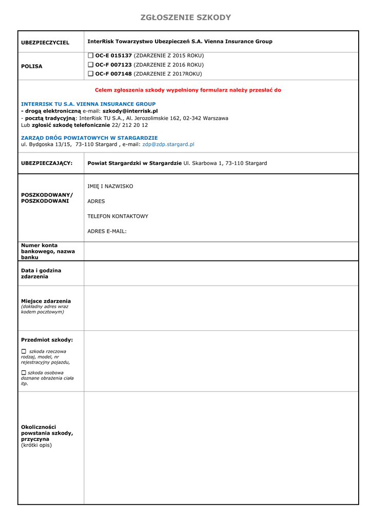 ZGŁOSZENIE SZKODY UBEZPIECZYCIEL InterRisk Towarzystwo Ubezpieczeń S.A. Vienna Insurance Group OC-E 015137 (ZDARZENIE Z 2015 ROKU) POLISA OC-F 007123 (ZDARZENIE Z 2016 ROKU) OC-F 007148 (ZDARZENIE Z 2017ROKU) Celem zgłoszenia szkody wypełniony formularz należy przesłać do INTERRISK TU S.A. VIENNA INSURANCE GROUP - drogą elektroniczną e-mail: [email protected] - pocztą tradycyjną: InterRisk TU S.A., Al. Jerozolimskie 162, 02-342 Warszawa Lub zgłosić szkodę telefonicznie 22/ 212 20 12 ZARZĄD DRÓG POWIATOWYCH W STARGARDZIE ul. Bydgoska 13/15, 73-110 Stargard , e-mail: [email protected] UBEZPIECZAJĄCY: Powiat Stargardzki w Stargardzie Ul. Skarbowa 1, 73-110 Stargard IMIĘ I NAZWISKO POSZKODOWANY/ POSZKODOWANI ADRES TELEFON KONTAKTOWY ADRES E-MAIL: Numer konta bankowego, nazwa banku Data i godzina zdarzenia Miejsce zdarzenia (dokładny adres wraz kodem pocztowym) Przedmiot szkody: szkoda rzeczowa rodzaj, model, nr rejestracyjny pojazdu, szkoda osobowa doznane obrażenia ciała itp. Okoliczności powstania szkody, przyczyna (krótki opis) ZGŁOSZENIE SZKODY Orientacyjna wartość szkody: Zawiadomienie Policji/Straży Miejskiej/Straży Pożarnej (nazwa jednostki, adres, data zawiadomienia) Dane świadków zdarzenia (imię, nazwisko, adres zamieszkania, telefon) Kontakt w sprawie oględzin: (imię i nazwisko, telefon) dowód rej. pojazdu zgłoszenie na Policję dokumentacja fotograficzna potwierdzenie policy OC pojazdu faktura za naprawę/kosztorys dokumentacja medyczna oświadczenie świadków zdarzenia inne (wpisać jakie dokumenty) Załączone dokumenty: Uwagi: (w tym ewentualnie spodziewane dalsze działania w związku ze szkodą) Oświadczam, że podane przeze mnie informacje zostały podane zgodnie z istniejącym stanem faktycznym i nie zostały zatajone inne okoliczności/ Miejscowość i data Imię i nazwisko osoby zgłaszającej Podpis