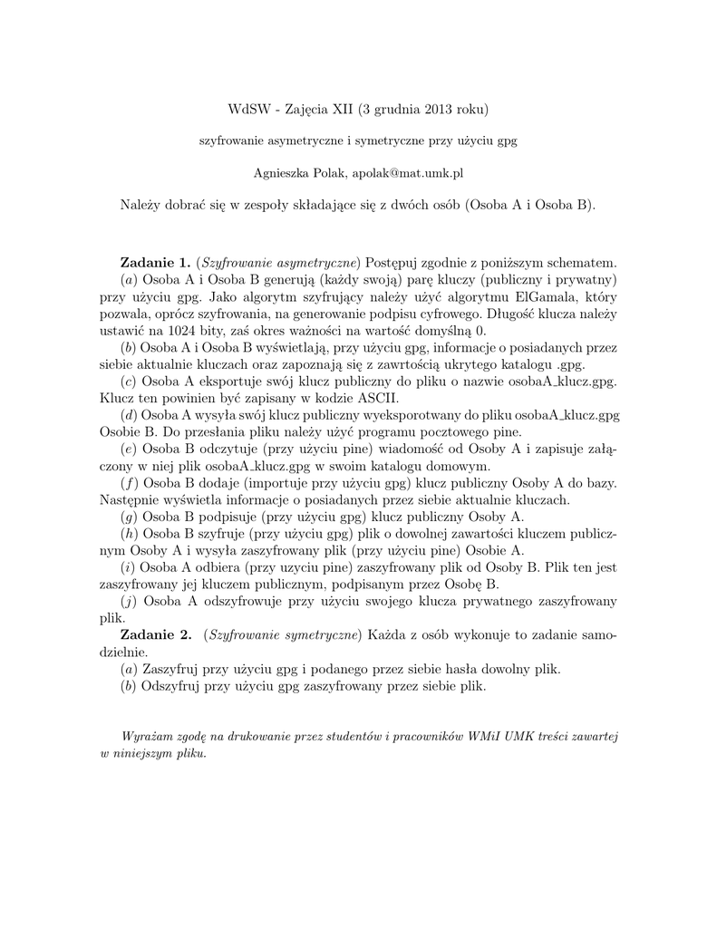 WdSW - Zajęcia XII (3 grudnia 2013 roku) szyfrowanie asymetryczne i symetryczne przy użyciu gpg Agnieszka Polak, [email protected] Należy dobrać się w zespoły składające się z dwóch osób (Osoba A i Osoba B). Zadanie 1. (Szyfrowanie asymetryczne) Postępuj zgodnie z poniższym schematem. (a) Osoba A i Osoba B generują (każdy swoją) parę kluczy (publiczny i prywatny) przy użyciu gpg. Jako algorytm szyfrujący należy użyć algorytmu ElGamala, który pozwala, oprócz szyfrowania, na generowanie podpisu cyfrowego. Długość klucza należy ustawić na 1024 bity, zaś okres ważności na wartość domyślną 0. (b) Osoba A i Osoba B wyświetlają, przy użyciu gpg, informacje o posiadanych przez siebie aktualnie kluczach oraz zapoznają się z zawrtością ukrytego katalogu .gpg. (c) Osoba A eksportuje swój klucz publiczny do pliku o nazwie osobaA klucz.gpg. Klucz ten powinien być zapisany w kodzie ASCII. (d) Osoba A wysyła swój klucz publiczny wyeksporotwany do pliku osobaA klucz.gpg Osobie B. Do przesłania pliku należy użyć programu pocztowego pine. (e) Osoba B odczytuje (przy użyciu pine) wiadomość od Osoby A i zapisuje załączony w niej plik osobaA klucz.gpg w swoim katalogu domowym. (f ) Osoba B dodaje (importuje przy użyciu gpg) klucz publiczny Osoby A do bazy. Następnie wyświetla informacje o posiadanych przez siebie aktualnie kluczach. (g) Osoba B podpisuje (przy użyciu gpg) klucz publiczny Osoby A. (h) Osoba B szyfruje (przy użyciu gpg) plik o dowolnej zawartości kluczem publicznym Osoby A i wysyła zaszyfrowany plik (przy użyciu pine) Osobie A. (i) Osoba A odbiera (przy uzyciu pine) zaszyfrowany plik od Osoby B. Plik ten jest zaszyfrowany jej kluczem publicznym, podpisanym przez Osobę B. (j) Osoba A odszyfrowuje przy użyciu swojego klucza prywatnego zaszyfrowany plik. Zadanie 2. (Szyfrowanie symetryczne) Każda z osób wykonuje to zadanie samodzielnie. (a) Zaszyfruj przy użyciu gpg i podanego przez siebie hasła dowolny plik. (b) Odszyfruj przy użyciu gpg zaszyfrowany przez siebie plik. Wyrażam zgodę na drukowanie przez studentów i pracowników WMiI UMK treści zawartej w niniejszym pliku.