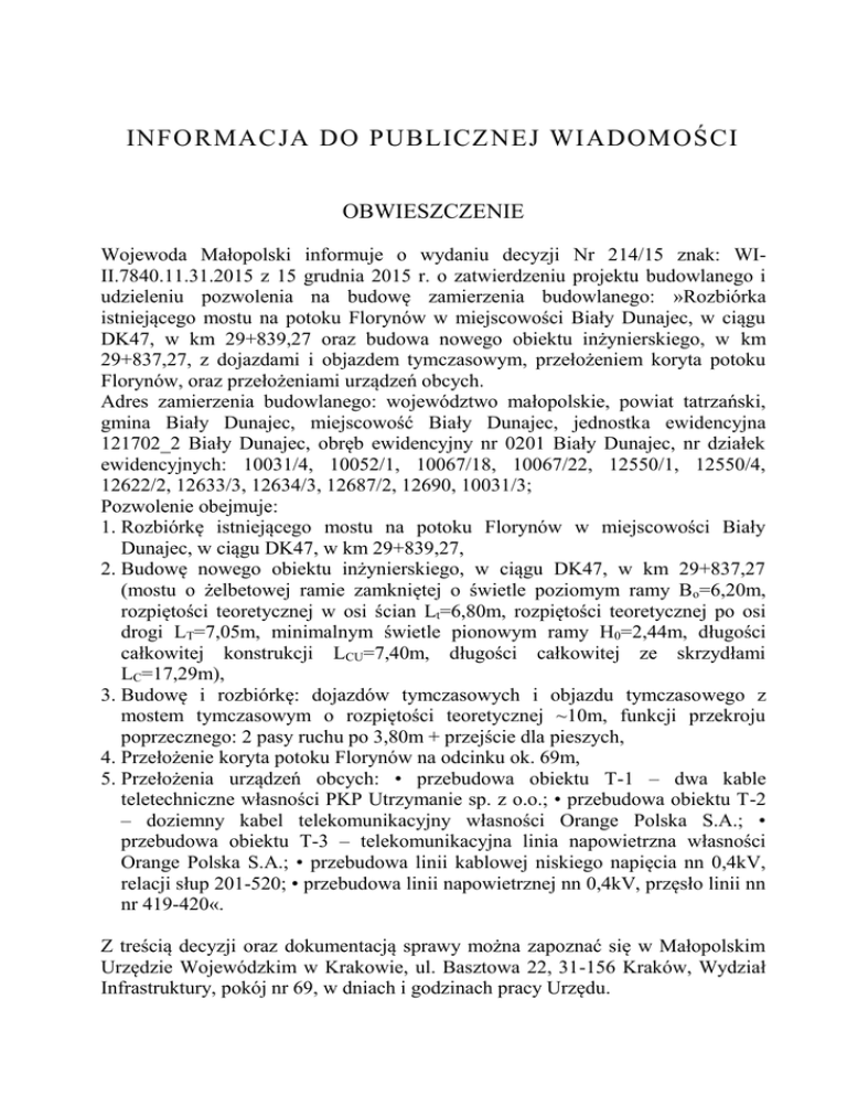 INFORMACJA DO PUBLICZNEJ WIADOMOŚCI OBWIESZCZENIE Wojewoda Małopolski informuje o wydaniu decyzji Nr 214/15 znak: WIII.7840.11.31.2015 z 15 grudnia 2015 r. o zatwierdzeniu projektu budowlanego i udzieleniu pozwolenia na budowę zamierzenia budowlanego: »Rozbiórka istniejącego mostu na potoku Florynów w miejscowości Biały Dunajec, w ciągu DK47, w km 29+839,27 oraz budowa nowego obiektu inżynierskiego, w km 29+837,27, z dojazdami i objazdem tymczasowym, przełożeniem koryta potoku Florynów, oraz przełożeniami urządzeń obcych. Adres zamierzenia budowlanego: województwo małopolskie, powiat tatrzański, gmina Biały Dunajec, miejscowość Biały Dunajec, jednostka ewidencyjna 121702_2 Biały Dunajec, obręb ewidencyjny nr 0201 Biały Dunajec, nr działek ewidencyjnych: 10031/4, 10052/1, 10067/18, 10067/22, 12550/1, 12550/4, 12622/2, 12633/3, 12634/3, 12687/2, 12690, 10031/3; Pozwolenie obejmuje: 1. Rozbiórkę istniejącego mostu na potoku Florynów w miejscowości Biały Dunajec, w ciągu DK47, w km 29+839,27, 2. Budowę nowego obiektu inżynierskiego, w ciągu DK47, w km 29+837,27 (mostu o żelbetowej ramie zamkniętej o świetle poziomym ramy B o=6,20m, rozpiętości teoretycznej w osi ścian Lt=6,80m, rozpiętości teoretycznej po osi drogi LT=7,05m, minimalnym świetle pionowym ramy H0=2,44m, długości całkowitej konstrukcji LCU=7,40m, długości całkowitej ze skrzydłami LC=17,29m), 3. Budowę i rozbiórkę: dojazdów tymczasowych i objazdu tymczasowego z mostem tymczasowym o rozpiętości teoretycznej ~10m, funkcji przekroju poprzecznego: 2 pasy ruchu po 3,80m + przejście dla pieszych, 4. Przełożenie koryta potoku Florynów na odcinku ok. 69m, 5. Przełożenia urządzeń obcych: • przebudowa obiektu T-1 – dwa kable teletechniczne własności PKP Utrzymanie sp. z o.o.; • przebudowa obiektu T-2 – doziemny kabel telekomunikacyjny własności Orange Polska S.A.; • przebudowa obiektu T-3 – telekomunikacyjna linia napowietrzna własności Orange Polska S.A.; • przebudowa linii kablowej niskiego napięcia nn 0,4kV, relacji słup 201-520; • przebudowa linii napowietrznej nn 0,4kV, przęsło linii nn nr 419-420«. Z treścią decyzji oraz dokumentacją sprawy można zapoznać się w Małopolskim Urzędzie Wojewódzkim w Krakowie, ul. Basztowa 22, 31-156 Kraków, Wydział Infrastruktury, pokój nr 69, w dniach i godzinach pracy Urzędu. Podstawa prawna podania informacji do publicznej wiadomości: art. 72 ust. 6 i art. 3 ust. 1 pkt 11 lit. c ustawy z dnia 3 października 2008 r. o udostępnianiu informacji o środowisku i jego ochronie, udziale społeczeństwa w ochronie środowiska oraz o ocenach oddziaływania na środowisko (Dz.U.2013.1235 ze zmianami) w związku z jej art. 72 ust. 1 pkt 1.dnie z przepisem art.