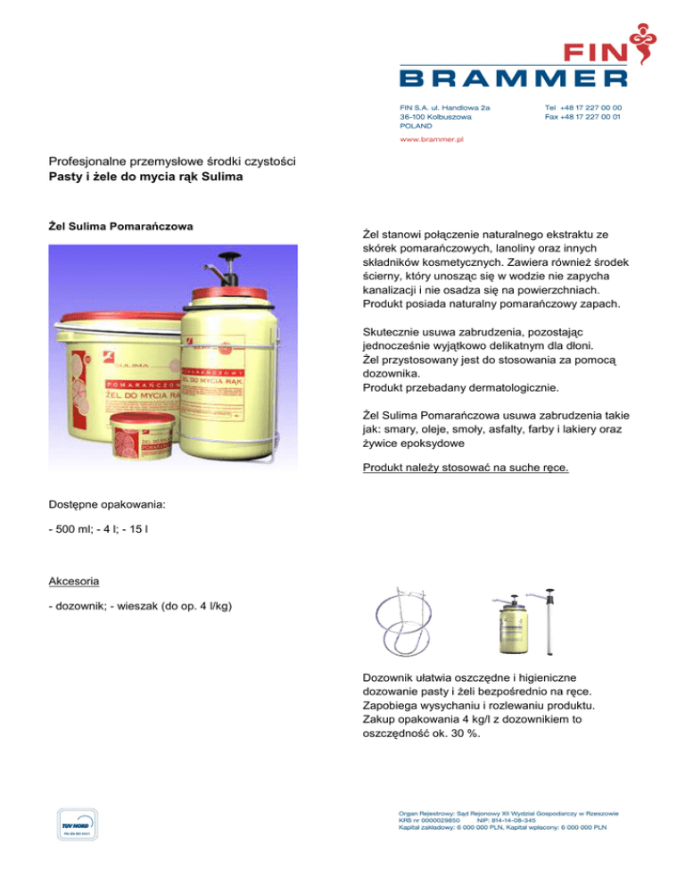 Profesjonalne przemysłowe środki czystości Pasty i żele do mycia rąk Sulima Żel Sulima Pomarańczowa Żel stanowi połączenie naturalnego ekstraktu ze skórek pomarańczowych, lanoliny oraz innych składników kosmetycznych. Zawiera również środek ścierny, który unosząc się w wodzie nie zapycha kanalizacji i nie osadza się na powierzchniach. Produkt posiada naturalny pomarańczowy zapach. Skutecznie usuwa zabrudzenia, pozostając jednocześnie wyjątkowo delikatnym dla dłoni. Żel przystosowany jest do stosowania za pomocą dozownika. Produkt przebadany dermatologicznie. Żel Sulima Pomarańczowa usuwa zabrudzenia takie jak: smary, oleje, smoły, asfalty, farby i lakiery oraz żywice epoksydowe Produkt należy stosować na suche ręce. Dostępne opakowania: - 500 ml; - 4 l; - 15 l Akcesoria - dozownik; - wieszak (do op. 4 l/kg) Dozownik ułatwia oszczędne i higieniczne dozowanie pasty i żeli bezpośrednio na ręce. Zapobiega wysychaniu i rozlewaniu produktu. Zakup opakowania 4 kg/l z dozownikiem to oszczędność ok. 30 %.