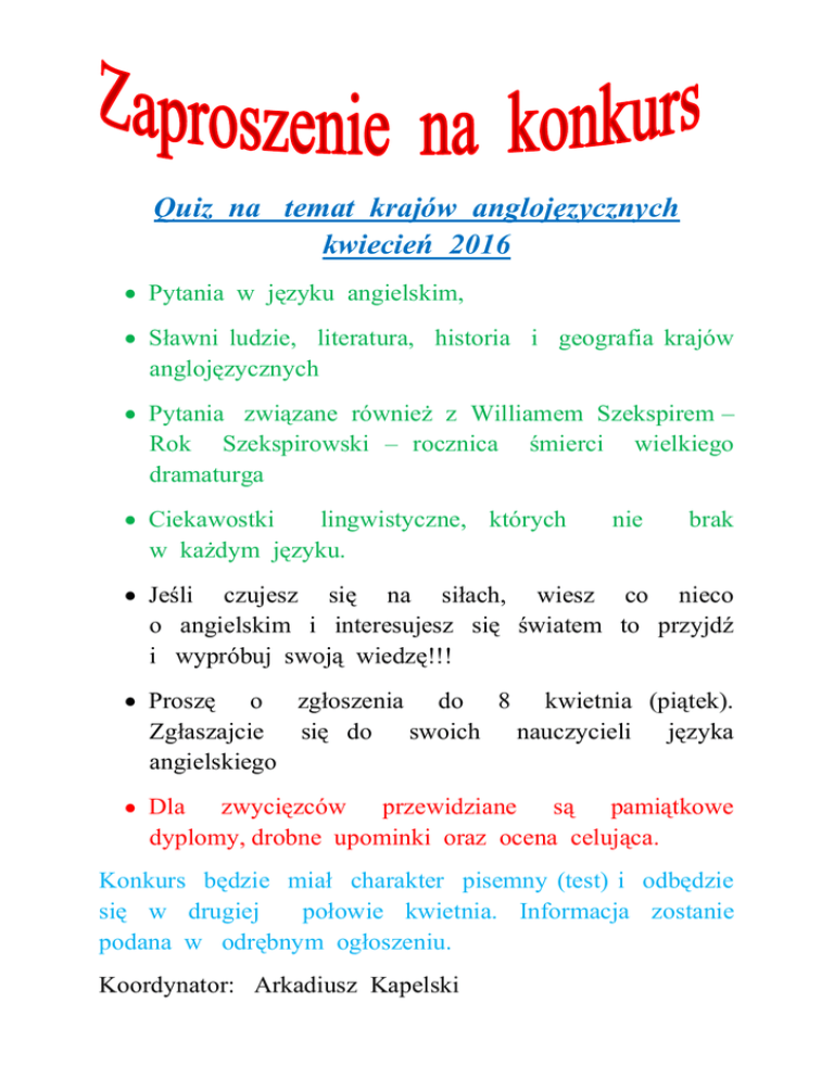 Quiz na temat krajów anglojęzycznych kwiecień 2016 Pytania w języku angielskim, Sławni ludzie, literatura, historia i geografia krajów anglojęzycznych Pytania związane również z Williamem Szekspirem – Rok Szekspirowski – rocznica śmierci wielkiego dramaturga Ciekawostki lingwistyczne, których w każdym języku. nie brak Jeśli czujesz się na siłach, wiesz co nieco o angielskim i interesujesz się światem to przyjdź i wypróbuj swoją wiedzę!!! Proszę o zgłoszenia do 8 kwietnia (piątek). Zgłaszajcie się do swoich nauczycieli języka angielskiego Dla zwycięzców przewidziane są pamiątkowe dyplomy, drobne upominki oraz ocena celująca. Konkurs będzie miał charakter pisemny (test) i odbędzie się w drugiej połowie kwietnia. Informacja zostanie podana w odrębnym ogłoszeniu. Koordynator: Arkadiusz Kapelski