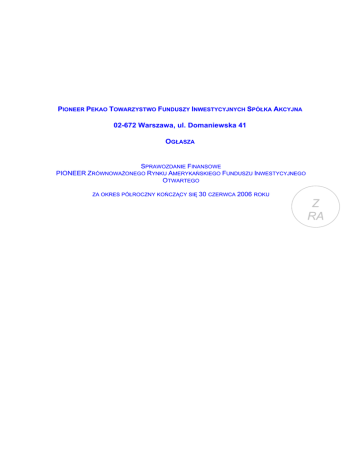 PIONEER PEKAO TOWARZYSTWO FUNDUSZY INWESTYCYJNYCH SPÓŁKA AKCYJNA 02-672 Warszawa, ul. Domaniewska 41 OGŁASZA SPRAWOZDANIE FINANSOWE PIONEER ZRÓWNOWAŻONEGO RYNKU AMERYKAŃSKIEGO FUNDUSZU INWESTYCYJNEGO OTWARTEGO ZA OKRES PÓŁROCZNY KOŃCZĄCY SIĘ 30 CZERWCA 2006 ROKU Z RA PIONEER ZRÓWNOWAŻONY RYNKU AMERYKAŃSKIEGO FUNDUSZ INWESTYCYJNY OTWARTY Sprawozdanie Finansowe za okres półroczny kończący się 30 czerwca 2006 roku Spis treści Wprowadzenie A. Fundusz Nazwa Funduszu, typ oraz konstrukcja Funduszu Podstawy prawne działania, informacje rejestrowe Funduszu, utworzenie Funduszu Opis celu inwestycyjnego, specjalizacji Funduszu Opis stosowanych ograniczeń inwestycyjnych Funduszu Informacja o założeniu kontynuowania działalności B. Towarzystwo Funduszy Inwestycyjnych Firma Towarzystwa Funduszy Inwestycyjnych, siedziba i adres Dane rejestrowe Towarzystwa Funduszy Inwestycyjnych C. Okres sprawozdawczy i dzień bilansowy D. Biegły rewident funduszu E. Jednostki Uczestnictwa Zestawienie lokat Bilans Rachunek wyniku z operacji Zestawienie zmian w aktywach netto Noty objaśniające Nota - 1 Polityka rachunkowości funduszu Przepisy prawne regulujące rachunkowość Funduszu Zasady ujawniania i prezentacji informacji w sprawozdaniu finansowym Ujmowanie operacji dotyczących Funduszu w księgach rachunkowych Wycena aktywów i pasywów Funduszu Ustalanie Wartości Aktywów Netto i wyniku z operacji Wprowadzone w okresie sprawozdawczym zmiany stosowanych zasad rachunkowości, metod wyceny oraz sposobu sporządzania sprawozdania finansowego Nota - 2 Należności Funduszu Nota - 3 Zobowiązania Funduszu Nota - 4 Środki pieniężne i ich ekwiwalenty Nota - 5 Ryzyka Nota - 6 Instrumenty pochodne Nota - 7 Transakcje przy zobowiązaniu się Funduszu lub drugiej strony do odkupu Nota - 8 Kredyty i pożyczki Nota - 9 Waluty i różnice kursowe Nota - 10 Dochody i ich dystrybucja Nota - 11 Koszty funduszu Nota - 12 Dane porównawcze o Jednostkach Uczestnictwa Informacje dodatkowe A Informacje o znaczących zdarzeniach, dotyczących lat ubiegłych, ujętych w sprawozdaniu finansowym B Informacje o znaczących zdarzeniach po dniu bilansowym C Dokonane korekty błędów podstawowych D Inne informacje Opodatkowanie Funduszu w pierwszym półroczu roku 2006 Podatek dochodowy od dochodu z tytułu odkupienia Jednostek Uczestnictwa Instytucje obsługujące Fundusz • Towarzystwo Funduszy Inwestycyjnych • Agent Obsługujący Uczestników Funduszu • Depozytariusz PIONEER ZRÓWNOWAŻONY RYNKU AMERYKAŃSKIEGO FUNDUSZ INWESTYCYJNY OTWARTY Sprawozdanie Finansowe za okres półroczny kończący się 30 czerwca 2006 roku Wprowadzenie A. Fundusz Nazwa Funduszu, typ oraz konstrukcja Funduszu Pioneer Zrównoważony Rynku Amerykańskiego Fundusz Inwestycyjny Otwarty Fundusz jest funduszem inwestycyjnym otwartym. Fundusz zbywa jednostki uczestnictwa różnych kategorii. Podstawy prawne działania, informacje rejestrowe Funduszu, utworzenie Funduszu Podstawy prawne działania Funduszu określone są w Ustawie z dnia 27 maja 2004 roku o funduszach inwestycyjnych (Dz. U. nr 146, poz. 1546 z późniejszymi zmianami), zwanej dalej Ustawą. Fundusz prowadzi działalność zgodnie z prawem wspólnotowym regulującym zasady zbiorowego inwestowania w papiery wartościowe. Statut Pioneer Zrównoważonego Rynku Amerykańskiego Funduszu Inwestycyjnego Otwartego zatwierdzony został decyzją Komisji Papierów Wartościowych i Giełd DFI/W/4032-12/20-1-2769/05 z dnia 9 czerwca 2005 roku o udzieleniu zezwolenia na utworzenie Funduszu. Fundusz został wpisany do rejestru funduszy inwestycyjnych prowadzonego przez Sąd Okręgowy w Warszawie, VII Wydział Cywilny i Rejestrowy pod numerem RFi 196 w dniu 15 lipca 2005 roku. Fundusz został utworzony w drodze zapisów polegających na dokonaniu wpłaty kwoty 4 milionów złotych przez Pioneer Pekao Towarzystwo Funduszy Inwestycyjnych S.A. Cena nabycia Jednostki uczestnictwa w ramach zapisów wynosiła 30.00 zł. Po zarejestrowaniu Funduszu, Jednostki Uczestnictwa zaczęto zbywać 25 lipca 2005 roku. Zgodnie ze Statutem Fundusz został utworzony na czas nieograniczony. Wskazane w treści niniejszego sprawozdania finansowego odwołania lub odniesienia do postanowień Statutu odnoszą się do Statutu w brzmieniu obowiązującym w dniu podpisania niniejszego sprawozdania finansowego. Opis celu inwestycyjnego, specjalizacji Funduszu Celem inwestycyjnym Funduszu jest wzrost wartości Aktywów Funduszu w wyniku wzrostu wartości lokat oraz osiąganie przychodów z lokat netto. Fundusz nie gwarantuje osiągnięcia celu inwestycyjnego. Fundusz jest funduszem zrównoważonym. Aktywa Funduszu są lokowane zarówno w instrumenty finansowe o charakterze udziałowym, rozumiane przede wszystkim jako akcje oraz inne instrumenty, których cena w bezpośredni sposób zależy od ceny jednej lub wielu akcji (kwity depozytowe, prawa do akcji, warranty, kontrakty terminowe na akcje i indeksy akcyjne) jak również te jednostki uczestnictwa funduszy inwestycyjnych otwartych mających siedzibę w Polsce lub tytuły uczestnictwa funduszy zagranicznych lub tytuły uczestnictwa instytucji wspólnego inwestowania, których polityka inwestycyjna dopuszcza lokowanie aktywów w akcje; oraz w obligacjach zamiennych na akcje, jak i w dłużne papiery wartościowe oraz w instrumenty rynku pieniężnego. Fundusz będzie inwestował swoje aktywa przede wszystkim w papiery wartościowe emitentów, których siedziba znajduje się w Stanach Zjednoczonych Ameryki Północnej (USA) lub prowadzące działalność operacyjną lub uzyskujące większość swoich przychodów w USA. Udział papierów wartościowych emitentów innych niż określonych w zdaniu poprzednim nie może być większy niż 25 % Aktywów Funduszu. Proporcje udziału poszczególnych rodzajów papierów wartościowych w Aktywach Funduszu będą uzależnione od decyzji zarządzającego Funduszem podejmowanej z uwzględnieniem warunków ekonomicznych 