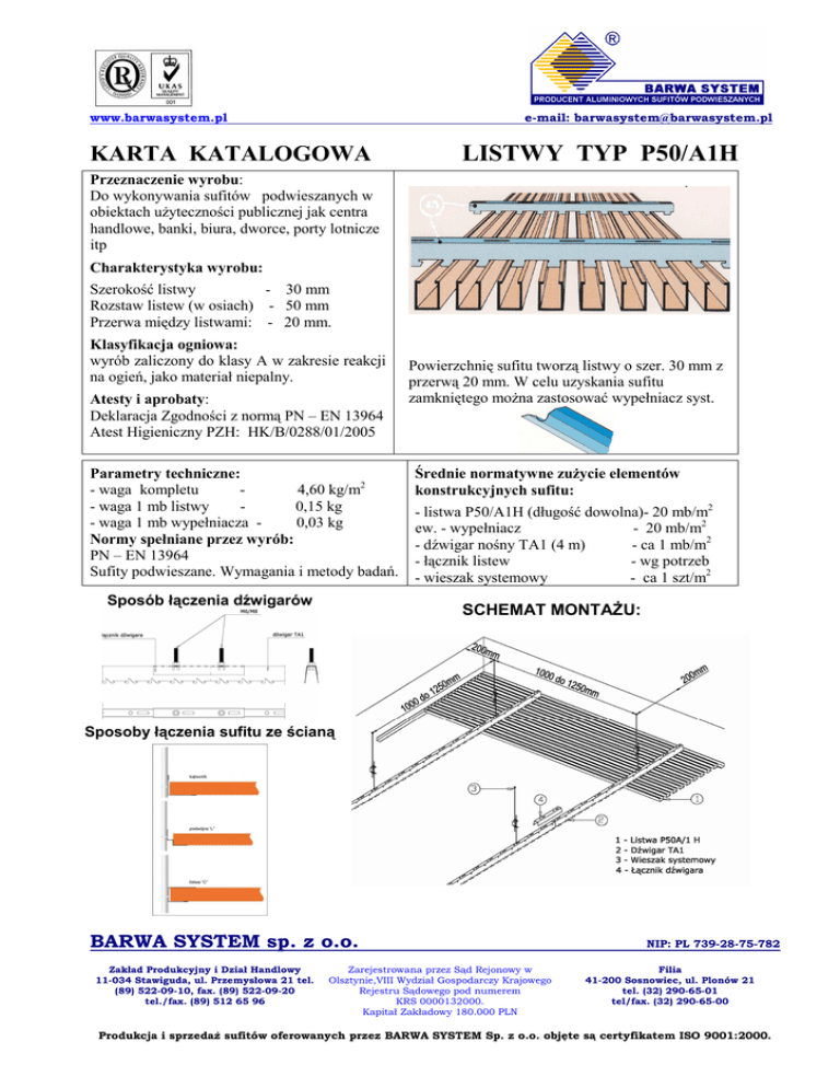 www.barwasystem.pl e-mail: [email protected] KARTA KATALOGOWA LISTWY TYP P50/A1H Przeznaczenie wyrobu: Do wykonywania sufitów podwieszanych w obiektach uŜyteczności publicznej jak centra handlowe, banki, biura, dworce, porty lotnicze itp Charakterystyka wyrobu: Szerokość listwy - 30 mm Rozstaw listew (w osiach) - 50 mm Przerwa między listwami: - 20 mm. Klasyfikacja ogniowa: wyrób zaliczony do klasy A w zakresie reakcji na ogień, jako materiał niepalny. Atesty i aprobaty: Deklaracja Zgodności z normą PN – EN 13964 Atest Higieniczny PZH: HK/B/0288/01/2005 Parametry techniczne: - waga kompletu 4,60 kg/m2 - waga 1 mb listwy 0,15 kg - waga 1 mb wypełniacza 0,03 kg Normy spełniane przez wyrób: PN – EN 13964 Sufity podwieszane. Wymagania i metody badań. Sposób łączenia dźwigarów Powierzchnię sufitu tworzą listwy o szer. 30 mm z przerwą 20 mm. W celu uzyskania sufitu zamkniętego moŜna zastosować wypełniacz syst. Średnie normatywne zuŜycie elementów konstrukcyjnych sufitu: - listwa P50/A1H (długość dowolna)- 20 mb/m2 ew. - wypełniacz - 20 mb/m2 - dźwigar nośny TA1 (4 m) - ca 1 mb/m2 - łącznik listew - wg potrzeb - wieszak systemowy - ca 1 szt/m2 SCHEMAT MONTAśU: Sposoby łączenia sufitu ze ścianą BARWA SYSTEM sp. z o.o. Zakład Produkcyjny i Dział Handlowy 11-034 Stawiguda, ul. Przemysłowa 21 tel. (89) 522-09-10, fax. (89) 522-09-20 tel./fax. (89) 512 65 96 Zarejestrowana przez Sąd Rejonowy w Olsztynie,VIII Wydział Gospodarczy Krajowego Rejestru Sądowego pod numerem KRS 0000132000. Kapitał Zakładowy 180.000 PLN NIP: PL 739-28-75-782 Filia 41-200 Sosnowiec, ul. Plonów 21 tel. (32) 290-65-01 tel/fax. (32) 290-65-00 Produkcja i sprzedaŜ sufitów oferowanych przez BARWA SYSTEM Sp. z o.o. objęte są certyfikatem ISO 9001:2000.