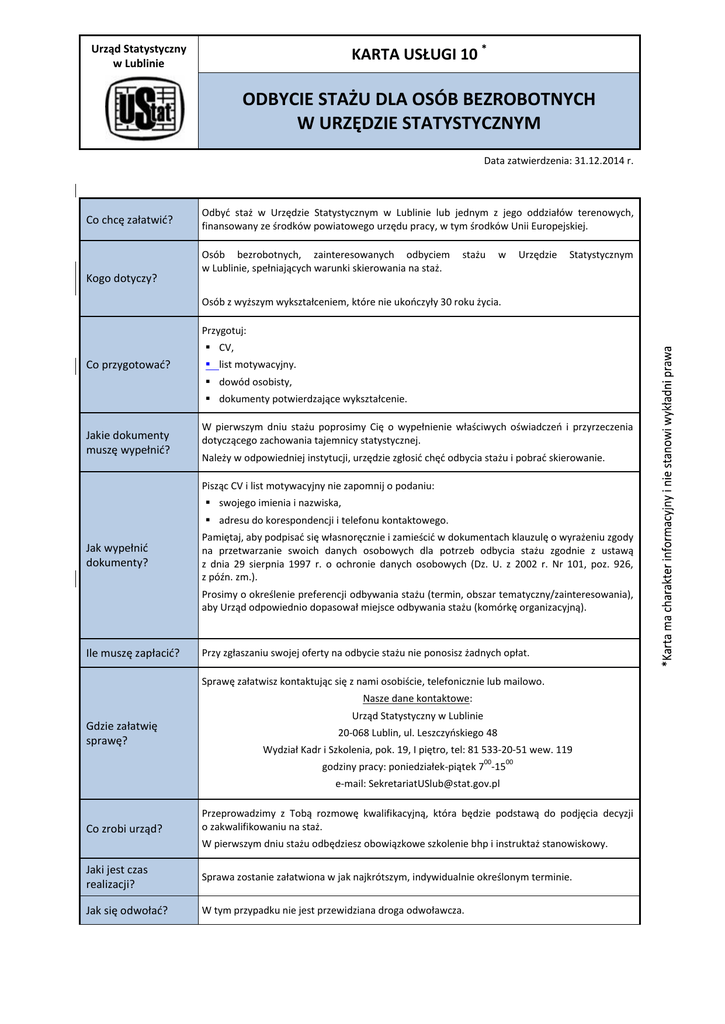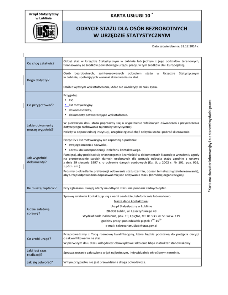 Urząd Statystyczny w Lublinie KARTA USŁUGI 10 * ODBYCIE STAŻU DLA OSÓB BEZROBOTNYCH W URZĘDZIE STATYSTYCZNYM Data zatwierdzenia: 31.12.2014 r. Co chcę załatwić? Kogo dotyczy? Odbyć staż w Urzędzie Statystycznym w Lublinie lub jednym z jego oddziałów terenowych, finansowany ze środków powiatowego urzędu pracy, w tym środków Unii Europejskiej. Osób bezrobotnych, zainteresowanych odbyciem w Lublinie, spełniających warunki skierowania na staż. stażu w Urzędzie Statystycznym Osób z wyższym wykształceniem, które nie ukończyły 30 roku życia. Przygotuj: CV, Co przygotować? list motywacyjny. dowód osobisty, dokumenty potwierdzające wykształcenie. Jakie dokumenty muszę wypełnić? W pierwszym dniu stażu poprosimy Cię o wypełnienie właściwych oświadczeń i przyrzeczenia dotyczącego zachowania tajemnicy statystycznej. Należy w odpowiedniej instytucji, urzędzie zgłosić chęć odbycia stażu i pobrać skierowanie. Pisząc CV i list motywacyjny nie zapomnij o podaniu: swojego imienia i nazwiska, adresu do korespondencji i telefonu kontaktowego. Jak wypełnić dokumenty? Pamiętaj, aby podpisać się własnoręcznie i zamieścić w dokumentach klauzulę o wyrażeniu zgody na przetwarzanie swoich danych osobowych dla potrzeb odbycia stażu zgodnie z ustawą z dnia 29 sierpnia 1997 r. o ochronie danych osobowych (Dz. U. z 2002 r. Nr 101, poz. 926, z późn. zm.). Prosimy o określenie preferencji odbywania stażu (termin, obszar tematyczny/zainteresowania), aby Urząd odpowiednio dopasował miejsce odbywania stażu (komórkę organizacyjną). Ile muszę zapłacić? Przy zgłaszaniu swojej oferty na odbycie stażu nie ponosisz żadnych opłat. Sprawę załatwisz kontaktując się z nami osobiście, telefonicznie lub mailowo. Nasze dane kontaktowe: Gdzie załatwię sprawę? Urząd Statystyczny w Lublinie 20-068 Lublin, ul. Leszczyńskiego 48 Wydział Kadr i Szkolenia, pok. 19, I piętro, tel: 81 533-20-51 wew. 119 00 00 godziny pracy: poniedziałek-piątek 7 -15 e-mail: [email protected] Co zrobi urząd? Przeprowadzimy z Tobą rozmowę kwalifikacyjną, która będzie podstawą do podjęcia decyzji o zakwalifikowaniu na staż. W pierwszym dniu stażu odbędziesz obowiązkowe szkolenie bhp i instruktaż stanowiskowy. Jaki jest czas realizacji? Sprawa zostanie załatwiona w jak najkrótszym, indywidualnie określonym terminie. Jak się odwołać? W tym przypadku nie jest przewidziana droga odwoławcza. Urząd Statystyczny w Lublinie KARTA USŁUGI 10 * ODBYCIE STAŻU DLA OSÓB BEZROBOTNYCH W URZĘDZIE STATYSTYCZNYM Data zatwierdzenia: 31.12.2014 r. Przyjęcie na staż uzależnione jest od pozytywnego rozpatrzenia wniosku przez powiatowy urząd pracy. Informacje dodatkowe Dokładny czas trwania stażu zostanie określony w umowie zawartej pomiędzy urzędem (organizatorem stażu) a powiatowym urzędem pracy. Staż nie kończy się zawarciem umowy o pracę z Urzędem. Jeżeli jesteś osobą doświadczającą trwale lub okresowo trudności w komunikowaniu się, możesz sprawy w Urzędzie załatwić w języku migowym. Zamiar skorzystania z ww. metody komunikowania się przy załatwieniu sprawy zgłoś najpóźniej na 3 dni robocze przed planowanym dniem przybycia do Urzędu. Rozporządzenie Ministra Pracy i Polityki Społecznej z dnia 20 sierpnia 2009 r. w sprawie szczegółowych warunków odbywania stażu przez bezrobotnych (Dz. U. Nr 142, poz. 1160). Podstawa prawna Ustawa z dnia 20 kwietnia 2004 r. o promocji zatrudnienia i instytucjach rynku pracy (Dz. U. z 2008 r. Nr 69, poz. 415, z późn. zm.).