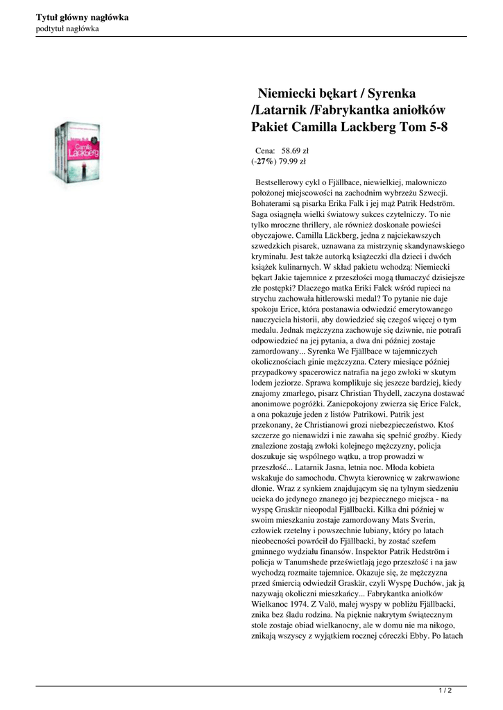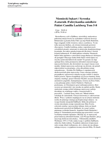 Tytuł główny nagłówka podtytuł nagłówka Niemiecki bękart / Syrenka /Latarnik /Fabrykantka aniołków Pakiet Camilla Lackberg Tom 5-8 Cena: 58.69 zł (-27%) 79.99 zł Bestsellerowy cykl o Fjällbace, niewielkiej, malowniczo położonej miejscowości na zachodnim wybrzeżu Szwecji. Bohaterami są pisarka Erika Falk i jej mąż Patrik Hedström. Saga osiągnęła wielki światowy sukces czytelniczy. To nie tylko mroczne thrillery, ale również doskonałe powieści obyczajowe. Camilla Läckberg, jedna z najciekawszych szwedzkich pisarek, uznawana za mistrzynię skandynawskiego kryminału. Jest także autorką książeczki dla dzieci i dwóch książek kulinarnych. W skład pakietu wchodzą: Niemiecki bękart Jakie tajemnice z przeszłości mogą tłumaczyć dzisiejsze złe postępki? Dlaczego matka Eriki Falck wśród rupieci na strychu zachowała hitlerowski medal? To pytanie nie daje spokoju Erice, która postanawia odwiedzić emerytowanego nauczyciela historii, aby dowiedzieć się czegoś więcej o tym medalu. Jednak mężczyzna zachowuje się dziwnie, nie potrafi odpowiedzieć na jej pytania, a dwa dni później zostaje zamordowany... Syrenka We Fjällbace w tajemniczych okolicznościach ginie mężczyzna. Cztery miesiące później przypadkowy spacerowicz natrafia na jego zwłoki w skutym lodem jeziorze. Sprawa komplikuje się jeszcze bardziej, kiedy znajomy zmarłego, pisarz Christian Thydell, zaczyna dostawać anonimowe pogróżki. Zaniepokojony zwierza się Erice Falck, a ona pokazuje jeden z listów Patrikowi. Patrik jest przekonany, że Christianowi grozi niebezpieczeństwo. Ktoś szczerze go nienawidzi i nie zawaha się spełnić groźby. Kiedy znalezione zostają zwłoki kolejnego mężczyzny, policja doszukuje się wspólnego wątku, a trop prowadzi w przeszłość... Latarnik Jasna, letnia noc. Młoda kobieta wskakuje do samochodu. Chwyta kierownicę w zakrwawione dłonie. Wraz z synkiem znajdującym się na tylnym siedzeniu ucieka do jedynego znanego jej bezpiecznego miejsca - na wyspę Graskär nieopodal Fjällbacki. Kilka dni później w swoim mieszkaniu zostaje zamordowany Mats Sverin, człowiek rzetelny i powszechnie lubiany, który po latach nieobecności powrócił do Fjällbacki, by zostać szefem gminnego wydziału finansów. Inspektor Patrik Hedström i policja w Tanumshede prześwietlają jego przeszłość i na jaw wychodzą rozmaite tajemnice. Okazuje się, że mężczyzna przed śmiercią odwiedził Graskär, czyli Wyspę Duchów, jak ją nazywają okoliczni mieszkańcy... Fabrykantka aniołków Wielkanoc 1974. Z Valö, małej wyspy w pobliżu Fjällbacki, znika bez śladu rodzina. Na pięknie nakrytym świątecznym stole zostaje obiad wielkanocny, ale w domu nie ma nikogo, znikają wszyscy z wyjątkiem rocznej córeczki Ebby. Po latach 1/2 Tytuł główny nagłówka podtytuł nagłówka Ebba wraca na wyspę jako dorosła kobieta. W rodzinnych stronach pragnie wraz z mężem otrząsnąć się po śmierci malutkiego synka. Postanawiają wyremontować i otworzyć dla gości stary ośrodek kolonijny, którym wiele lat temu zarządzał surowy ojciec Ebby. Wkrótce po rozpoczęciu prac remontowych oboje omal nie giną w tajemniczym pożarze. Równie tajemnicze są stare ślady zaschniętej krwi odnalezione pod zerwaną podłogą w jadalni. Do akcji wkracza Patrik Hedström. Czy zdoła wyjaśnić zagadkę z przeszłości? 2/2 Powered by TCPDF (www.tcpdf.org)