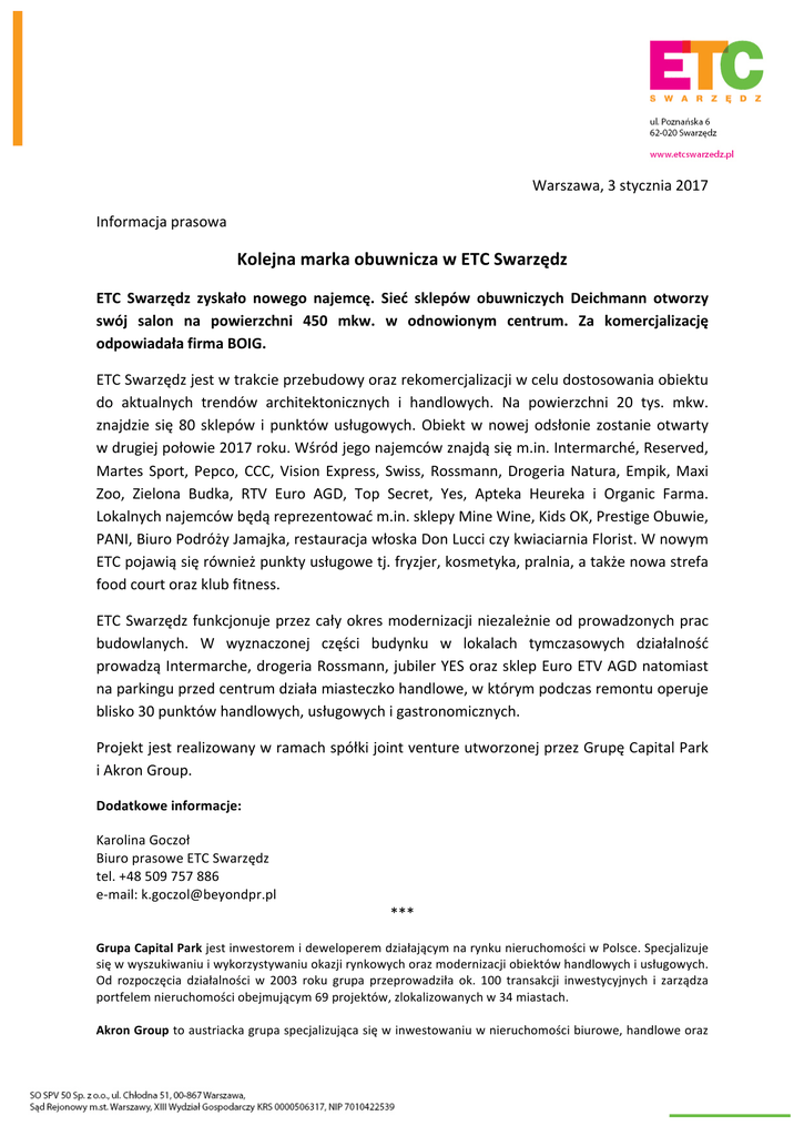 Warszawa,3stycznia2017 Informacjaprasowa KolejnamarkaobuwniczawETCSwarzędz ETC Swarzędz zyskało nowego najemcę. Sieć sklepów obuwniczych Deichmann otworzy swój salon na powierzchni 450 mkw. w odnowionym centrum. Za komercjalizację odpowiadałafirmaBOIG. ETCSwarzędzjestwtrakcieprzebudowyorazrekomercjalizacjiwceludostosowaniaobiektu do aktualnych trendów architektonicznych i handlowych. Na powierzchni 20 tys. mkw. znajdzie się 80 sklepów i punktów usługowych. Obiekt w nowej odsłonie zostanie otwarty wdrugiejpołowie2017roku.Wśródjegonajemcówznajdąsięm.in.Intermarché,Reserved, Martes Sport, Pepco, CCC, Vision Express, Swiss, Rossmann, Drogeria Natura, Empik, Maxi Zoo, Zielona Budka, RTV Euro AGD, Top Secret, Yes, Apteka Heureka i Organic Farma. Lokalnychnajemcówbędąreprezentowaćm.in.sklepyMineWine,KidsOK,PrestigeObuwie, PANI,BiuroPodróżyJamajka,restauracjawłoskaDonLucciczykwiaciarniaFlorist.Wnowym ETCpojawiąsięrównieżpunktyusługowetj.fryzjer,kosmetyka,pralnia,atakżenowastrefa foodcourtorazklubfitness. ETCSwarzędzfunkcjonujeprzezcałyokresmodernizacjiniezależnieodprowadzonychprac budowlanych. W wyznaczonej części budynku w lokalach tymczasowych działalność prowadząIntermarche,drogeriaRossmann,jubilerYESorazsklepEuroETVAGDnatomiast naparkinguprzedcentrumdziałamiasteczkohandlowe,wktórympodczasremontuoperuje blisko30punktówhandlowych,usługowychigastronomicznych. ProjektjestrealizowanywramachspółkijointventureutworzonejprzezGrupęCapitalPark iAkronGroup. Dodatkoweinformacje: KarolinaGoczoł BiuroprasoweETCSwarzędz tel.+48509757886 e-mail:[email protected] *** GrupaCapitalParkjestinwestoremideweloperemdziałającymnarynkunieruchomościwPolsce.Specjalizuje sięwwyszukiwaniuiwykorzystywaniuokazjirynkowychorazmodernizacjiobiektówhandlowychiusługowych. Od rozpoczęcia działalności w 2003 roku grupa przeprowadziła ok. 100 transakcji inwestycyjnych i zarządza portfelemnieruchomościobejmującym69projektów,zlokalizowanychw34miastach. AkronGrouptoaustriackagrupaspecjalizującasięwinwestowaniuwnieruchomościbiurowe,handloweoraz logistyczne. Firma działa na rynku austriackim, polskim, węgierskim oraz holenderskim oferując możliwości inwestowaniam.in.dlainwestorówindywidualnychorazinstytucjonalnych.
