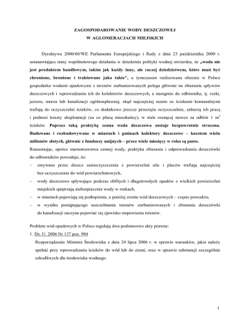ZAGOSPODAROWANIE WODY DESZCZOWEJ W AGLOMERACJACH MIEJSKICH Dyrektywa 2000/60/WE Parlamentu Europejskiego i Rady z dnia 23 pa dziernika 2000 r. ustanawiaj ca ramy wspólnotowego dzia ania w dziedzinie polityki wodnej stwierdza, e „woda nie jest produktem handlowym, takim jak ka dy inny, ale raczej dziedzictwem, które musi by chronione, bronione i traktowane jako takie", a tymczasem realizowana obecnie w Polsce gospodarka wodami opadowymi z terenów zurbanizowanych polega g ównie na zbieraniu sp ywów deszczowych i wprowadzaniu ich do kolektorów deszczowych, a nast pnie do odbiornika, tj. rzeki, jeziora, morza lub kanalizacji ogólnosp awnej, sk d najcz ciej razem ze ciekami komunalnymi trafiaj do oczyszczalni cieków, co dodatkowo jeszcze przeci a oczyszczalnie, zaburz ich prac i podnosi koszty eksploatacji (za co p ac mieszka cy), w stale rosn cej stawce za odbiór 1 m3 cieków. Poprzez tak praktyk cenna woda deszczowa zostaje bezpowrotnie stracona. Budowane i rozbudowywane w miastach i gminach kolektory deszczowe – kosztem wielu milionów z otych, g ównie z funduszy unijnych – przez wiele miesi cy w roku s puste. Reasumuj c, oprócz marnotrawstwa cennej wody, praktyka zbierania i odprowadzania deszczówki do odbiorników powoduje, e: – zmywane przez deszcz zanieczyszczenia z powierzchni ulic i placów trafiaj najcz ciej bez oczyszczenia do wód powierzchniowych, – wody deszczowe sp ywaj ce podczas obfitych i d ugotrwa ych opadów z wielkich powierzchni miejskich spi trzaj niebezpiecznie wody w rzekach, – w miastach pojawiaj si podtopienia, a poni ej zrzutu wód deszczowych – cz sto powodzie, – w wyniku post puj cego uszczelniania terenów zurbanizowanych i zbierania deszczówki do kanalizacji zaczyna pojawia si zjawisko stepowienia terenów. Problem wód opadowych w Polsce reguluj dwa podstawowe akty prawne: 1. Dz. U. 2006 Nr 137 poz. 984 Rozporz dzenie Ministra rodowiska z dnia 24 lipca 2006 r. w sprawie warunków, jakie nale y spe ni przy wprowadzaniu cieków do wód lub do ziemi, oraz w sprawie substancji szczególnie szkodliwych dla rodowiska wodnego. 1 Zgodnie z §§ 19-22 tego rozporz dzenia, reguluje si post powanie z wodami opadowymi i roztopowymi, które s uj te w szczelne, otwarte lub zamkni te systemy kanalizacyjne z terenów zanieczyszczonych miast i obszarów przemys owych, parkingów powy ej 1000 m2. 2. Dz. U. 2002 Nr 75 poz. 690 Rozporz dzenie Ministra Infrastruktury z dnia 12 kwietnia 2002 r. w sprawie warunków technicznych, jakim powinny odpowiada budynki i ich usytuowanie (Rozdzia 5). Zgodnie z § 28 warunków technicznych, dzia ka budowlana, na której sytuowane s budynki, powinna by wyposa ona w kanalizacj umo liwiaj odprowadzenie wód opadowych do sieci kanalizacji deszczowej lub ogólnosp awnej, dopuszcza si odprowadzenie wód opadowych na w asny teren nieutwardzony, do do ów ch onnych lub do zbiorników retencyjnych. Zatem w wietle obowi zuj cych przepisów miejscowe zagospodarowanie wody deszczowej w Polsce mo e by jedynie zalecane w planach zagospodarowania przestrzennego w decyzjach o ustaleniu warunków zabudowy. Jednak zapis taki nie mo e by stosowany jako nakaz, bo by by sprzeczny z obowi zuj cymi przepisami. Ostatnia zmiana ustawy Prawo Wodne z dnia 5 stycznia 2011 r. nie wprowadzi a jednoznacznie do swoich zapisów problemu wód deszczowych. Zagospodarowanie wód opadowych i roztopowych. Istniej proste metody ograniczenia ilo ci wód opadowych i roztopowych sp ywaj cych do odbiorników poprzez zatrzymanie ich w miejscu deszczu lub roztopów oraz utrudnienie odp ywu wody do kanalizacji. Realizowa to mo na poprzez rozs czanie wód do gruntu lub retencjonowanie w celu spowolnienia odp ywu lub pó niejsze ich gospodarcze wykorzystanie. Rozs czanie wód opadowych do gruntu Rozró nia si dwa podstawowe systemy odprowadzania deszczu do gruntu: – powierzchniowy – polega na wprowadzeniu sp ywów opadowych przez powierzchnie zielone oraz nieszczelne powierzchnie, – podziemny – polega na wprowadzeniu wody deszczowej i roztopowej do specjalnych urz dze , a nast pnie rozs czaniu zgromadzonej wody do gruntu. 2 Rozs czanie powierzchniowe sp ywów wód deszczowych do gruntu mo e odbywa si poprzez: – trawniki, ogródki przydomowe, tereny zielone z krzewami, drzewami, – rowy trawiaste, rowy ch onne, niecki ch onne, – chodniki, parkingi, place o powierzchni a urowej lub wykonane z p yt, kostki w ten sposób, aby powsta y mi dzy nimi szpary umo liwiaj ce wsi kanie opadu, – drogi, place, parkingi wykonane z przesi kliwego asfaltobetonu, – ziemne zbiorniki ch onne. Rozs czanie podziemne sp ywów wód opadowych i roztopowych do gruntu mo e si odbywa poprzez: rozwi zania tradycyjne, tj.: – podziemne zbiorniki wype nione wirem, – studnie ch onne, oraz efektywne i nowoczesne urz dzenia z du – skrzynki rozs czaj ce, – komory drena owe. powierzchni ch onn : Retencjonowanie wód opadowych Przetrzymywanie i opó nienie odprowadzenia wód opadowych i roztopowych do odbiornika mo na realizowa poprzez: – retencjonowanie wód na powierzchni zlewni, – retencjonowanie cieków w sieci kanalizacyjnej, – retencjonowanie cieków w specjalnie budowanych zbiornikach podziemnych: tradycyjnie elbetowych lub nowoczesnych z komór drena owych lub skrzynek. W czasie nawalnych deszczów lub gwa townych roztopów odp yw wód z terenu odwadnianego ma cz sto charakter gwa towny, a nat enie przep ywu przekracza niejednokrotnie zdolno ci przepustowe kanalizacji deszczowej i odbiorników. W takiej sytuacji zastosowanie urz dze do retencji powoduje zmian struktury odp ywu. Spowolniony, równomierny odp yw do odbiornika jest bardzo wa ny z uwagi na powodzie oraz równowag biologiczn odbiornika. Retencjonowan wod mo na tak e wykorzysta gospodarczo, np. w okresach bezdeszczowych do podlewania zieleni czy mycia ulic. Zalety miejscowego zagospodarowania wody opadowej i roztopowej 1. Systemy do miejscowego zagospodarowania wód mo na stosowa do zagospodarowania w