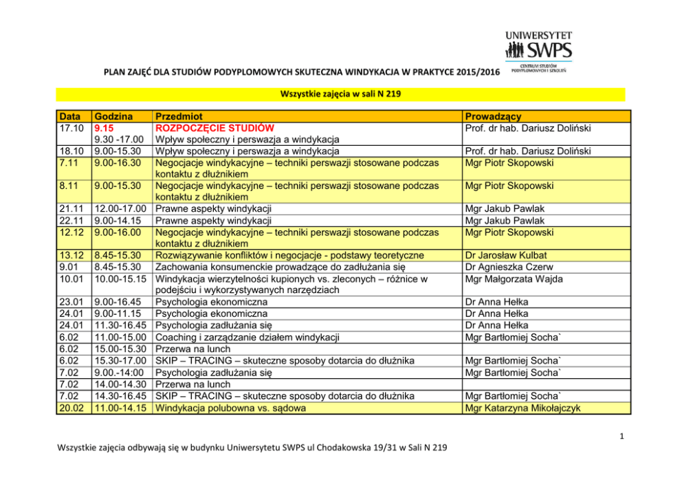 PLAN ZAJĘĆ DLA STUDIÓW PODYPLOMOWYCH SKUTECZNA WINDYKACJA W PRAKTYCE 2015/2016 Wszystkie zajęcia w sali N 219 Data 17.10 18.10 7.11 Godzina 9.15 9.30 -17.00 9.00-15.30 9.00-16.30 8.11 9.00-15.30 21.11 22.11 12.12 12.00-17.00 9.00-14.15 9.00-16.00 13.12 9.01 10.01 8.45-15.30 8.45-15.30 10.00-15.15 23.01 24.01 24.01 6.02 6.02 6.02 7.02 7.02 7.02 20.02 9.00-16.45 9.00-11.15 11.30-16.45 11.00-15.00 15.00-15.30 15.30-17.00 9.00.-14:00 14.00-14.30 14.30-16.45 11.00-14.15 Przedmiot ROZPOCZĘCIE STUDIÓW Wpływ społeczny i perswazja a windykacja Wpływ społeczny i perswazja a windykacja Negocjacje windykacyjne – techniki perswazji stosowane podczas kontaktu z dłużnikiem Negocjacje windykacyjne – techniki perswazji stosowane podczas kontaktu z dłużnikiem Prawne aspekty windykacji Prawne aspekty windykacji Negocjacje windykacyjne – techniki perswazji stosowane podczas kontaktu z dłużnikiem Rozwiązywanie konfliktów i negocjacje - podstawy teoretyczne Zachowania konsumenckie prowadzące do zadłużania się Windykacja wierzytelności kupionych vs. zleconych – różnice w podejściu i wykorzystywanych narzędziach Psychologia ekonomiczna Psychologia ekonomiczna Psychologia zadłużania się Coaching i zarządzanie działem windykacji Przerwa na lunch SKIP – TRACING – skuteczne sposoby dotarcia do dłużnika Psychologia zadłużania się Przerwa na lunch SKIP – TRACING – skuteczne sposoby dotarcia do dłużnika Windykacja polubowna vs. sądowa Prowadzący Prof. dr hab. Dariusz Doliński Prof. dr hab. Dariusz Doliński Mgr Piotr Skopowski Mgr Piotr Skopowski Mgr Jakub Pawlak Mgr Jakub Pawlak Mgr Piotr Skopowski Dr Jarosław Kulbat Dr Agnieszka Czerw Mgr Małgorzata Wajda Dr Anna Hełka Dr Anna Hełka Dr Anna Hełka Mgr Bartłomiej Socha` Mgr Bartłomiej Socha` Mgr Bartłomiej Socha` Mgr Bartłomiej Socha` Mgr Katarzyna Mikołajczyk 1 Wszystkie zajęcia odbywają się w budynku Uniwersytetu SWPS ul Chodakowska 19/31 w Sali N 219 PLAN ZAJĘĆ DLA STUDIÓW PODYPLOMOWYCH SKUTECZNA WINDYKACJA W PRAKTYCE 2015/2016 Wszystkie zajęcia w sali N 219 20.02 20.02 21.02 21.02 21.02 Data 5.03 5.03 14.15-14.45 14.45-17.00 9.00-12.15 12.15-12.45 12.45-15.00 Godzina 10.00-12.15 12.30-13.00 5.03 5.03 6.03 19.03 19.03 19.03 20.03 9.04 13.00-13.30 13.30-16.45 9.00-15.00 12.00-13.15 13.15-13.45 13.45-17.00 9.00-14.15 11.00-16.15 10.04 9.00-12.15 23.04 24.04 9.00-16.00 9.00-12.15 Przerwa na lunch Dobre praktyki windykacyjne Mgr Katarzyna Mikołajczyk Windykacja polubowna vs. sądowa Mgr Katarzyna Mikołajczyk Przerwa na lunch Dobre praktyki windykacyjne Mgr Katarzyna Mikołajczyk Przedmiot Prowadzący SKIP – TRACING – skuteczne sposoby dotarcia do dłużnika Mgr Bartłomiej Socha Egzamin testowy część 1 (Negocjacje windykacyjne – techniki perswazji stosowane podczas kontaktu z dłużnikiem; Wpływ społeczny i perswazja a windykacja; Rozwiązywanie konfliktów i negocjacje - podstawy teoretyczne; Psychologia ekonomiczna; Psychologia zadłużania cz.1 (Hełka); Zachowania konsumenckie prowadzące do zadłużania się; Windykacja wierzytelności kupionych vs. zleconych – różnice w podejściu i wykorzystywanych narzędziach; Windykacja polubowna vs. Sądowa; Dobre praktyki windykacyjne; SKIP – TRACING – skuteczne sposoby dotarcia do dłużnika) Przerwa na lunch Coaching i zarządzanie działem windykacji Mgr Bartłomiej Socha Coaching i zarządzanie działem windykacji Mgr Bartłomiej Socha Działalność UOKiK, a branża windykacyjna Mgr Jakub Pawlak Przerwa na lunch Prawne aspekty windykacji Mgr Jakub Pawlak Działalność UOKiK, a branża windykacyjna Mgr Jakub Pawlak Marketing windykacyjny – sposoby komunikacji z dłużnikiem. Dr Tomasz Grzyb Wykorzystywanie odkryć z zakresu psychologii wywierania wpływu Marketing windykacyjny – sposoby komunikacji z dłużnikiem. Dr Tomasz Grzyb Wykorzystywanie odkryć z zakresu psychologii wywierania wpływu Psychologia podejmowania decyzji Dr Jakub Traczyk Psychologia podejmowania decyzji Dr Jakub Traczyk 2 Wszystkie zajęcia odbywają się w budynku Uniwersytetu SWPS ul Chodakowska 19/31 w Sali N 219 PLAN ZAJĘĆ DLA STUDIÓW PODYPLOMOWYCH SKUTECZNA WINDYKACJA W PRAKTYCE 2015/2016 Wszystkie zajęcia w sali N 219 24.04 24.04 21.05 12.15-12.45 12.45-16.45 8.45-15.30 22.05 Data 04.06 05.06 10.00-16:00 Godzina 8.45-15.30 11.00-11:30 05.06 11.45-17.00 25.06 26.06 9.00-16.00 9.00-16.00 Przerwa na lunch Podstawowe zagadnienia z zakresu egzekucji sądowej Mgr Grzegorz Godlewski Windykacja dużych wierzytelności - sposoby odzyskiwania Mgr Aleksandra Januszewska wierzytelności zabezpieczonych hipotecznie, windykacja spółek Podstawowe zagadnienia z zakresu egzekucji sądowej Mgr Grzegorz Godlewski Przedmiot Prowadzący Praktyczne aspekty windykacji prawnej – warsztat Mgr Natalia Dudek Egzamin testowy część 2 (Ps. Zadłużania cz.2 (mgr Socha); Marketing windykacyjny+; Coaching i zarządzanie działem windykacji; Prawne aspekty windykacji; Działalność UOKiK, a branża windykacyjna; Praktyczne aspekty windykacji prawnej – warsztat; Podstawowe zagadnienia z zakresu egzekucji sądowej; Windykacja dużych wierzytelności - sposoby odzyskiwania wierzytelności zabezpieczonych hipotecznie, windykacja spółek; Windykacja wierzytelności kupionych vs. zleconych – różnice w podejściu i wykorzystywanych narzędziach; Psychologia podejmowania decyzji) Marketing windykacyjny – sposoby komunikacji z dłużnikiem. Wykorzystywanie odkryć z zakresu psychologii wywierania wpływu Mgr Bartłomiej Socha Gra windykacyjna Mgr Bartłomiej Socha i Mgr Piotr Gra windykacyjna Skopowski 3 Wszystkie zajęcia odbywają się w budynku Uniwersytetu SWPS ul Chodakowska 19/31 w Sali N 219