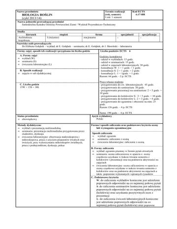 Nazwa przedmiotu BIOLOGIA ROŚLIN (cykl 2013/14) Termin realizacji (rok, semestr) I rok/ 1 semestr Kod ECTS 6.17-BR Nazwa jednostki prowadzącej przedmiot Samodzielna Katedra Ochrony Powierzchni Ziemi / Wydział Przyrodniczo-Techniczny Studia kierunek stopień forma specjalność Architektura I (inżynier) stacjonarne krajobrazu Nazwisko osób prowadzących: Dr Elżbieta Gołąbek – wykład; dr E. Gołąbek – seminaria; dr E. Gołąbek, dr J. Sławiński – laboratoria Formy zajęć, sposób ich realizacji i przypisana im liczba godzin • • • A. Formy zajęć wykład (W) seminaria (S) ćwiczenia laboratoryjne (L) • B. Sposób realizacji zajęcia w sali dydaktycznej C. Liczba godzin 15W + 15S + 30L Status przedmiotu • obowiązkowy Metody dydaktyczne • wykład z prezentacją multimedialną • seminaria: prezentacja multimedialna przygotowana przez studentów, dyskusja • ćwiczenia laboratoryjne: obserwacja makroskopowa i mikroskopowa, praca z użyciem preparatów trwałych oraz świeżych, przy wykorzystaniu mikroskopów świetlnych, praca z podręcznikiem, dyskusja, pokaz Liczba punktów ECTS specjalizacja - 6 Godziny kontaktowe - udział w wykładach: 15 godz. - udział w seminariach: 15 godz. - udział w zajęciach laboratoryjnych: 30 godz. - konsultacje W: 1 × 1 godz. = 1 godz. - konsultacje S: 2 × 1 godz. = 2 godz. - konsultacje L: 1 × 1godz. = 1 godz. Razem: 64 godz. - 2 p. ECTS Praca własna studenta - przygotowanie do ćw. laboratoryjnych: 45 godz. - przygotowanie do seminarium: 30 godz. - przygotowanie prezentacji na seminarium: 2 × 5 godz. = 10 godz. - przygotowanie do kolokwiów S: 2 × 5 godz. = 10 godz. - przygotowanie do kolokwiów L: 2 × 3 godz. = 6 godz. - przygotowanie do egzaminu i obecność na nim: 25 godz. Razem 126 godz. – 4 p. ECTS Suma: 190 godz. - 6 p. ECTS Język wykładowy Polski Forma i sposób zaliczenia oraz podstawowe kryteria oceny lub wymagania egzaminacyjne Sposób zaliczenia • wykład: egzamin • seminaria: zaliczenie z oceną • ćwiczenia laboratoryjne: zaliczenie z oceną B. Formy zaliczenia • wykład: egzamin pisemny w formie pytań otwartych • seminaria: ocena zaliczeniowa w oparciu o oceny cząstkowe uzyskane w trakcie trwania semestru z kolokwiów i prezentacji oraz na podstawie aktywności na zajęciach • ćwiczenia laboratoryjne: ocena zaliczeniowa w oparciu o oceny cząstkowe uzyskane w trakcie trwania semestru z kolokwiów oraz na podstawie aktywności na zajęciach a także poprawnie wykonanych i opisanych rysunków C. Podstawowe kryteria W: do zaliczenia wykładów konieczne jest udzielenie poprawnych odpowiedzi na co najmniej połowę pytań S: do zaliczenia seminariów konieczne jest udzielenie poprawnych odpowiedzi na co najmniej połowę pytań (kolokwia) oraz uzyskanie pozytywnych ocen z prezentacji L: do zaliczenia ćwiczeń laboratoryjnych konieczne jest udzielenie poprawnych odpowiedzi na co najmniej połowę pytań (kolokwia) oraz poprawne wykonanie i opis rysunków Określenie przedmiotów wprowadzających wraz z wymogami wstępnymi A. Wymagania formalne: brak B. Wymagania wstępne: brak Cele przedmiotu Znajomość i rozumienie podstawowych zagadnień dotyczących różnorodności anatomiczno-morfologicznej roślin, procesów fizjologicznych w nich zachodzących oraz ich przystosowania do specyficznych warunków środowiskowych. Treści programowe A. Problematyka wykładu: Ogólna charakterystyka roślin. Skład chemiczny roślin. Struktura i funkcje komórki roślinnej. Ukształtowanie ciała organizmów plechowych oraz osiowych – tkanki. Ukształtowanie ciała organizmów osiowych – organy. Współzależność budowy i funkcji. Haploidalna i diploidalna faza rozwoju roślin. Metabolizm roślin. Odżywianie się roślin. Uzyskiwanie energii przez rośliny. Rozwój i morfogeneza roślin. Regulacja rozwoju i morfogenezy roślin. Fazy rozwoju ontogenetycznego roślin. Adaptacja roślin do trudnych warunków środowiska. Rytmika rozwojowa roślin. B. Problematyka seminariów: Przedmiot i zadania botaniki, historia botaniki, główne dyscypliny botaniczne. Rośliny w gospodarce człowieka (wykorzystanie i biotechnologia roślin). Budowa i funkcje części składowych komórki roślinnej. Rodzaje, budowa i funkcje tkanek roślinnych. Rodzaje, budowa i funkcje organów wegetatywnych. Woda w życiu roślin. Ruchy roślin. Roślina a środowisko i siedlisko. Wpływ czynników środowiskowych na rośliny. Rozmieszczenie roślin na Ziemi. C. Problematyka ćwiczeń laboratoryjnych: Metody obserwacji obiektów botanicznych. Technika wykonywania rysunków, przygotowywanie prostych preparatów mikroskopowych. Struktura komórki roślinnej. Budowa tkanek roślinnych – tkanki twórcze, tkanki okrywające, tkanki miękiszowe, tkanki mechaniczne, tkanki przewodzące. Morfologia i anatomia korzenia. Morfologia i anatomia łodygi. Morfologia i anatomia liścia. Morfologia kwiatu. Morfologia owoców. Kiełkowanie i rozwój siewek. Modyfikacje struktury i funkcjonowania roślin jako reakcja na czynniki środowiska. Badanie znaczenia wody dla życia rośliny. Wykaz literatury A. Literatura wymagana do ostatecznego zaliczenia zajęć: A.1. wykorzystywana podczas zajęć 1. Kopcewicz J. 2012. Podstawy biologii roślin. Wyd. Nauk. PWN, Warszawa. 2. Pałczyński A., Jasnowska J. 1993. Atlas botaniczny – ćwiczenia. Wyd. Nauk. PWN, Warszawa. 3. Pałczyński A., Jasnowska J. 1993. Atlas botaniczny – ilustracje. Wyd. Nauk. PWN, Warszawa. 4. Szweykowska A., Szweykowski J. 2007. Botanika. T. I. Morfologia. Wyd. Nauk. PWN, Warszawa. 5. Szweykowska A., Szweykowski J. 2009. Botanika. T. II. Systematyka. Wyd. Nauk. PWN, Warszawa. A.2. studiowana samodzielnie przez studenta jw. B. Literatura uzupełniająca 1. Falińska K. 2012. Ekologia roślin. Wyd. Nauk. PWN, Warszawa. 2. Kopcewicz J., Lewak S.(red.) 2002. Fizjologia roślin. Wyd. Nauk. PWN, Warszawa. 3. Kornaś J., Medwecka-Kornaś A. 1986. Geografia roślin. PWN, Warsz