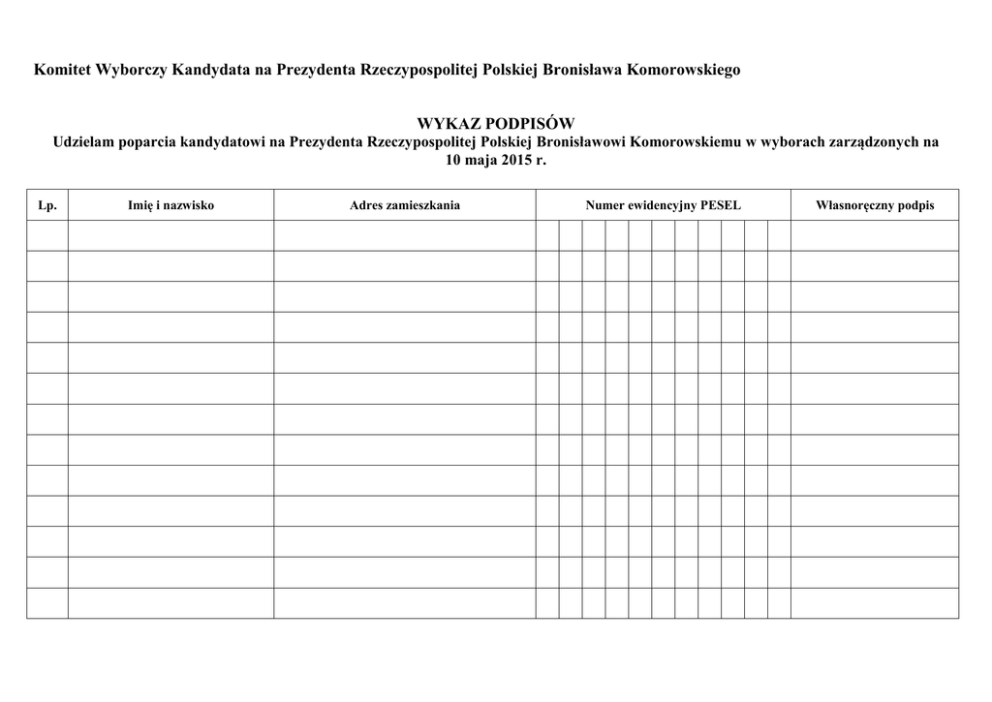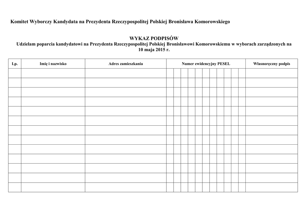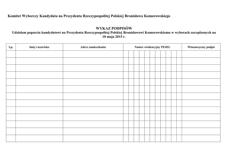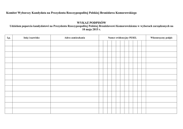 Komitet Wyborczy Kandydata na Prezydenta Rzeczypospolitej Polskiej Bronisława Komorowskiego WYKAZ PODPISÓW Udzielam poparcia kandydatowi na Prezydenta Rzeczypospolitej Polskiej Bronisławowi Komorowskiemu w wyborach zarządzonych na 10 maja 2015 r. Lp. Imię i nazwisko Adres zamieszkania Numer ewidencyjny PESEL Własnoręczny podpis