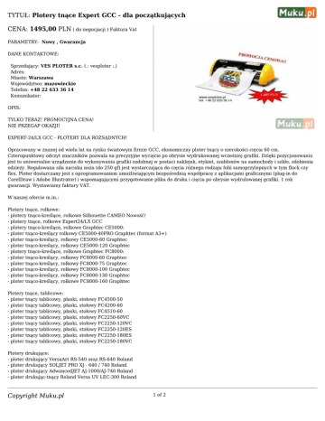 TYTUŁ: Plotery tnące Expert GCC - dla początkujących CENA: 1495,00 PLN ( do negocjacji ) Faktura Vat PARAMETRY: Nowy , Gwarancja DANE KONTAKTOWE: Sprzedający: VES PLOTER s.c. (.: vesploter :.) Adres: Miasto: Warszawa Województwo: mazowieckie Telefon: +48 22 633 36 14 Komunikator: OPIS: TYLKO TERAZ! PROMOCYJNA CENA! NIE PRZEGAP OKAZJI! EXPERT-24/LX GCC - PLOTERY DLA ROZSĄDNYCH! Opracowany w znanej od wielu lat na rynku światowym firmie GCC, ekonomiczny ploter tnący o szerokości cięcia 60 cm. Czteropunktowy odczyt znaczników pozwala na precyzyjne wycięcie po obrysie wydrukowanej wcześniej grafiki. Dzięki pozycjonowaniu jest to uniwersalne urządzenie do wykonywania grafiki ozdobnej w postaci naklejek, etykiet, szablonów na samochody i szkło, zdobienia odzieży. Regulowana siła nacisku noża (do 250 gf) jest wystarczająca do cięcia różnego rodzaju folii samoprzylepnych w tym flock czy flex. Ploter dostarczany jest z oprogramowaniem umożliwiającym bezpośrednią współpracę z aplikacjami graficznymi (plug-in do CorelDraw i Adobe Illustrator) i wspomagającymi przygotowanie pliku do druku i cięcia po obrysie wydrulowanej grafiki. 1 rok gwarancji. Wystawiamy faktury VAT. W naszej ofercie m.in.: Plotery tnące, rolkowe: - plotery tnąco-kreślące, rolkowe Silhouette CAMEO Nowość! - plotery tnące, rolkowe Expert24/LX GCC - plotery tnąco-kreślące, rolkowe Graphtec CE5000: - ploter tnąco-kreślący rolkowy CE5000-40PRO Graphtec (format A3+) - ploter tnąco-kreślący, rolkowy CE5000-60 Graphtec - ploter tnąco-kreślący, rolkowy CE5000-120 Graphtec - plotery tnąco-kreślące, rolkowe Graphtec FC8000: - ploter tnąco-kreślący, rolkowy FC8000-60 Graphtec - ploter tnąco-kreślący, rolkowy FC8000-75 Graphtec - ploter tnąco-kreślący, rolkowy FC8000-100 Graphtec - ploter tnąco-kreślący, rolkowy FC8000-130 Graphtec - ploter tnąco-kreślący, rolkowe FC8000-160 Graphtec Plotery tnące, tablicowe: - ploter tnący tablicowy, płaski, stołowy FC4500-50 - ploter tnący tablicowy, płaski, stołowy FC4200-60 - ploter tnący tablicowy, płaski, stołowy FC4510-60 - ploter tnący tablicowy, płaski, stołowy FC2250-60VC - ploter tnący tablicowy, płaski, stołowy FC2250-120VC - ploter tnący tablicowy, płaski, stołowy FC2250-120ES - ploter tnący tablicowy, płaski, stołowy FC2250-180ES - ploter tnący tablicowy, płaski, stołowy FC2250-180VC Plotery drukujące: - ploter drukujący VersaArt RS-540 oraz RS-640 Roland - ploter drukujący SOLJET PRO XJ - 640 / 740 Roland - ploter drukujący AdwancedJET AJ-1000/AJ-740 Roland - ploter drukując-tnący Roland Versa UV LEC-300 Roland Copyright Muku.pl 1 of 2 - ploter drukujący HI-FI Express FP-740 Roland - ploter drukująco-tnący VersaCAMM VP-540 / VP-300 Roland - ploter drukująco-tnący SOLJET PRO III XC-540 - ploter drukujący JM160 NOWOŚĆ! - drukarki wielkoformatowe: - drukarka wielkoformatowa Canon iPF605 - drukarka wielkoformatowa Canon iPF610 - drukarka wielkoformatowa Canon iPF650 - drukarka wielkoformatowa Canon iPF655 - drukarka wielkoformatowa Canon iPF750 - drukarka wielkoformatowa Canon iPF755 - drukarka wielkoformatowa Canon iPF810 - drukarka wielkoformatowa Canon LP17 - drukarka wielkoformatowa Canon iPF5100 - drukarka wielkoformatowa Canon iPF6100 - drukarka wielkoformatowa Canon iPF6200 - drukarka wielkoformatowa Canon iPF8100 - drukarka wielkoformatowa Canon iPF9100 - drukarka wielkoformatowa Canon iPF6000S - drukarka wielkoformatowa Canon iPF8000S - drukarka wielkoformatowa Canon iPF9000S Skanery wielkoformatowe: - skaner wielkoformatowy CSX300 Graphtec Rejestratory: - rejestrator GRAPHTEC GL220 - wielokanałowy rejestrator GRAPHTEC GL820 - rejestrator GRAPHTEC GL900 - rejestrator GRAPHTEC MT100 - rejestrator GRAPHTEC WR300/WR310 Zapraszamy na: www.vesploter.pl tel. +48 22 633 36 14 e-mail: [email protected] Copyright Muku.pl 2 of 2