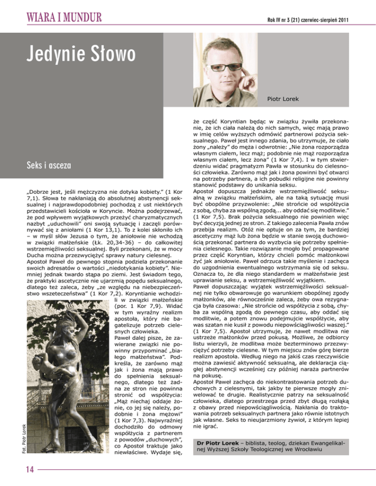 Rok IV nr 3 (21) czerwiec-sierpień 2011 Jedynie Słowo Piotr Lorek Fot. Piotr Lorek Seks i asceza „Dobrze jest, jeśli mężczyzna nie dotyka kobiety.” (1 Kor 7,1). Słowa te nakłaniają do absolutnej abstynencji seksualnej i najprawdopodobniej pochodzą z ust niektórych przedstawicieli kościoła w Koryncie. Można podejrzewać, że pod wpływem wyjątkowych przeżyć charyzmatycznych nazbyt „uduchowili” oni swoją sytuację i zaczęli porównywać się z aniołami (1 Kor 13,1). To z kolei skłoniło ich – w myśl słów Jezusa o tym, że aniołowie nie wchodzą w związki małżeńskie (Łk. 20,34-36) – do całkowitej wstrzemięźliwości seksualnej. Byli przekonani, że w mocy Ducha można przezwyciężyć sprawy natury cielesnej. Apostoł Paweł do pewnego stopnia podziela przekonanie swoich adresatów o wartości „niedotykania kobiety”. Niemniej jednak twardo stąpa po ziemi. Jest świadom tego, że praktyki ascetycznie nie ujarzmią popędu seksualnego, dlatego też zaleca, żeby „ze względu na niebezpieczeństwo wszeteczeństwa” (1 Kor 7,2). Koryntianie wchodzili w związki małżeńskie (por. 1 Kor 7,9). Widać w tym wyraźny realizm apostoła, który nie bagatelizuje potrzeb cielesnych człowieka. Paweł dalej pisze, że zawierane związki nie powinny przypominać „białego małżeństwa”. Podkreśla, że zarówno mąż jak i żona mają prawo do spełnienia seksualnego, dlatego też żadna ze stron nie powinna stronić od współżycia: „Mąż niechaj oddaje żonie, co jej się należy, podobnie i żona mężowi” (1 Kor 7,3). Najwyraźniej dochodziło do odmowy współżycia z partnerem z powodów „duchowych”, co Apostoł traktuje jako niewłaściwe. Wydaje się, 14 że część Koryntian będąc w związku żywiła przekonanie, że ich ciała należą do nich samych, więc mają prawo w imię celów wyższych odmówić partnerowi pożycia seksualnego. Paweł jest innego zdania, bo utrzymuje, że ciało żony „należy” do męża i odwrotnie: „Nie żona rozporządza własnym ciałem, lecz mąż; podobnie nie mąż rozporządza własnym ciałem, lecz żona” (1 Kor 7,4). I w tym stwierdzeniu widać pragmatyzm Pawła w stosunku do cielesności człowieka. Zarówno mąż jak i żona powinni być otwarci na potrzeby partnera, a ich pobudki religijne nie powinny stanowić podstawy do unikania seksu. Apostoł dopuszcza jednakże wstrzemięźliwość seksualną w związku małżeńskim, ale na taką sytuację musi być obopólne przyzwolenie: „Nie strońcie od współżycia z sobą, chyba za wspólną zgodą... aby oddać się modlitwie.” (1 Kor 7,5). Brak pożycia seksualnego nie powinien więc być decyzją jednej ze stron. Z takiego zalecenia Pawła znów przebija realizm. Otóż nie optuje on za tym, że bardziej ascetyczny mąż lub żona będzie w stanie swoją duchowością przekonać partnera do wyzbycia się potrzeby spełnienia cielesnego. Takie rozwiązanie mogło być propagowane przez część Koryntian, którzy chcieli pomóc małżonkowi żyć jak aniołowie. Paweł odrzuca takie myślenie i zachęca do uzgodnienia ewentualnego wstrzymania się od seksu. Oznacza to, że dla niego standardem w małżeństwie jest uprawianie seksu, a wstrzemięźliwość wyjątkiem. Paweł dopuszczając wyjątek wstrzemięźliwości seksualnej nie tylko obwarowuje go warunkiem obopólnej zgody małżonków, ale równocześnie zaleca, żeby owa rezygnacja była czasowa: „Nie strońcie od współżycia z sobą, chyba za wspólną zgodą do pewnego czasu, aby oddać się modlitwie, a potem znowu podejmujcie współżycie, aby was szatan nie kusił z powodu niepowściągliwości waszej.” (1 Kor 7,5). Apostoł utrzymuje, że nawet modlitwa nie ustrzeże małżonków przed pokusą. Możliwe, że odbiorcy listu wierzyli, że modlitwa może bezterminowo przezwyciężyć potrzeby cielesne. W tym miejscu znów górę bierze realizm apostoła. Według niego na jakiś czas rzeczywiście można zawiesić aktywność seksualną, ale deklaracja ciągłej abstynencji wcześniej czy później naraża partnerów na pokusę. Apostoł Paweł zachęca do niekontrastowania potrzeb duchowych z cielesnymi, tak jakby te pierwsze mogły zniwelować te drugie. Realistycznie patrzy na seksualność człowieka, dlatego przestrzega przed zbyt długą rozłąką z obawy przed niepowściągliwością. Nakłania do traktowania potrzeb seksualnych partnera jako równie istotnych jak własne. Seks to nieujarzmiony żywioł, z którym lepiej nie igrać. Dr Piotr Lorek – biblista, teolog, dziekan Ewangelikalnej Wyższej Szkoły Teologicznej we Wrocławiu