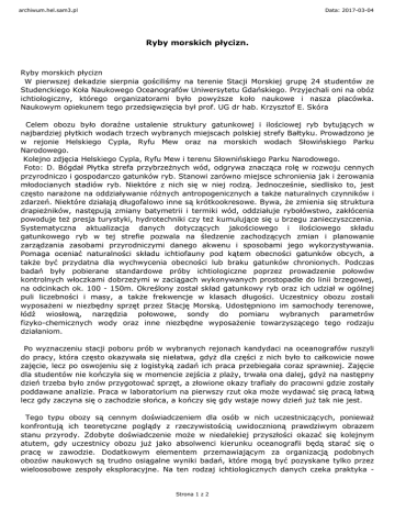 archiwum.hel.sam3.pl Data: 2017-03-04 Ryby morskich płycizn. Ryby morskich płycizn W pierwszej dekadzie sierpnia gościliśmy na terenie Stacji Morskiej grupę 24 studentów ze Studenckiego Koła Naukowego Oceanografów Uniwersytetu Gdańskiego. Przyjechali oni na obóz ichtiologiczny, którego organizatorami było powyższe koło naukowe i nasza placówka. Naukowym opiekunem tego przedsięwzięcia był prof. UG dr hab. Krzysztof E. Skóra Celem obozu było doraźne ustalenie struktury gatunkowej i ilościowej ryb bytujących w najbardziej płytkich wodach trzech wybranych miejscach polskiej strefy Bałtyku. Prowadzono je w rejonie Helskiego Cypla, Ryfu Mew oraz na morskich wodach Słowińskiego Parku Narodowego. Kolejno zdjęcia Helskiego Cypla, Ryfu Mew i terenu Słownińskiego Parku Narodowego. Foto: D. Bógdał Płytka strefa przybrzeżnych wód, odgrywa znacząca rolę w rozwoju cennych przyrodniczo i gospodarczo gatunków ryb. Stanowi zarówno miejsce schronienia jak i żerowania młodocianych stadiów ryb. Niektóre z nich się w niej rodzą. Jednocześnie, siedlisko to, jest często narażone na oddziaływanie różnych antropogenicznych a także naturalnych czynników i zdarzeń. Niektóre działają długofalowo inne są krótkookresowe. Bywa, że zmienia się struktura drapieżników, następują zmiany batymetrii i termiki wód, oddziałuje rybołówstwo, zakłócenia powoduje też presja turystyki, hydrotechniki czy też kumulujące się u brzegu zanieczyszczenia. Systematyczna aktualizacja danych dotyczących jakościowego i ilościowego składu gatunkowego ryb w tej strefie pozwala na śledzenie zachodzących zmian i planowanie zarządzania zasobami przyrodniczymi danego akwenu i sposobami jego wykorzystywania. Pomaga oceniać naturalności składu ichtiofauny pod kątem obecności gatunków obcych, a także być przydatna dla wychwycenia obecności lub braku gatunków chronionych. Podczas badań były pobierane standardowe próby ichtiologiczne poprzez prowadzenie połowów kontrolnych włoczkami dobrzeżymi w zaciągach wykonywanych prostopadle do linii brzegowej, na odcinkach ok. 100 - 150m. Określony został skład gatunkowy ryb oraz ich udział w ogólnej puli liczebności i masy, a także frekwencje w klasach długości. Uczestnicy obozu zostali wyposażeni w niezbędny sprzęt przez Stację Morską. Udostępniono im samochody terenowe, łódź wiosłową, narzędzia połowowe, sondy do pomiaru wybranych parametrów fizyko-chemicznych wody oraz inne niezbędne wyposażenie towarzyszącego tego rodzaju działaniom. Po wyznaczeniu stacji poboru prób w wybranych rejonach kandydaci na oceanografów ruszyli do pracy, która często okazywała się niełatwa, gdyż dla części z nich było to całkowicie nowe zajęcie, lecz po oswojeniu się z logistyką zadań ich praca przebiegała coraz sprawniej. Zajęcie dla studentów nie kończyła się w momencie zejścia z plaży, trwała ona dalej, gdyż na następny dzień trzeba było znów przygotować sprzęt, a złowione okazy trafiały do pracowni gdzie zostały poddawane analizie. Praca w laboratorium na pierwszy rzut oka może wydawać się pracą łatwą lecz gdy zaczyna się o zachodzie słońca, a kończy się gdy wstaje nowy dzień już tak nie jest. Tego typu obozy są cennym doświadczeniem dla osób w nich uczestniczących, ponieważ konfrontują ich teoretyczne poglądy z rzeczywistością uwidocznioną prawdziwym obrazem stanu przyrody. Zdobyte doświadczenie może w niedalekiej przyszłości okazać się kolejnym atutem, gdy uczestnicy obozu już jako absolwenci kierunku oceanografii będą starać się o pracę w zawodzie. Dodatkowym elementem przemawiającym za organizacją podobnych obozów naukowych są trudno osiągalne wyniki badań, które mogą być pozyskane tylko przez wieloosobowe zespoły eksploracyjne. Na ten rodzaj ichtiologicznych danych czeka praktyka - Strona 1 z 2 archiwum.hel.sam3.pl Data: 2017-03-04 Ryby morskich płycizn. instytucje zarządzające rybołówstwem i ochronną przyrody. Ernest Muża Obejrzyj galerię zdjęć: http://www.hel.ug.edu.pl/aktu/lastminut/ryby_morskich_plycizn.htm 10 - 09 - 2011 Marek Dykta Urz±d Miasta Helu redaktor Strona 2 z 2 Źródło: